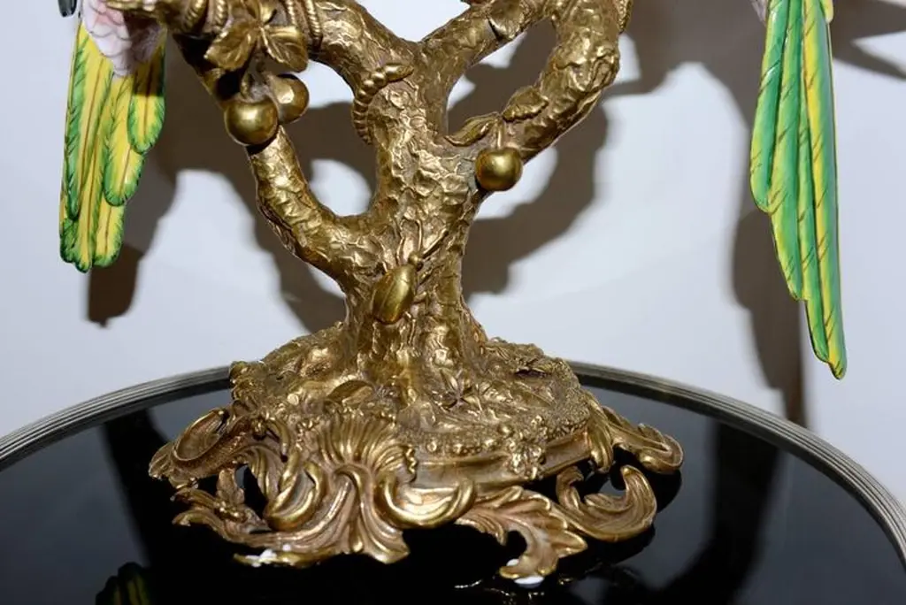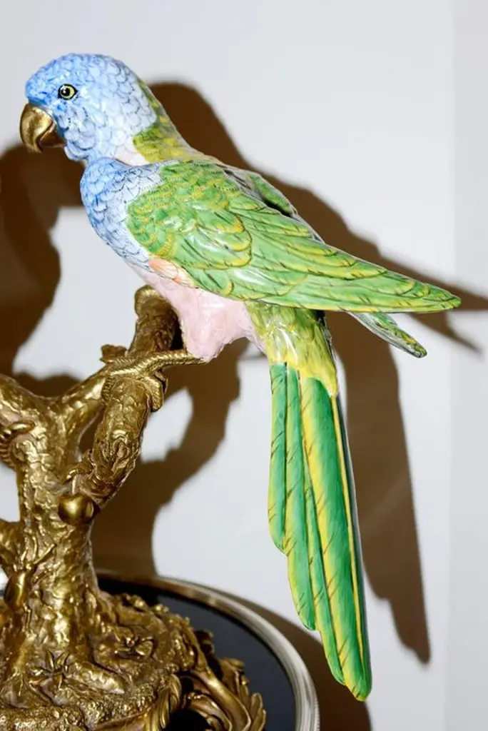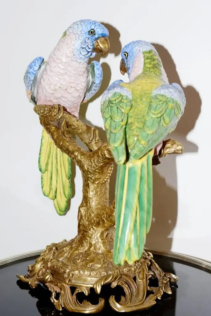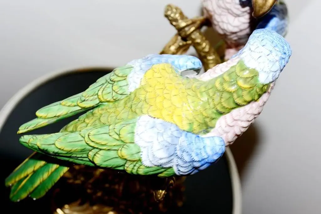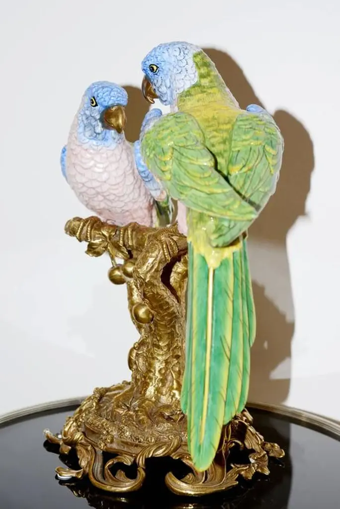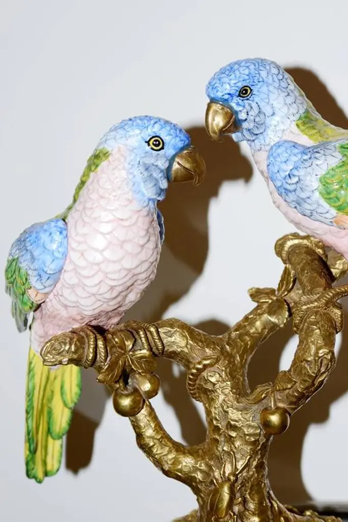 Sculpture parrot couple made in solid porcelain, hand-painted finish, on solid bronze and porcelain base.