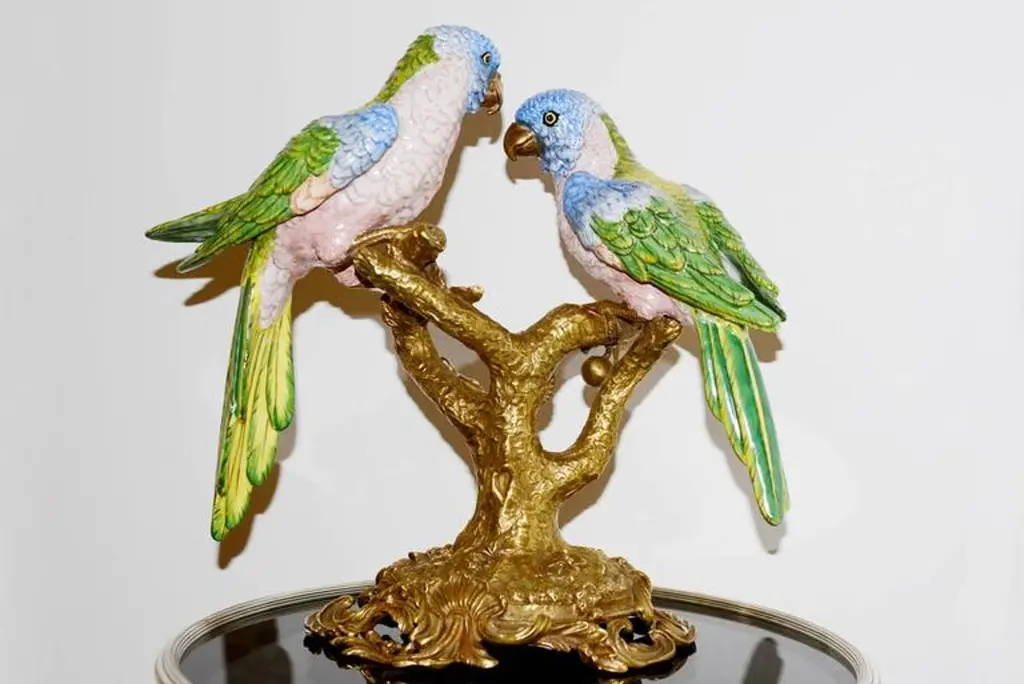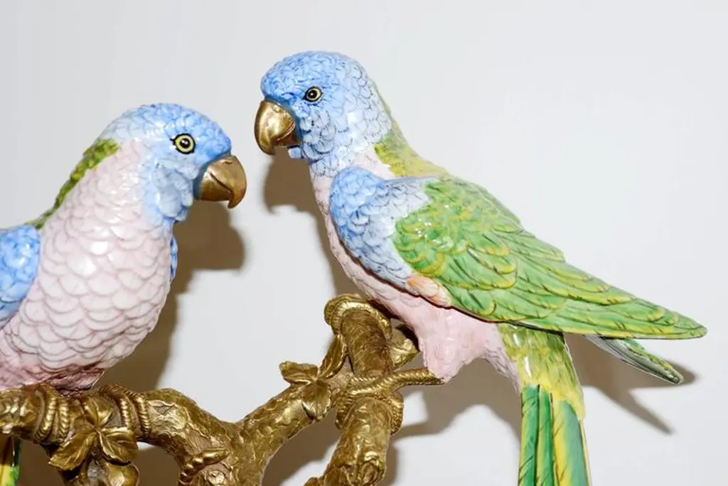Parrot Couple Sculpture In Solid Porcelain Hand-Painted Finish And Solid Bronze