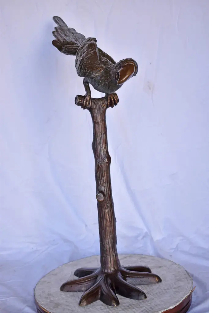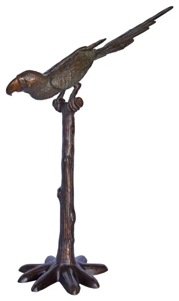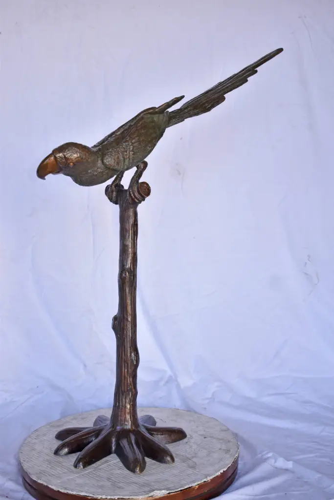 A life-size parrot made of bronzed metal perched on a tree trunk with bronze patina finish. This extraordinary sculpture is cast in the traditional lost-wax method, features a realistic tree trunk that supports a parrot rendered in life-size detail. The parrot is shown with marvelous detail to the feathers, beaks and eyes with a unique expression and pose. This impressive Bronze Statue will be a permanent fixture on the grounds of your estate for years to come. Size: 37"L x 15"W x 47"H. Weight is: 25Lb