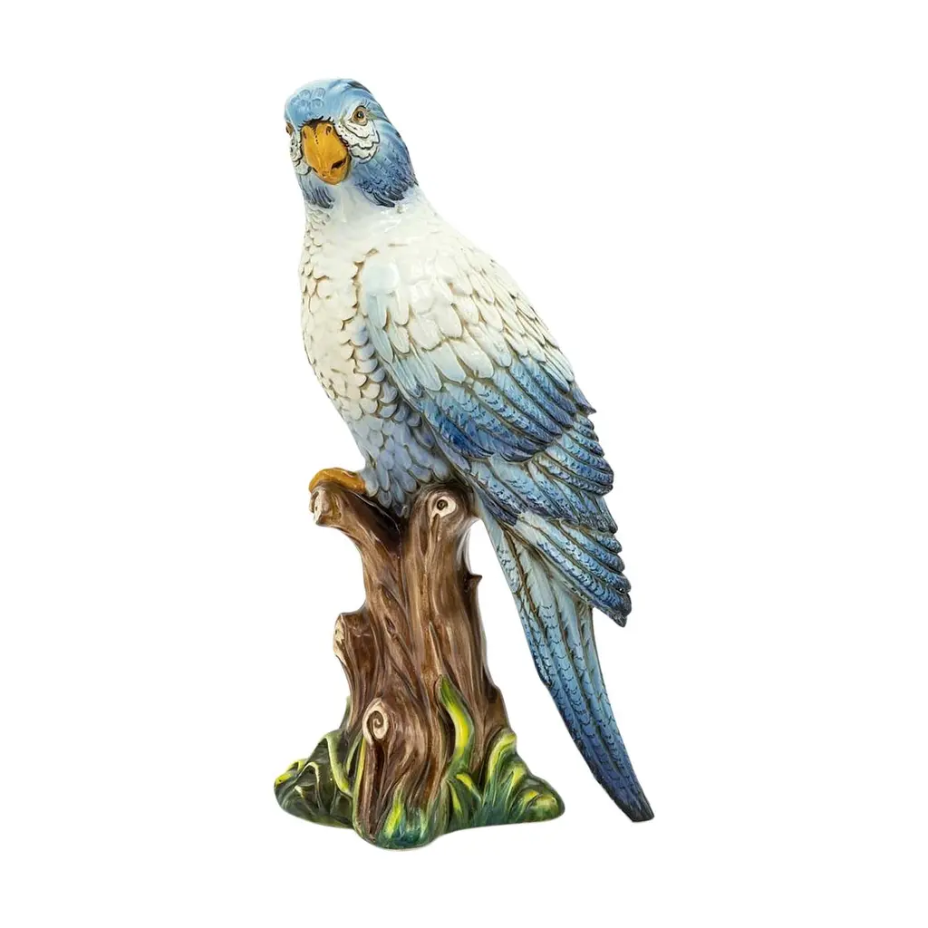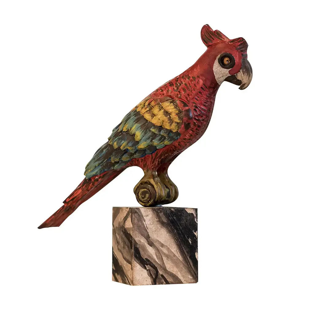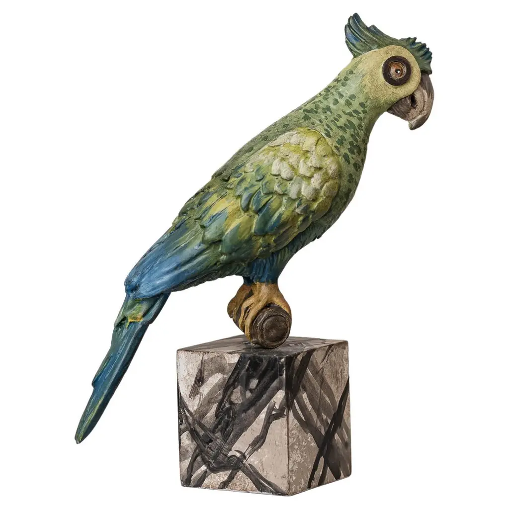 A life-size parrot made of bronzed metal perched on a tree trunk with bronze patina finish. This extraordinary sculpture is cast in the traditional lost-wax method, features a realistic tree trunk that supports a parrot rendered in life-size detail. The parrot is shown with marvelous detail to the feathers, beaks and eyes with a unique expression and pose. This impressive Bronze Statue will be a permanent fixture on the grounds of your estate for years to come. Size: 36"L x 15"W x 41"H. Weight is: 32Lb