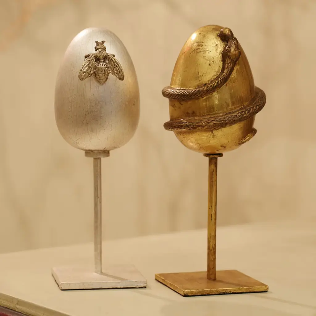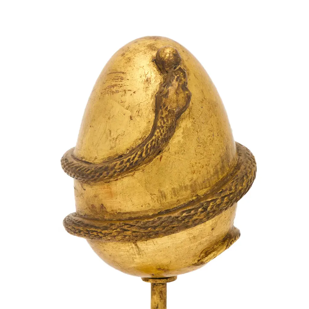 This sculptured egg of gleaming resin in a gold-leaf finish, wrapped in the coils of a serpent upon a slender plinth of hand lacquered iron, represents rebirth. The piece is the last in a sequence of five ornamental lucky charms by Bottiglieri.