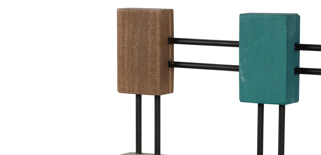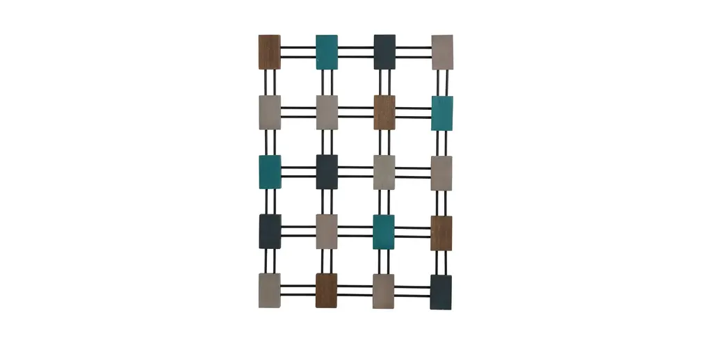 This eye-catching iron and wood wall art delivers a unique look with a retro-modern vibe; all wood elements are connected by a graphic iron grid. Choose from either multicolored or natural wood wall sculpture blocks—or hang both sculptures for a contrasting look. Then, hang this mango wood and metal wall art above a sofa, bed, or mantel to add dimension, visual interest, and an artful touch to any room.