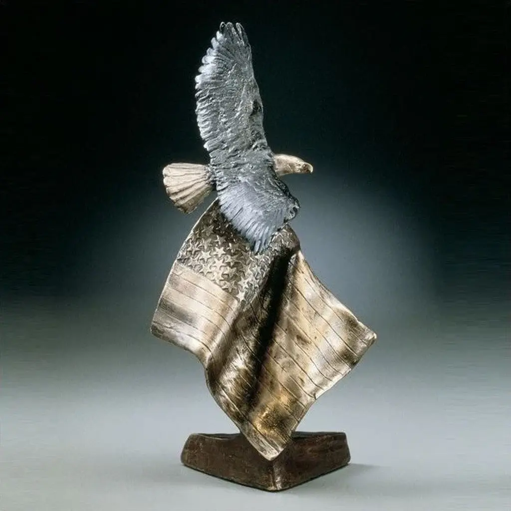 This amazing bronze eagle and flag sculpture by artist Mark Hopkins, "Patriot''s Dream," conveys the strength and independence of our nation in breathtaking nature-inspired style. A living symbol of our country''s strength and grace is pictured soaring above a battle-worn American flag in stunning detail and a unique blend of rustic and contemporary natural and metallic shades. It''s a heartwarming vision of faith and loyalty sure to thrill any patriot with a passion for the beauty of nature''s own forms, and makes an extremely special and collectible gift. "Patriot''s Dream" is handcrafted with pride right here in the USA, and is limited to a production run of 950. Internationally renowned American artist Mark Hopkins creates bronze sculptures that have thrilled collectors and casual art fans alike for more than two decades. Mark Hopkins'' unique balance of organic inspiration and singular contemporary design has been called "bronze in motion" for its fluid look, which often appears to display natural beauty in defiance of gravity. About Mark HopkinsMark Hopkins takes his inspiration for every facet of life on Earth, from the majesty of wildlife to mankind''s interaction with nature, and produces limited-edition pieces that evoke a sense of awe and respect for the mysteries and loveliness of the world around us. Collectors of his work include Barbara Mandrell, Clint Eastwood, Bill Clinton, Colin Powell, George and Barbara Bush and a host of other luminaries and corporations including the National League Association of Baseball Club Owners, the Atlanta National Golf Club, Humana, Coca-Cola and others. Each Mark Hopkins sculpture is crafted with pride in the USA. Captivated by form and design, Mark has personally created a signature style of vibrant vitality resulting from decades of study. Encouraged by parents and teachers from an early age, Mark''s unique talent developed alongside his technical skills of sculpting and casting. As an artist, Mark is constantly challenging himself to render the rich beauty of life and the deep emotion of the human soul into flowing sculptural form, noting "I strive to express beyond the image, to catch spirit, to reveal deeper emotions, and to share joy. "About the Production ProcessFrom the artist''s hand to the final polishing stages, many intricate steps go into the creation of a limited edition bronze sculpture. First the reproduction mold is made in which layers of silicone rubber and plaster are delicately applied to the original work. Then hot wax is poured into the reproduction mold to form an exact replica of the original sculpture. When the wax replica is removed from the mold, it is then inspected and refined or "chased" by hand to remove any imperfections that may have occurred in the reproduction process. Next, ceramic cup and wax sprues, or gates, are added which later will help channel the molten bronze into the shell to create the sculpture. The next step is creating the ceramic shell by alternately dipping the wax replica over a period of several days into a vat of liquid slurry, then a vat of silica crystals. The shell is then set to dry, and the process repeats until the shell has reached the appropriate thickness and strength. The finished shell is placed in a high temperature oven that melts and removes the wax (the traditional "lost wax" method). The hardened or "fired" shell is secured, so the molten bronze can now be poured into the wax impression.