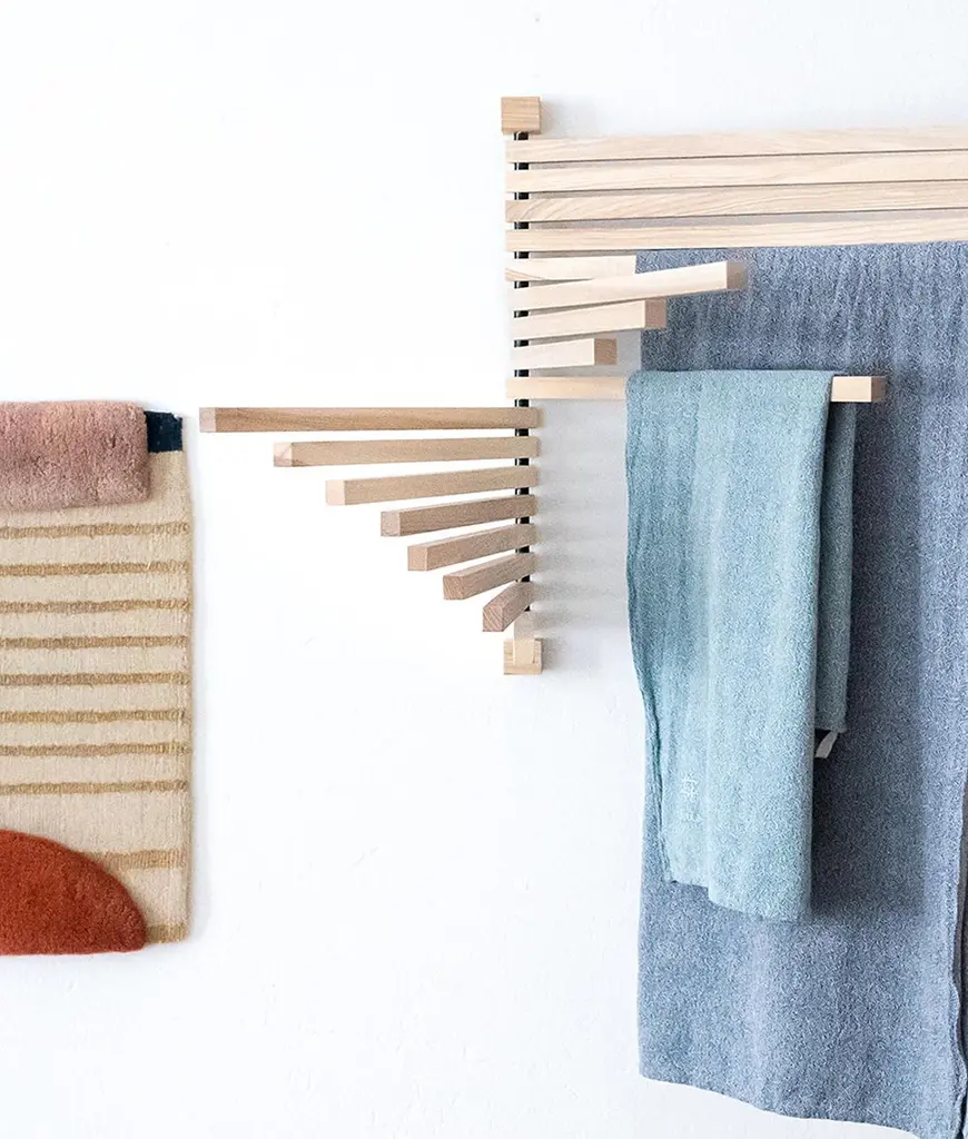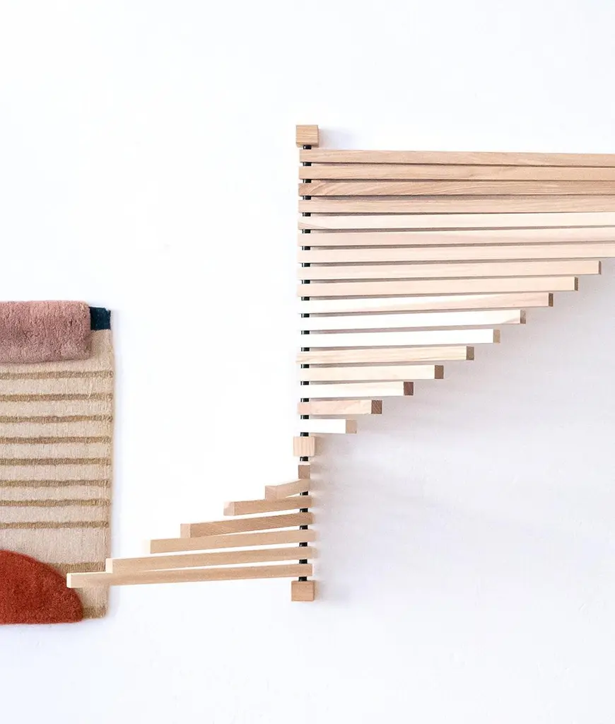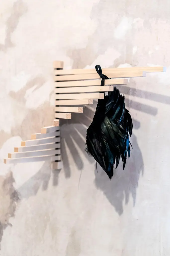Pavo Grande and Pavolino Wall Hanging Rack by Frau CazeDimensions: D 2 x W 74 x H 80 cm.Materials: Natual ash.Available in different dimensions. Please contact us.When a household item and sculpture become one – an object that can be modified day by day, which lives and designs your space.Inspired by the layered feathers of a Peacock’s tail, Pavo elegantly extends its arms from a single plane to many directions.You can hang many different things from these surprisingly sturdy arms – the essential function of this design object.Since a Pavo doesn’t travel alone, two siblings can be found nearby. Their varying sizes meet the needs of different occasions: PAVO GRANDE, PAVO TEEN, PAVO MEDIO and the runt of the litter, PAVOLINO.Although Berlin has been her home for many years, Carolin – the designer behind Frau Caze, with “Caze” being a fusion of her first and last name – has never been one to stand still. She has traveled the world relentlessly in search of inspiration for her work. These travels have greatly influenced her unique sense of atmosphere and texture, as well as her concern for our planet – Frau Caze places a great emphasis on sustainability, quality, and functionality.Currently, Carolin splits her time between Berlin and Lake Constance, and has devoted herself to furniture and interior design ever since studying design at the FH Potsdam and the Escola Superior de Desenho Industrial in Rio de Janeiro until 2012. Founding Frau Caze in 2016, her work pays tribute to her love of natural, high-quality materials as well as sustainable, responsible craftsmanship – including ethical treatment of all people involved in production.