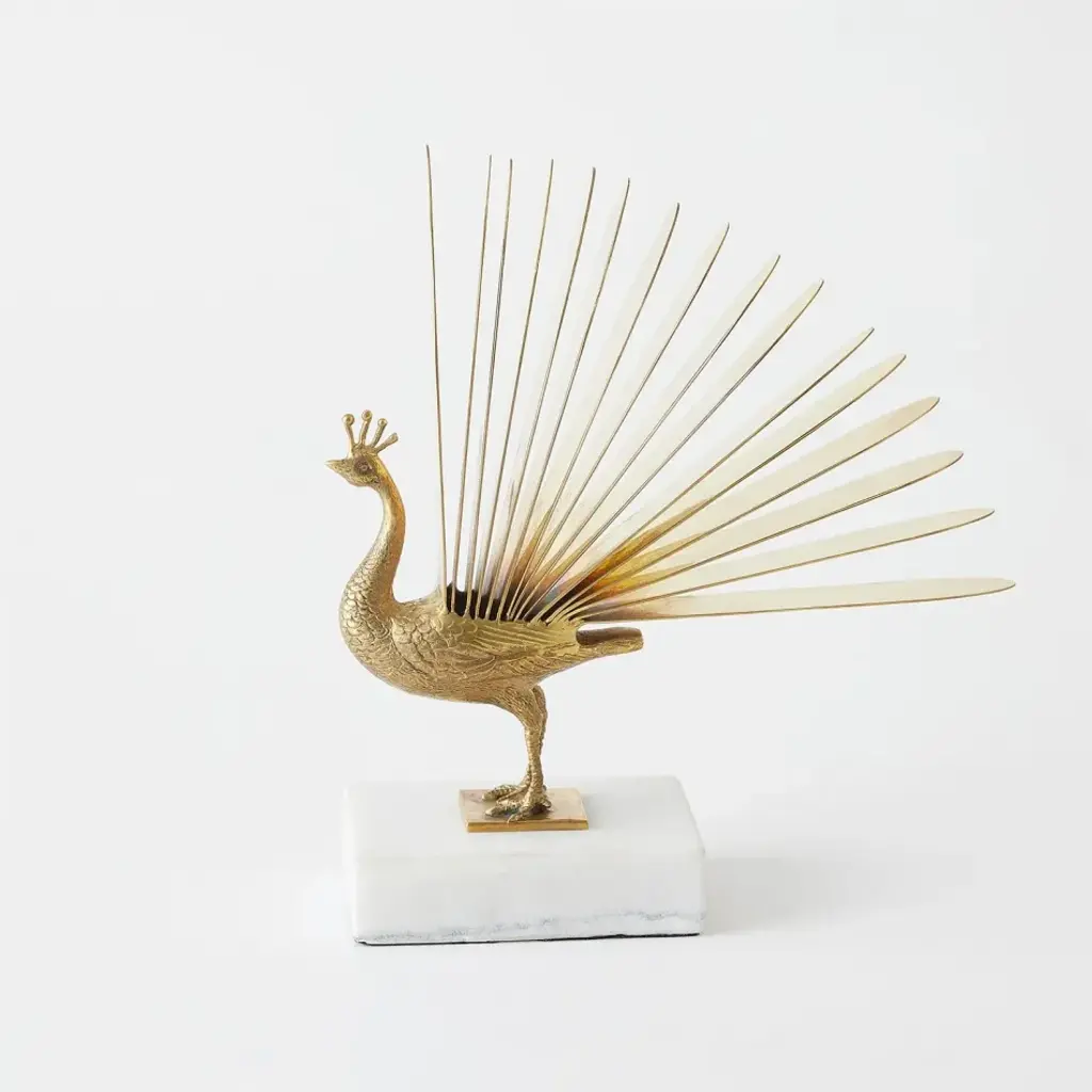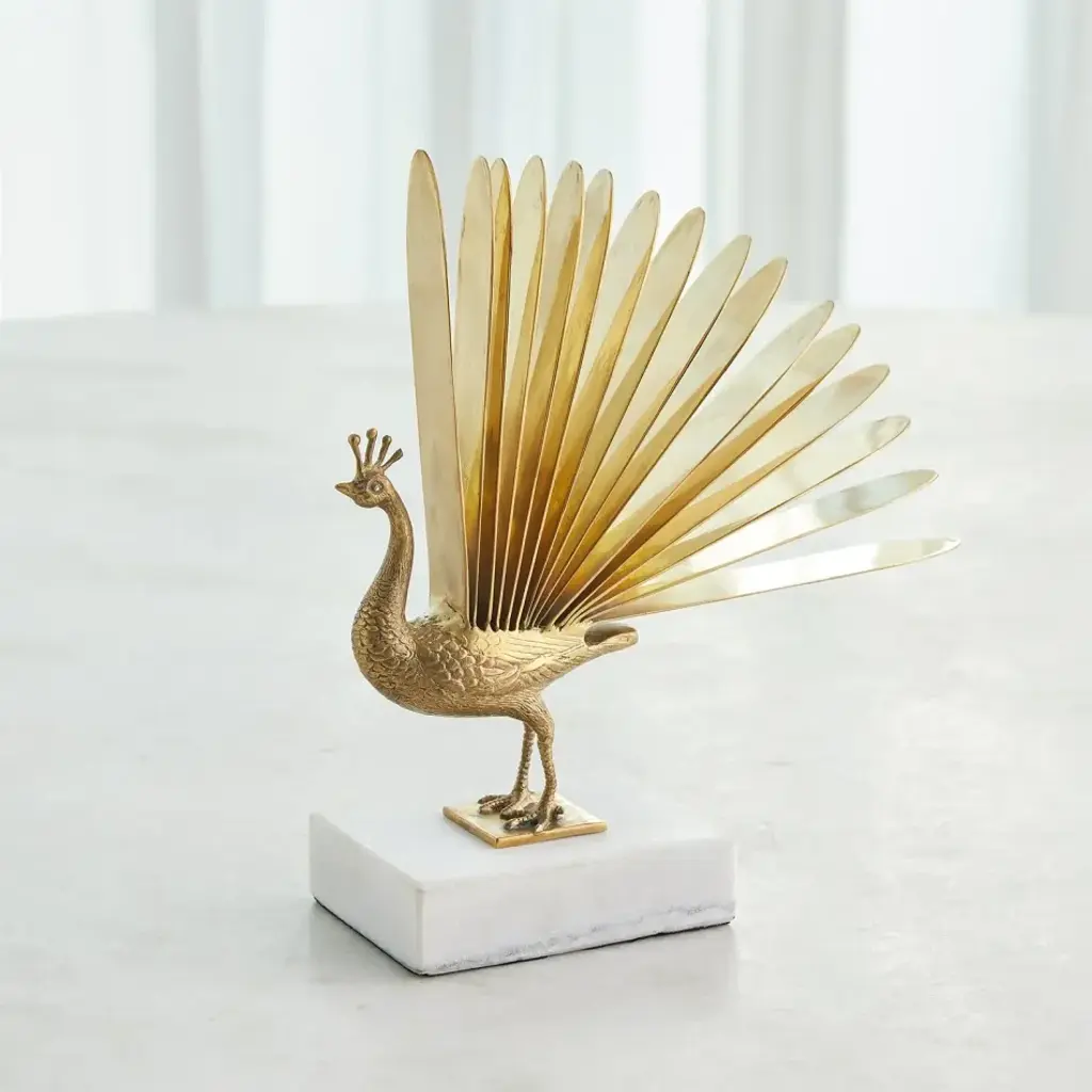 Inspired by the cover of Liars Dictionary by Eley Williams, the Pavona Sculpture features a brass bird perched on a white marble base, with peacock feathers transforming into pages of a book. This elegant design merges nature and storytelling, creating a striking statement piece for any space. From a fashion forward perspective, Global Views offers accessories, furniture, statement lighting, and an assortment of rugs and mirrors to add beauty and joy to your home.