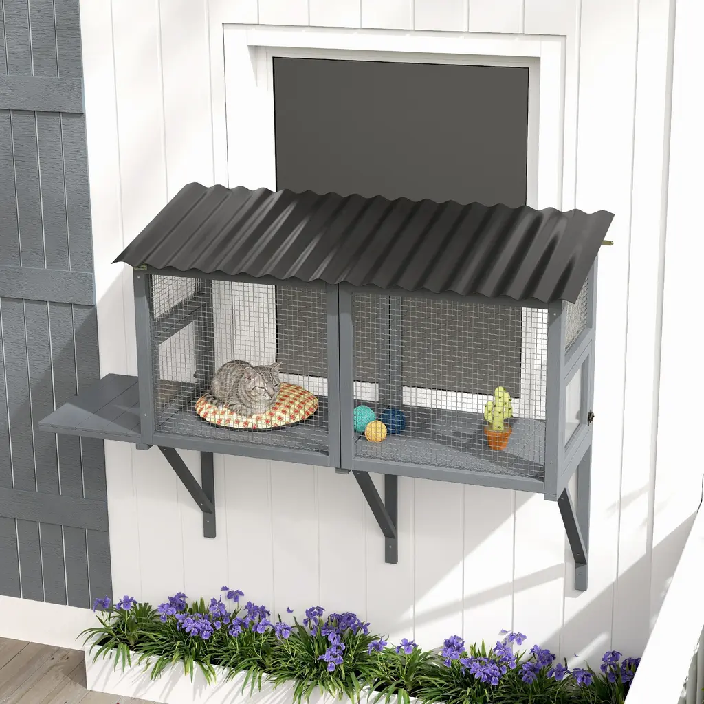Descriptions:Discover the PawHut Catio, a spacious and stylish outdoor cat enclosure designed to give your feline friends a taste of the wild - safely and comfortably. With expansive mesh windows, this large catio allows your cats to bask in the sunshine, enjoy fresh air, and observe nature without exposure to outdoor dangers. Crafted from solid fir wood and reinforced with galvanized steel mesh, it ensures durability and security, making it a great backyard retreat for your adventurous cats.Features:● Expanding windows enhance interaction with nature for indoor cats● Safety galvanized steel mesh shields cats from external dangers● Includes a jumping platform for active play● Constructed from robust fir wood for longevity● Bottom Triangular brackets ensures stability● Two side doors for easy access inner and clean● Suitable for housing 1-2 cats comfortably, each up to 22 lbs.● Easy assembly and cleaning maintain convenience for ownersSpecification:● Color: Gray● Material: Fir Wood, PVC, Galvanized Steel Mesh● Overall Dimensions: 41.3" W x 19.7" D x 26.8" H● Inner Space: 39.8" L x 18.9" W x 25.6" H● Front Eave Height: 20.9"● Jumping Platform: 11.8" W x 19.7" D● Door Size: 15.7" W x 11.8" H● Mesh Grid: 0.5" L x 0.5" W● Maximum Load: 22 lbs.● Item Label: D32-040V00GY