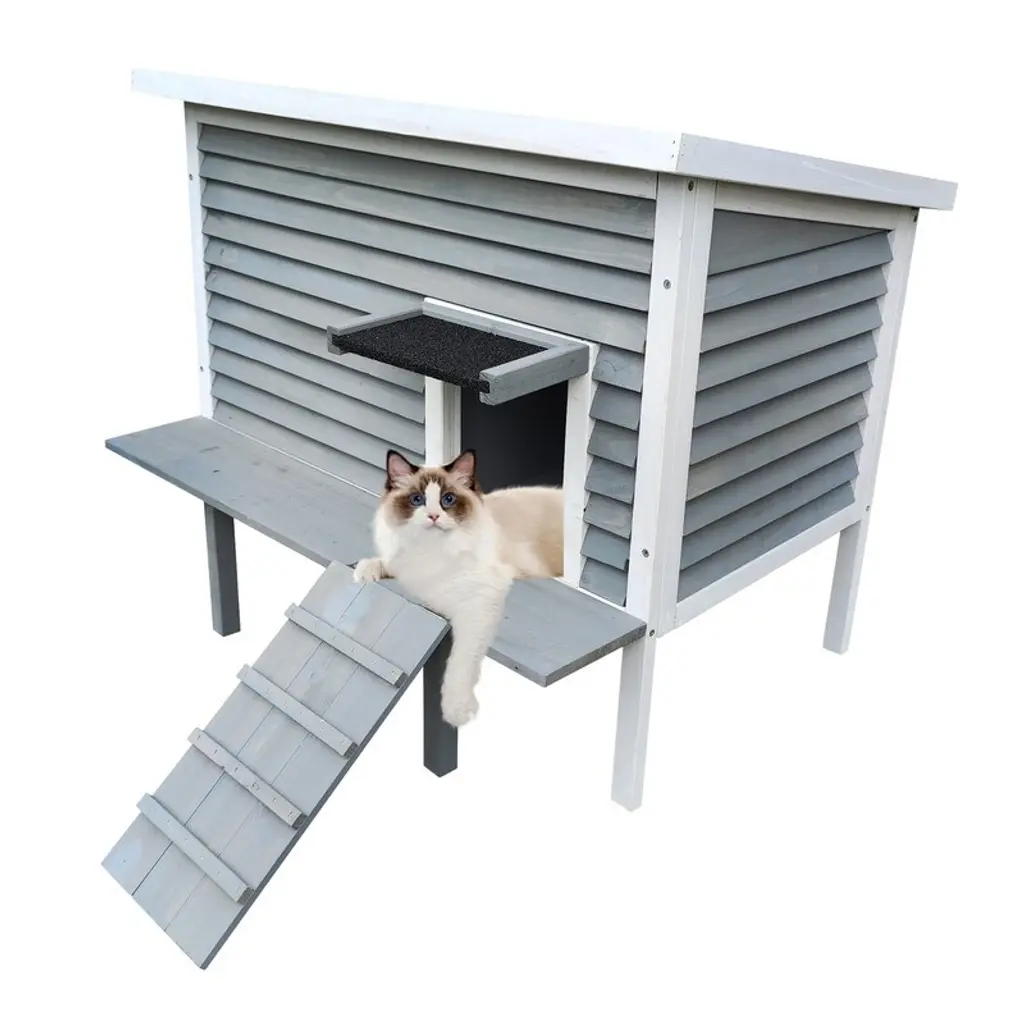 Two-Tier Comfort: This outdoor cat house features a two-tier design with a solid wood upper and a wire mesh lower area. It provides a secure and enjoyable space for your cat to lounge and play.Easy Cleaning: Equipped with a pull-out middle shelf, this feral cat shelter ensures effortless maintenance, keeping your cat's living space clean and comfortable.Multiple Access Points: Equipped with various entrances, plastic curtains, observation windows, and jump platforms, this outside cat house allows easy entry and exploration, keeping your cat entertained and comfortable.Weather-Resistant Haven: Crafted with an asphalt eave, water-resistant paint, and a raised base with foot pads, this outdoor cat condo is designed to withstand the elements, providing a robust shelter for your cat outdoors.Cat House Info: Overall Dimensions: 40.6" L x 20.9" D x 33.5" H. Suitable for 1-2 cats, each under 10 lbs. Assembly required.