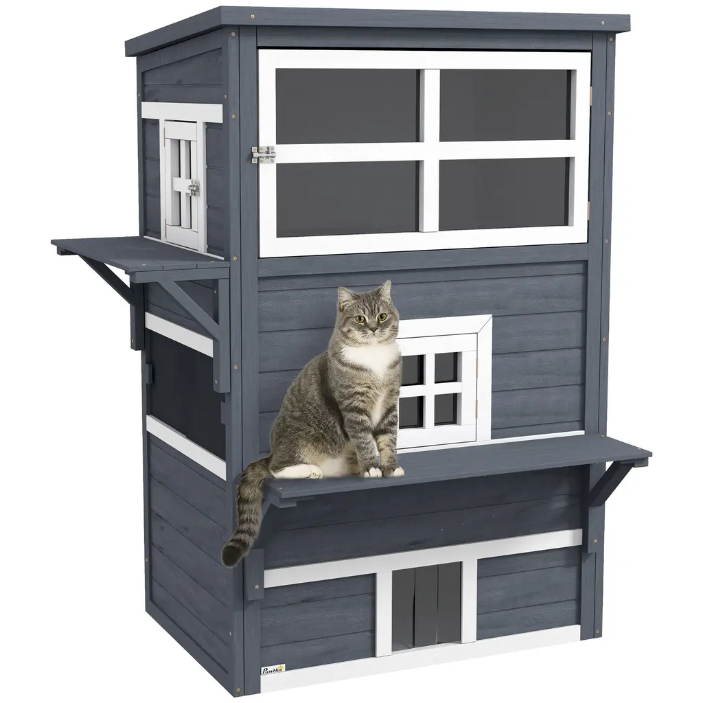 Pawhut Outdoor Cat House, 2 Tier Weatherproof Feral Cat Shelter With Escape Door, Asphalt Roof, Jump Platform - Light Grey - Light Grey