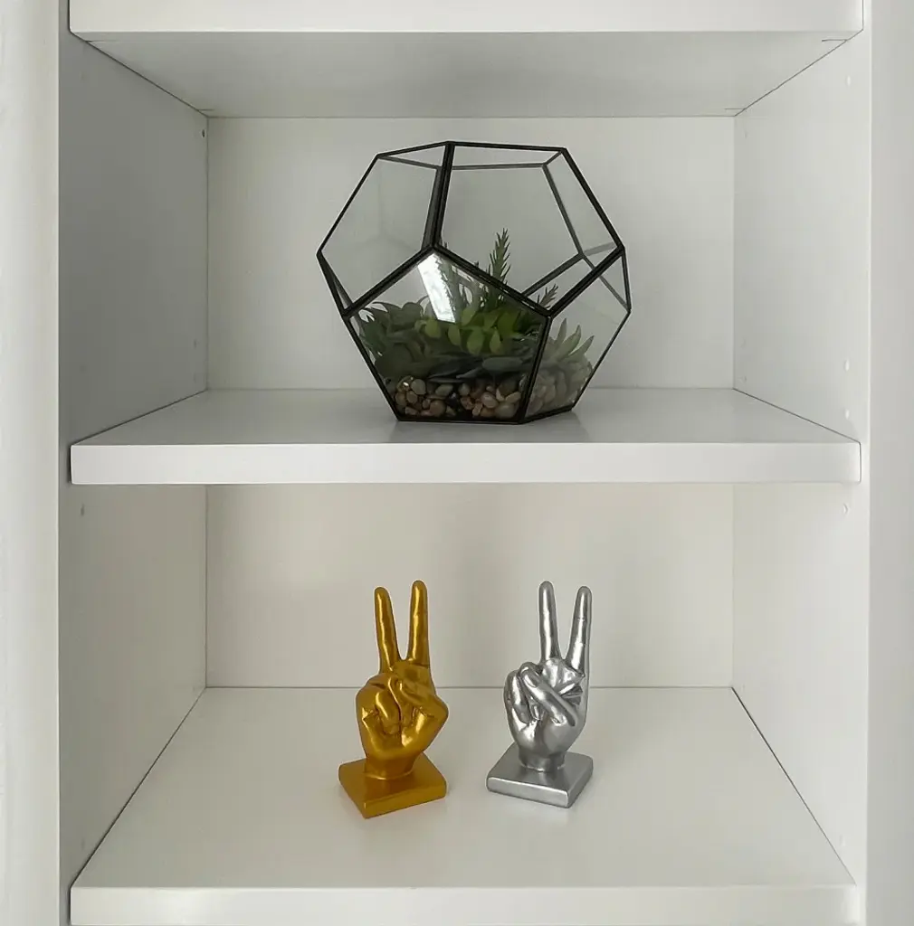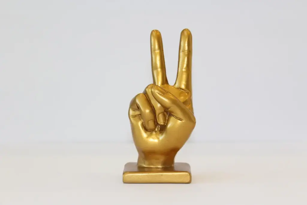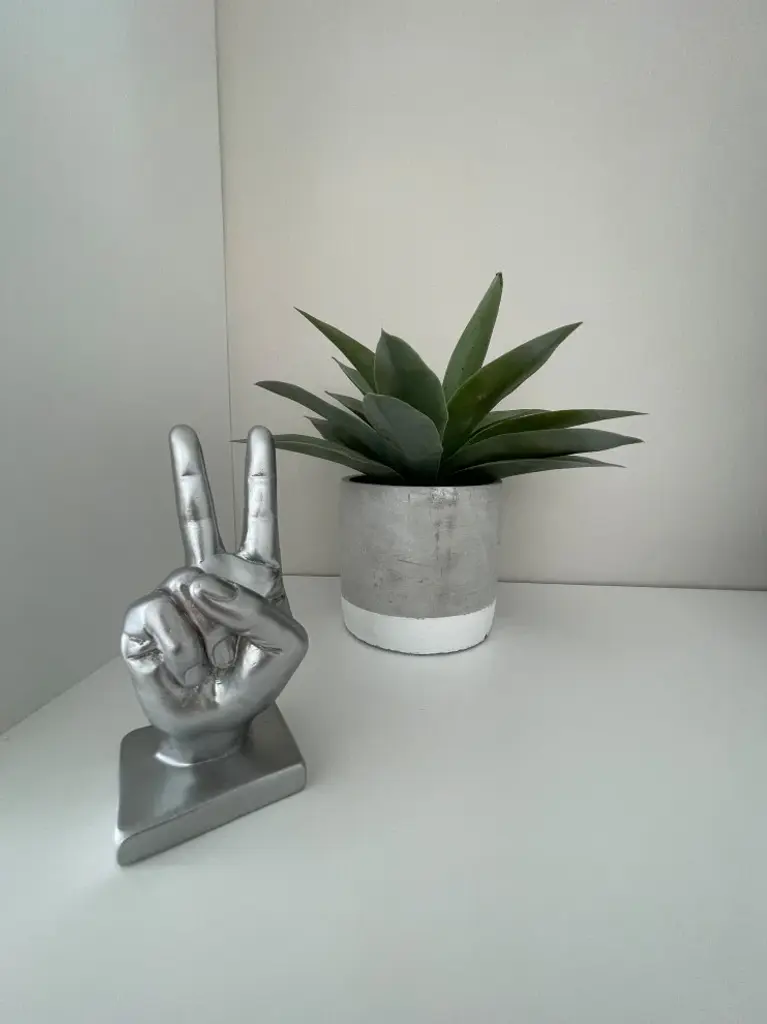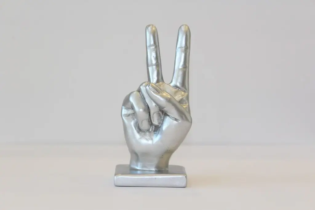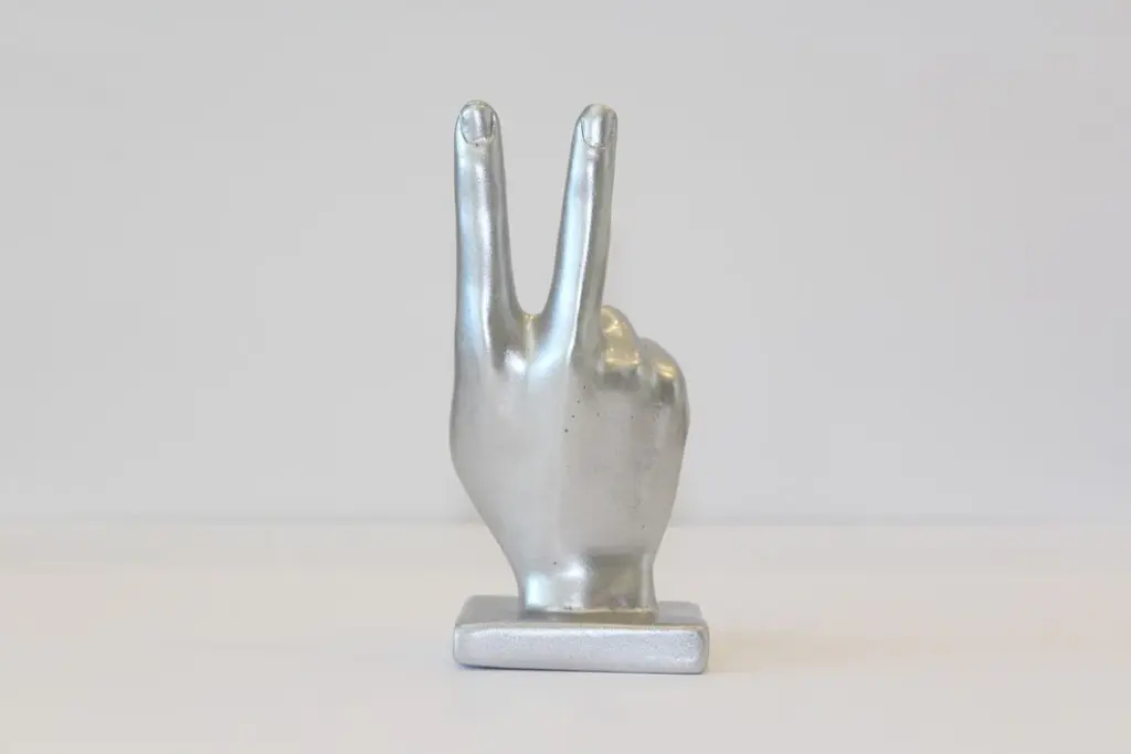 Peace Sign Invite the feeling of Zen to any space with this beautiful Peace Sign hand sculpture, crafted from high-quality resin. Language barriers are nonexistent with the universal sign, which is synonymous with peace, love and harmony. Perfect for your home or office, this conversation piece can be used as a desk and mantle piece or placed anywhere you desire! Features • Available in Silver • Made from Durable, high-quality Resin • Hand Crafted Weights and dimensions • Measure 6 x 3 x3 inches • Weight 1lb