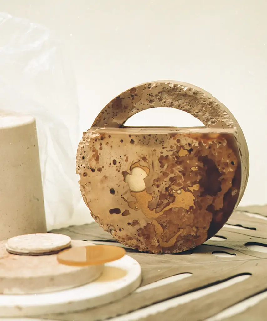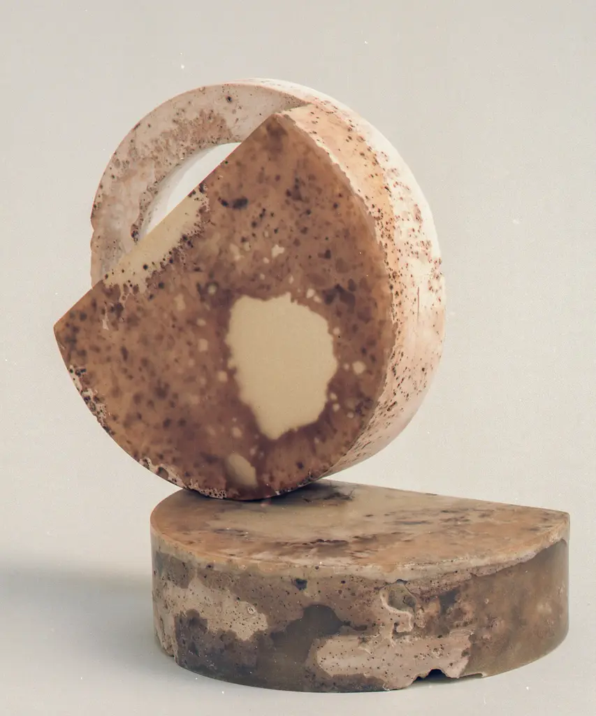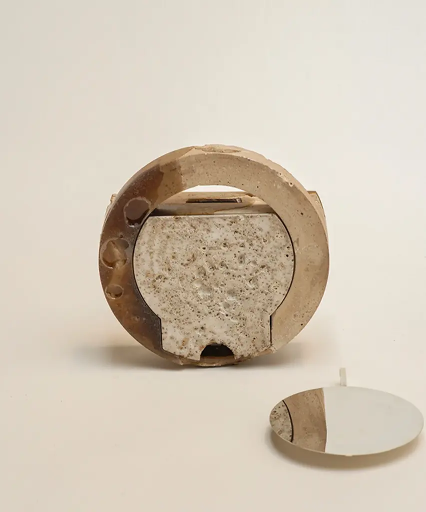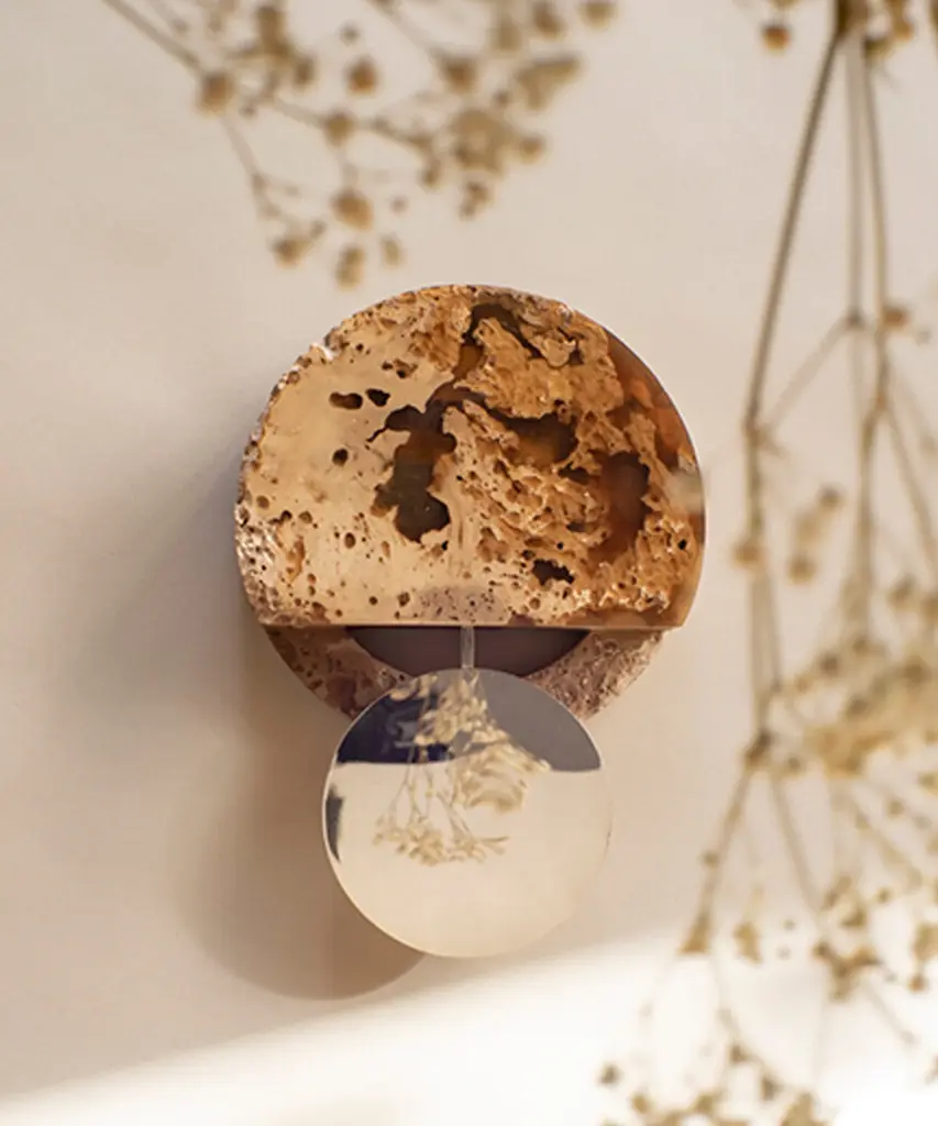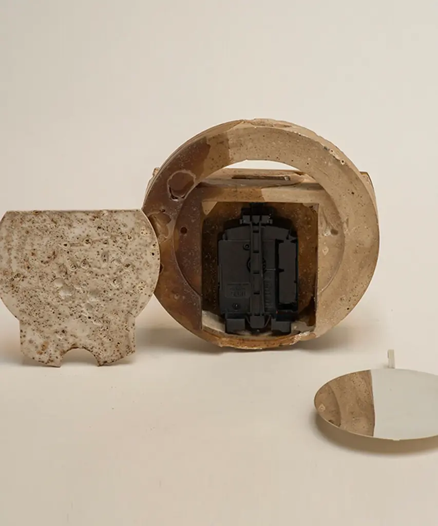 No hours, no minutes, no seconds. The Clock series inform us of the trace of time. Through a slow rotation, Disc Clock places us in an ever-lasting present. These kinetic table sculptures are made by an organic reaction on marble cast carving each piece in unique stone shapes and colors. The subtle disc movement is powered by a 1.5V AAA battery. They are presented on a nickle-plated brass