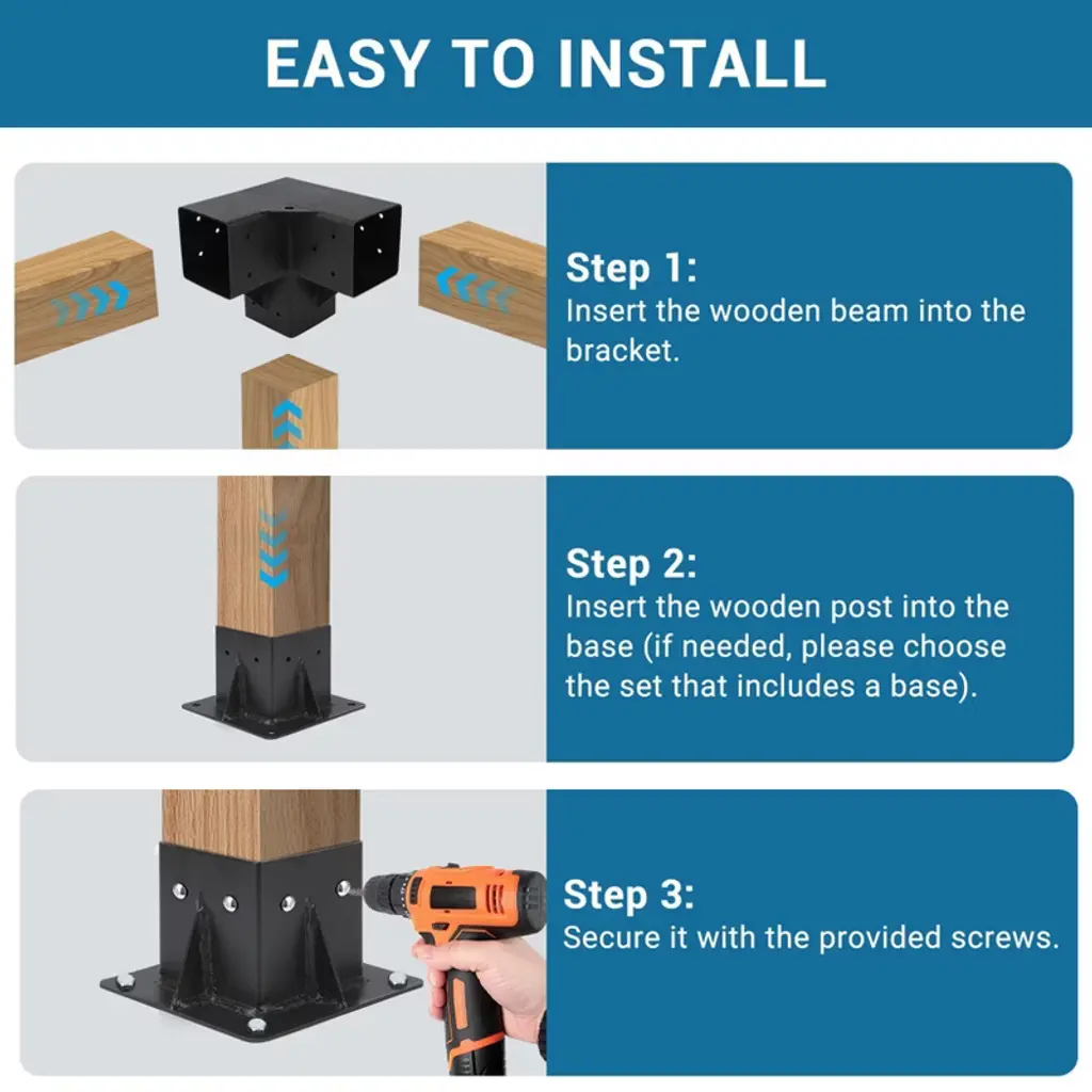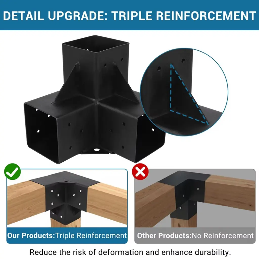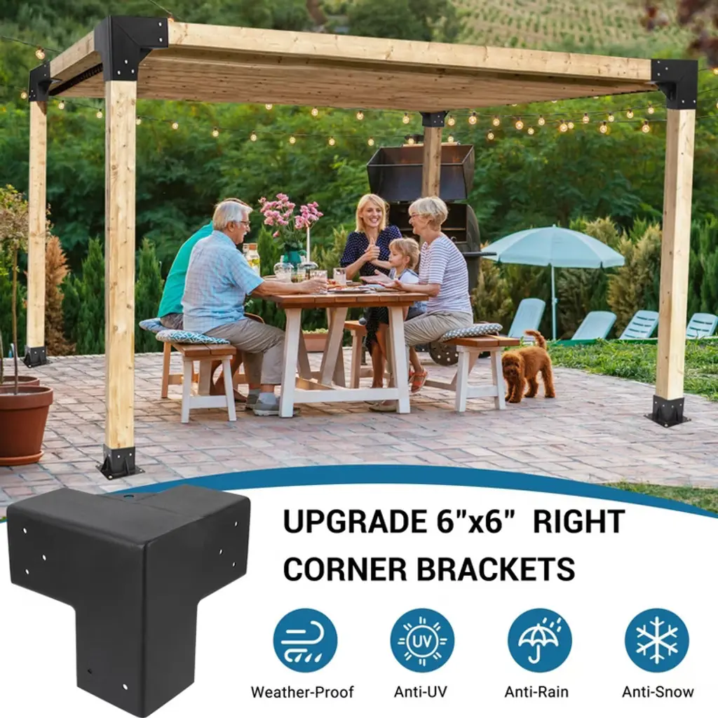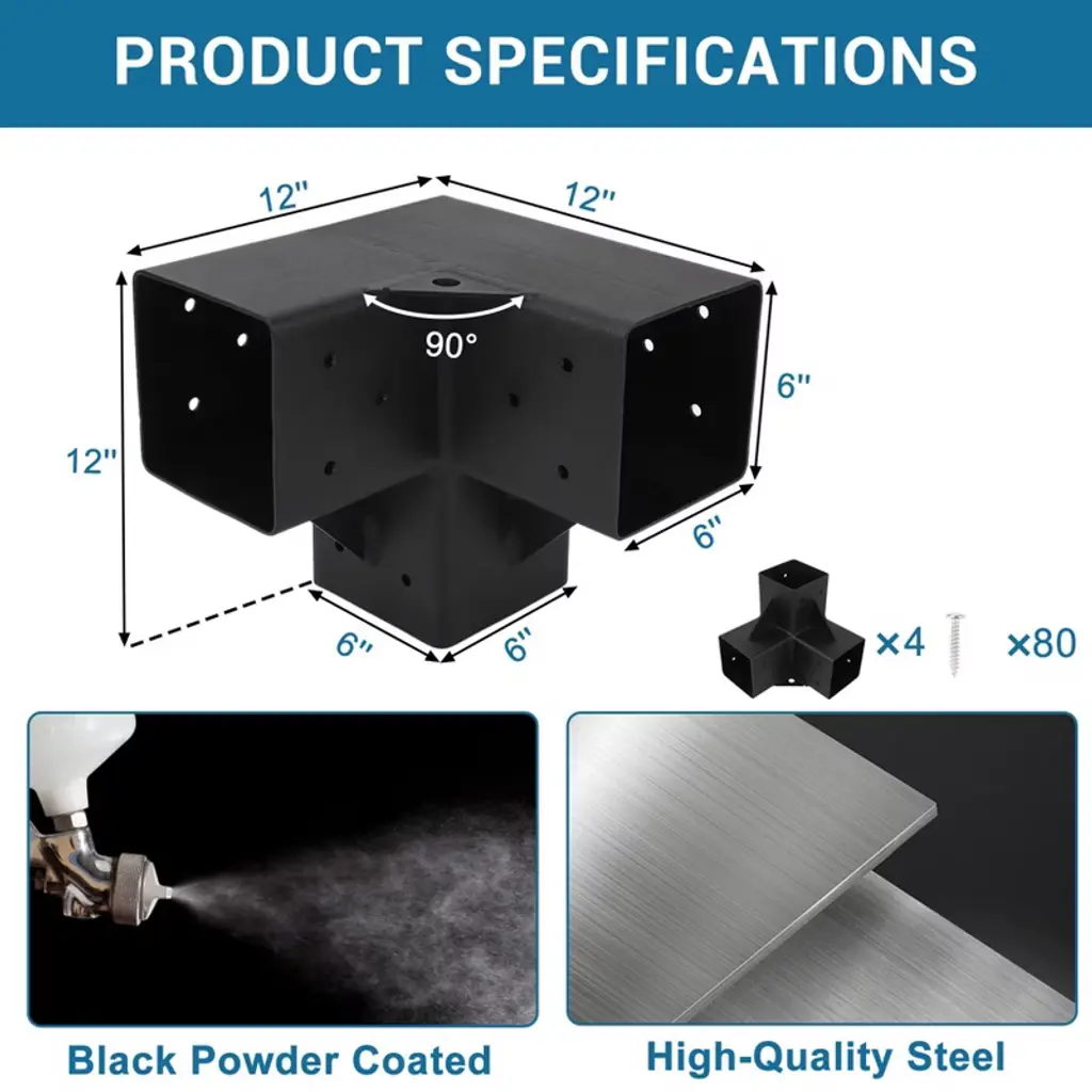 1.Premium Carbon Steel Construction: Built to Last OutdoorsCrafted from high-grade carbon steel, these pergola brackets are engineered for exceptional durability in outdoor environments. The material boasts superior wear resistance, standing up to frequent use and contact with lumber, while its corrosion-resistant and rust-proof properties (enhanced by a protective finish) prevent degradation from rain, humidity, or UV exposure. Designed to fit standard 6x6-inch lumber (actual dimensions: 5.6x5.6 inches), the brackets create a rock-solid foundation for your pergola, ensuring it remains sturdy through seasons of use¡ªperfect for building a reliable structure for family gatherings, outdoor dining, or garden relaxation. 2.Stable in All Weather: Wind & Rain Resistant DesignThese 4-way corner brackets are engineered to keep your pergola stable, even in challenging weather conditions. The robust four-way connection distributes weight evenly across beams, minimizing sway during windy days, while the heavy-duty steel construction resists bending or warping under rain, snow, or intense sunlight. Whether installed in a backyard, on a patio, or in a commercial outdoor space, the brackets provide consistent stability, ensuring your pergola, gazebo, or log cabin extension stays secure and safe for years. 3.Easy DIY Assembly: All Hardware IncludedSay goodbye to complicated construction¡ªthis pergola kit simplifies setup with everything you need. Each pack includes 2 heavy-duty 4-way corner brackets and all necessary hardware (including screws and washers) for secure installation. Simply cut your 6x6 lumber to your desired length (based on your project size), align the beams with the bracket¡¯s pre-drilled holes, and fasten with the included hardware. No specialized tools are required, making it accessible for DIY enthusiasts or homeowners with basic handyman skills. Assembly takes just hours, not days, so you can enjoy your new outdoor space sooner. 4.Versatile for Any Outdoor ProjectThese brackets aren¡¯t limited to pergolas¡ªthey¡¯re perfect for a range of outdoor structures. Use them to build gazebos, wooden patio covers, corner pergolas, or even extensions for log cabins. Ideal for balconies, backyards, parks, restaurants, or commercial spaces, they adapt to various designs: create a shaded garden retreat, an outdoor kitchen area for gatherings, or a cozy patio lounge. The 4-way design offers flexibility in beam placement, letting you customize the structure to fit your space and needs. 5.Reliable Support & Peace of MindBacked by responsive customer service, this pergola kit ensures a smooth experience from purchase to installation. If you have questions about lumber compatibility, assembly steps, or need replacement parts, the support team is available 24 hours a day to resolve issues promptly. The brackets arrive in secure packaging to prevent damage during shipping, so you can start your project with confidence¡ªknowing you have both a durable product and reliable assistance.