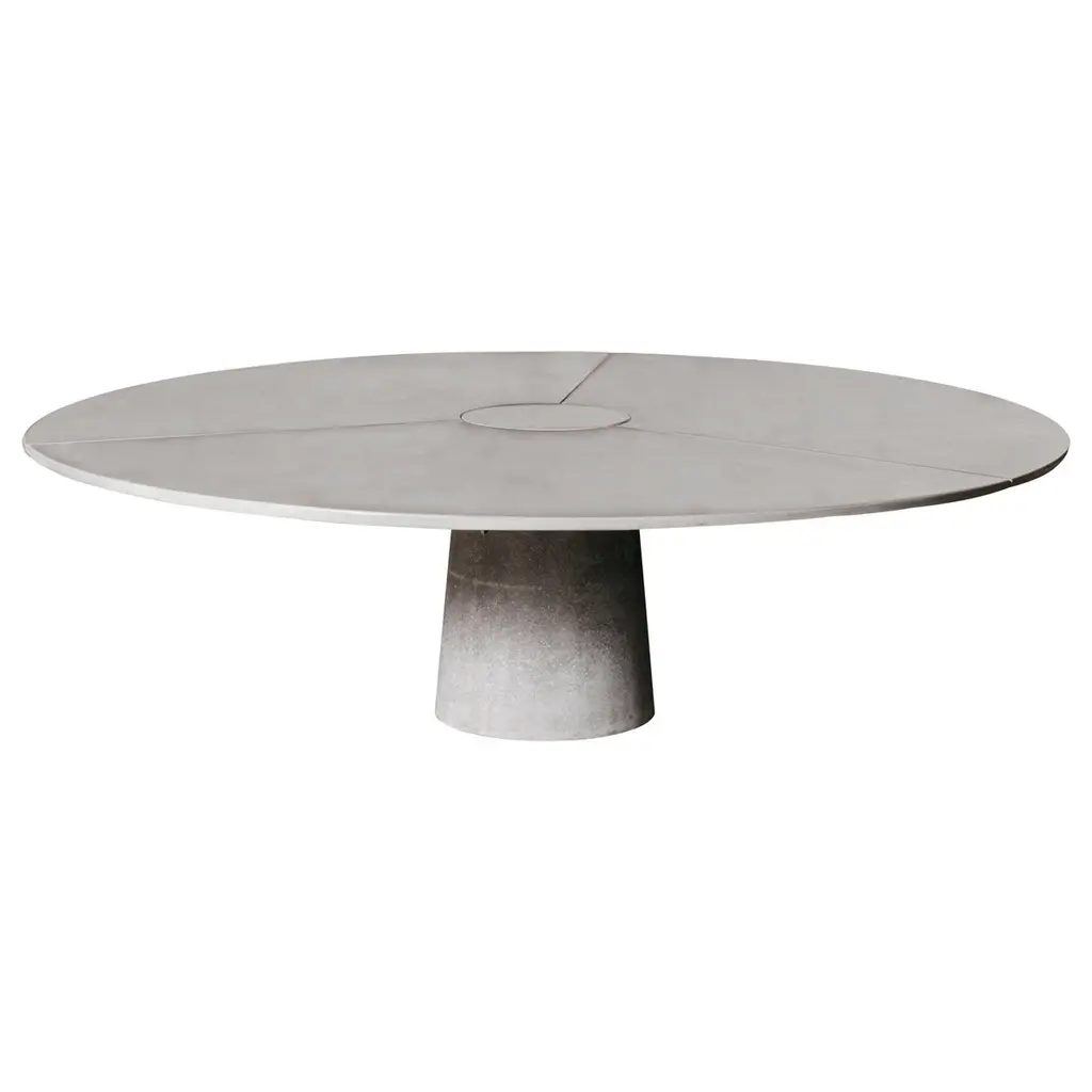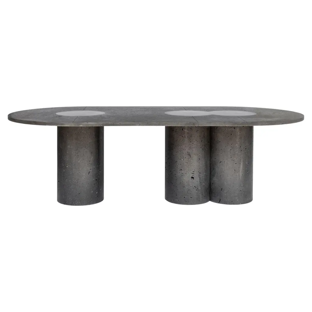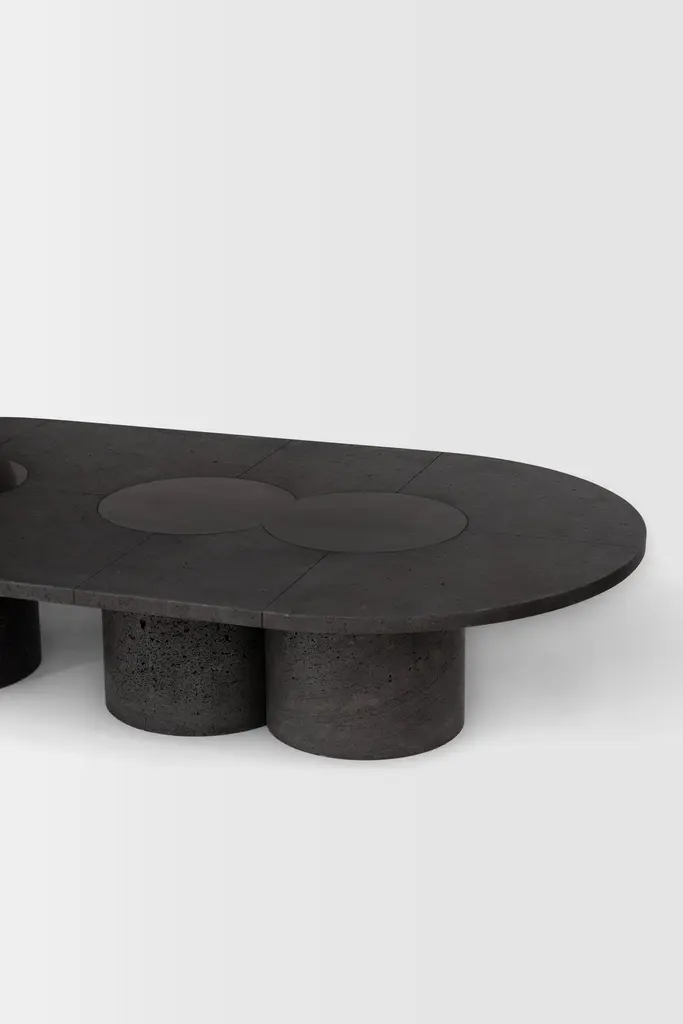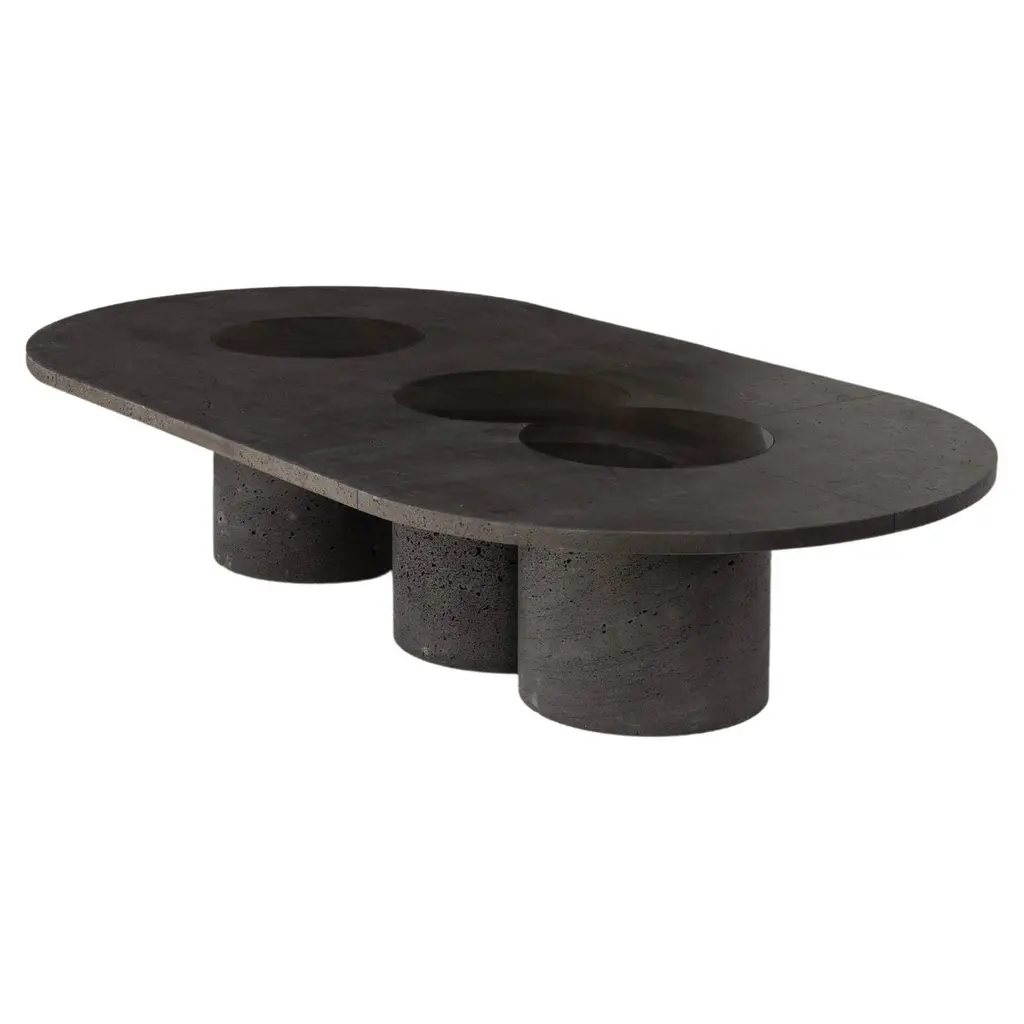 Our reverence towards the sumptuousness of volcanic stone has led us to honor this noble material with a table/sculpture whose rich, porous top sits on top of three cylindrical monoliths born from the whims of Mexico’s volcanic terrain. Etched lines run through the surface of Petra’s top, guiding the eye towards the three soft and inviting polished discs that flow from the monoliths underneath, telling the story of their origin. Petra calls to the mysteries of nature and their sacred play in our day to day lives and pleasures.