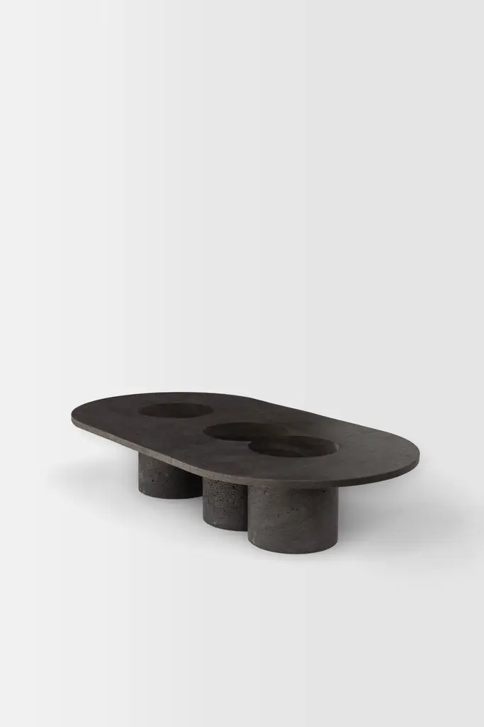 Our reverence towards the sumptuousness of volcanic stone has led us to honor this noble material with a table/sculpture whose rich, porous top sits on top of three cylindrical monoliths born from the whims of Mexico’s volcanic terrain. Etched lines run through the surface of Petra’s top, guiding the eye towards the three soft and inviting polished discs that flow from the monoliths underneath, telling the story of their origin. Petra calls to the mysteries of nature and their sacred play in our day to day lives and pleasures.