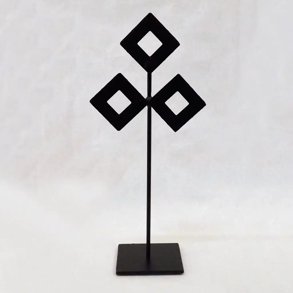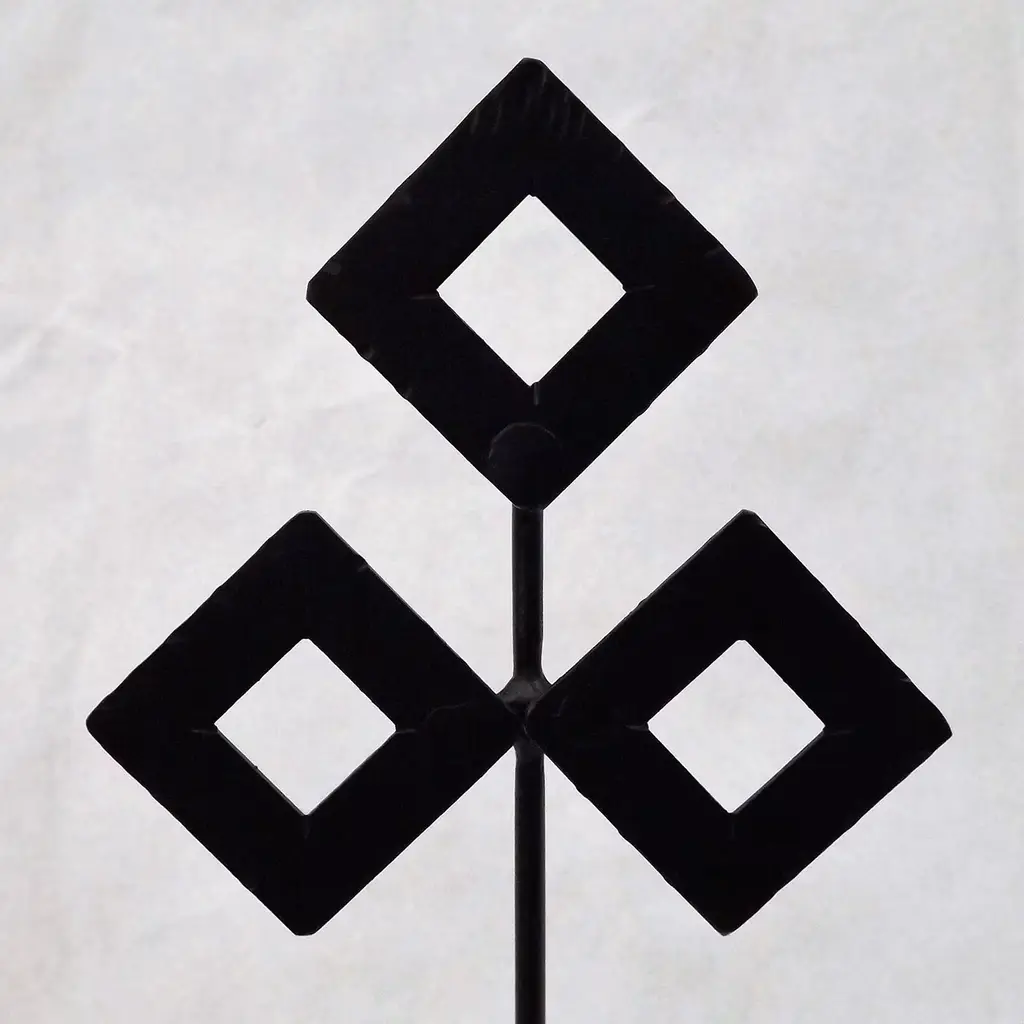 This striking piece from the Linea Ciu' collection merges tradition with artistry, showcasing black metal adorned with a matte lacquer finish. Inspired by Sardinian heritage, the sculpture features bird motifs reminiscent of sacred Nuragic bronzes, symbols of life and positivity. The stem holds three rhombus-shaped leaves, a nod to Neolithic ceramic engravings. This sculpture stands gracefully alone or harmonizes with other pieces, embodying the collection's homage to cultural heritage.