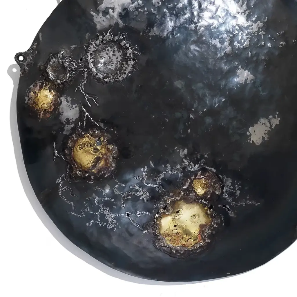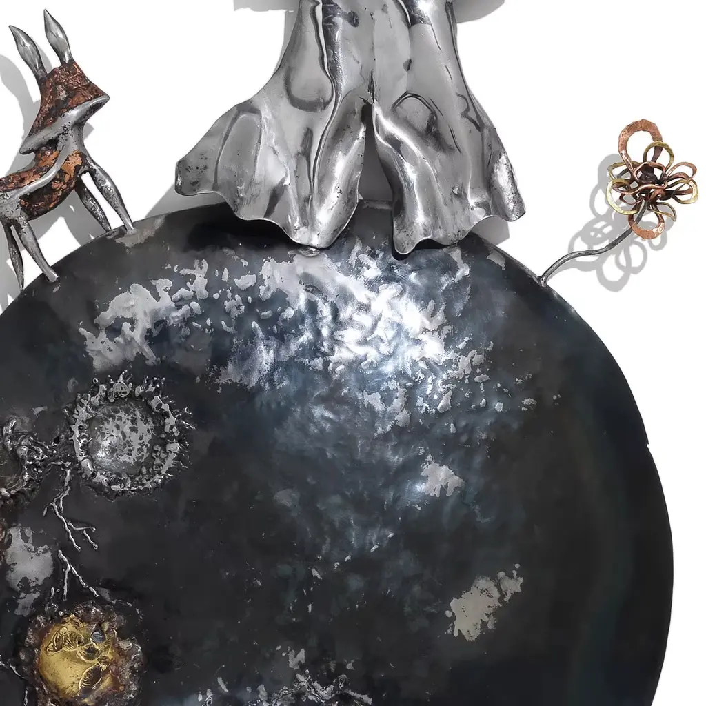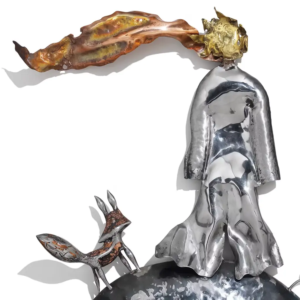 Celebrating the poetic allure of the beloved Little Prince novel, this sculpture was conceived as a unique wedding gift. Master artist Alessandro Rametta created a complex structure in low and high-relief based on personal experimentations in the hand-forging process. The prince, fox, and rose to symbolize care and love in this one-of-a-kind piece handcrafted in iron, brass, and copper using the repoussage technique, hammering, inclusion in copper and brass, with free-hand-made spreader-beam, and burnished effects obtained with the open flame. The varnish is in thermosetting powder. The image depicts a work already realized and does not represent the sculpture that will be forged on commission. The freehand sculptural process of Maestro Alessandro Rametta makes each work, although reproducible, unique and unrepeatable.