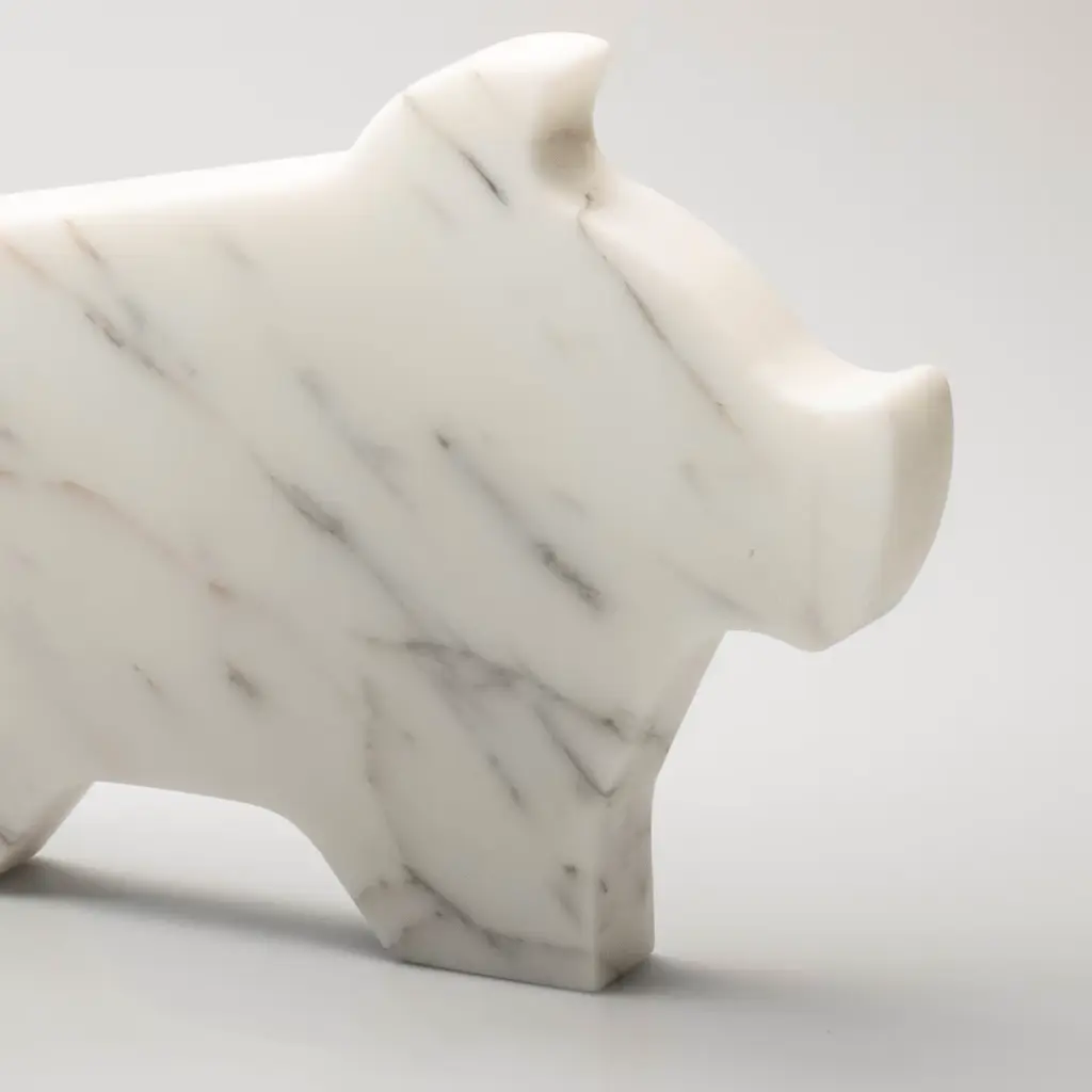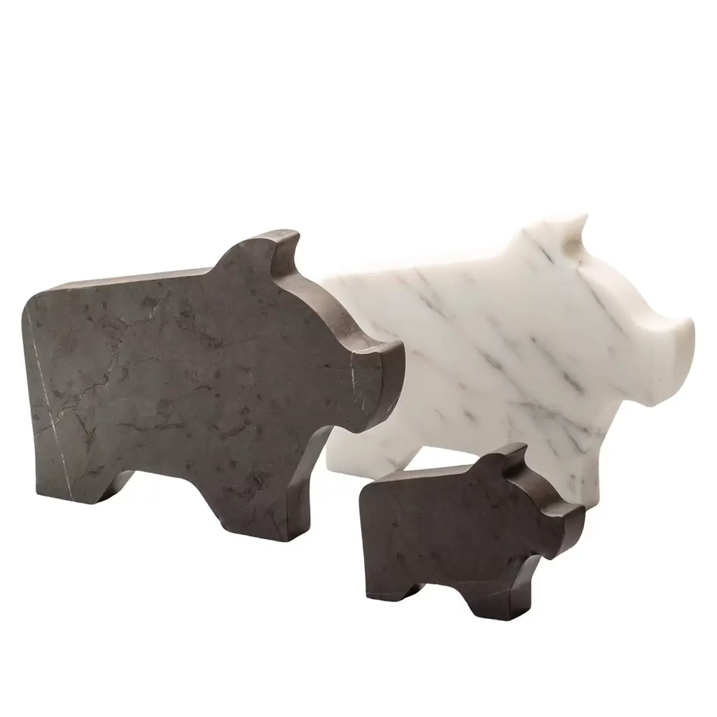 The simplicity and authenticity of farm life inspired Alessandra Grasso to design the Factory series of marble statuettes to which this design belongs. Shaped like a stylized little pig, it enchants with the beauty of its natural veins that lend timeless elegance to its playful personality. Suitable as an unconventional paperweight or as a simple decorative item, it comes in two smaller options and in a gray Grafite marble variant, please check the Artemest catalog.