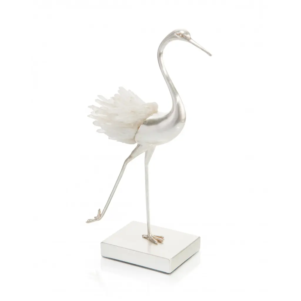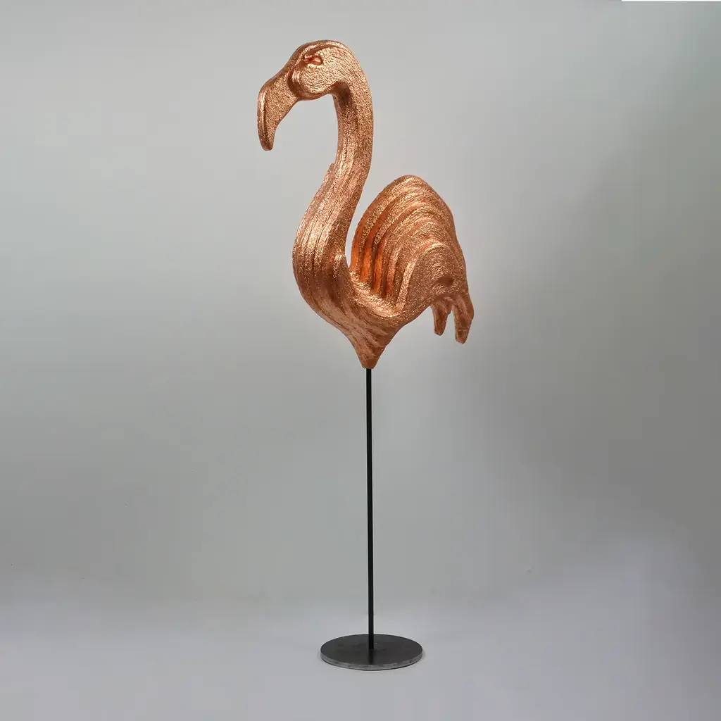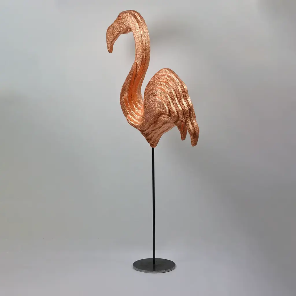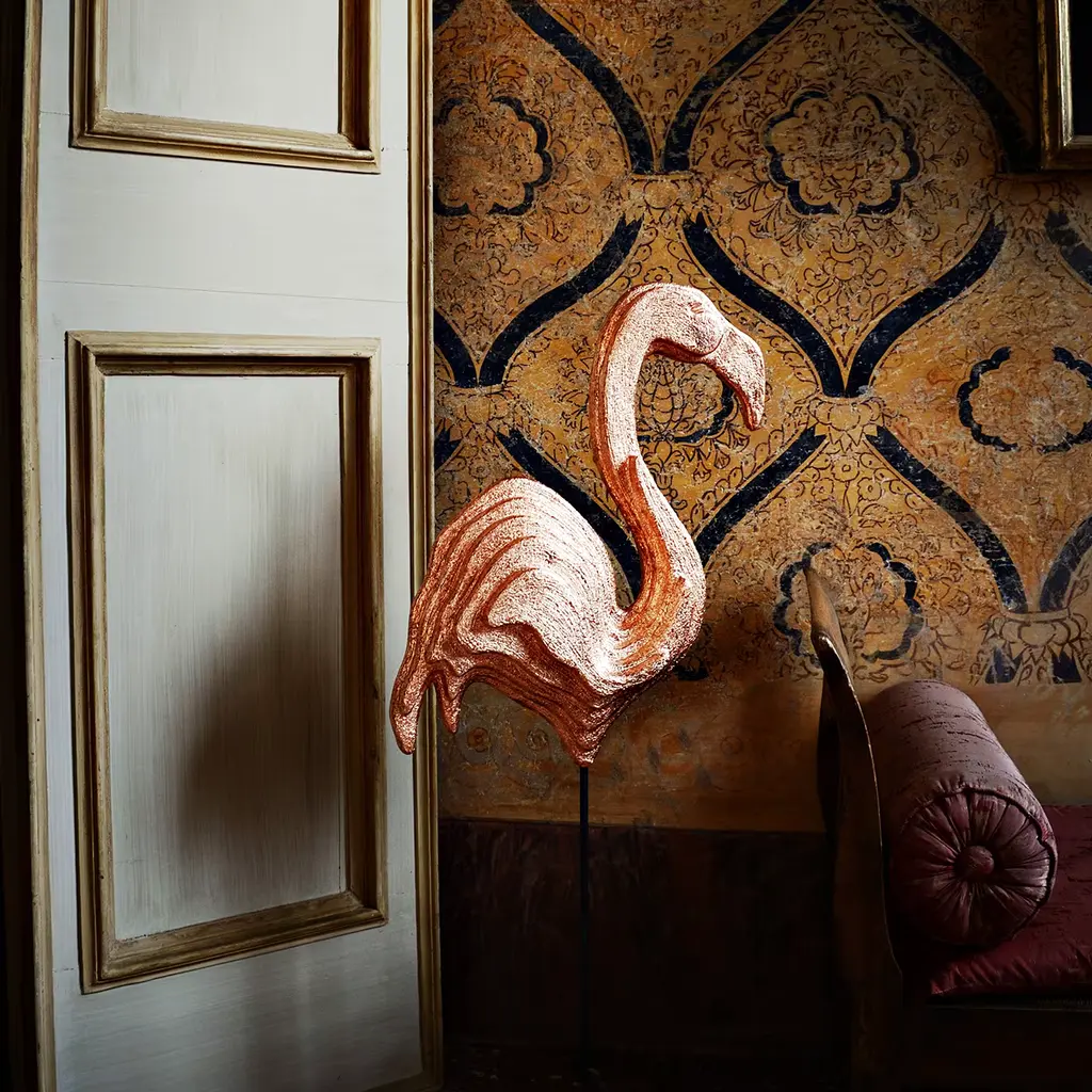 Flamingos and their poetic frailty inspired this stunning zoomorphic sculpture in extruded polyurethane, its streamlined stem standing for the birds' signature extra-thin and elongated legs. Fitted to a raw iron base, the body of the flamingo is finished with an application of plaster on relief and precious copper leaf for a striking interplay of shimmers resulting emphasized when the piece is hit by the light.