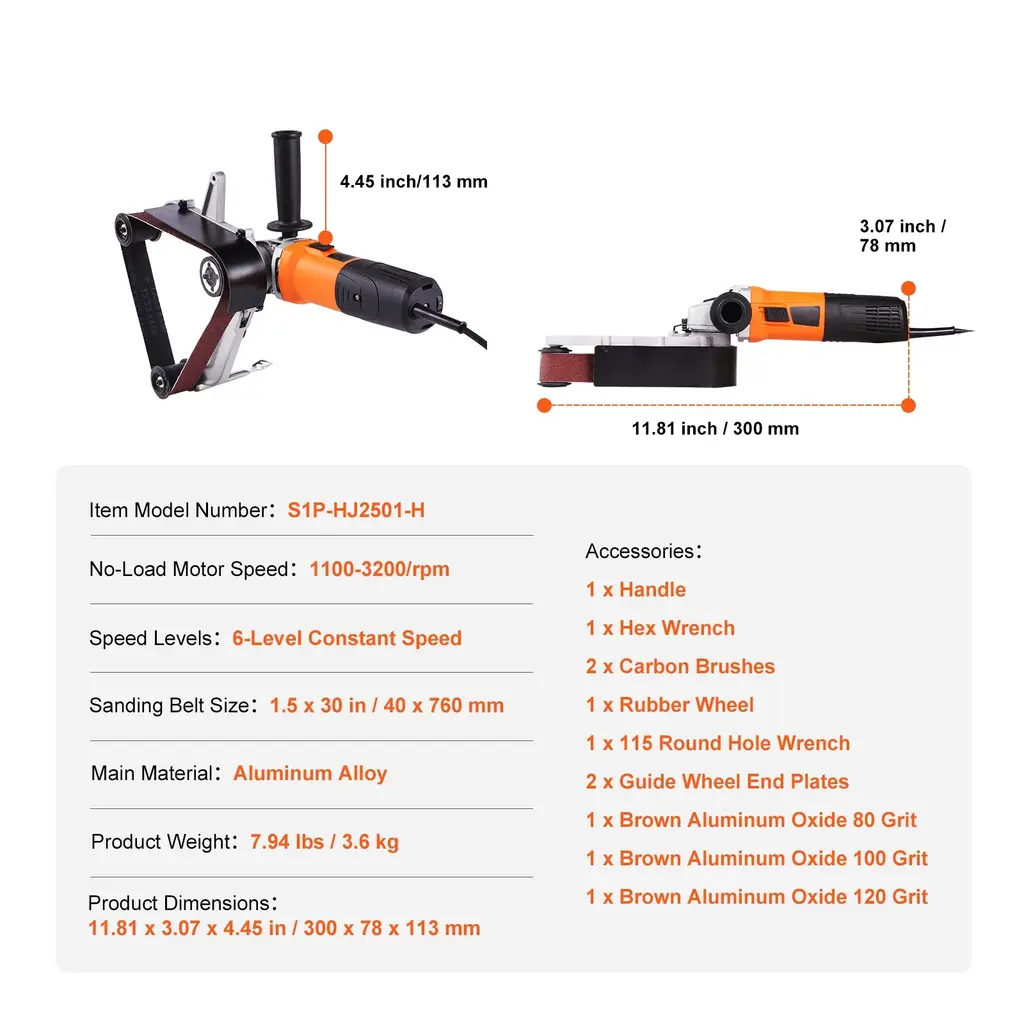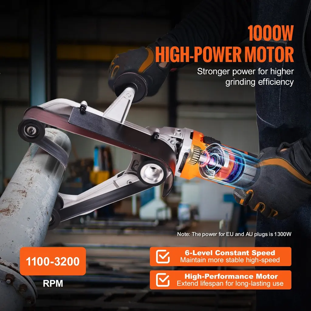 High Performance: This pipe tube polisher sander delivers a robust 1000W output, providing high power for your sanding tasks. With 6-speed settings, from 1100rpm to 3200rpm, you can select the most optimal sanding speed based on various work tasks and different materials. Grit Variety for Enhanced Versatility: Belt sander kit includes 50PCS sanding belts, offering 10 of each / Belt sander kit includes 100PCS sanding belts, offering 20 of each: zirconia alumina in 60 and 80 grits, and brown aluminum oxide in 180, 400, and 800 grits, catering to both coarse and fine sanding requirements. Elevate your sanding projects with the right belt choice. (Belt Size: 1.5 x 30 inch) For 3 PCS option: This belt sander kit includes 3PCS brown aluminum oxide sanding belts with different grits: 80/100/120 Grit, catering to both coarse and fine sanding requirements. Elevate your sanding projects with the right belt choice. (Belt Size: 1.5 x 30 inch) Superior Quality & Longevity: Our pipe belt sander is crafted from premium aluminum alloy material, built to withstand rust, corrosion, and scratches. Its integrated aluminum frame prevents belt slippage when under pressure, while the fine surface treatment provides a superior texture. Easy to Use: This tube polishing and grinding machine is compact, lightweight, and easy to operate. It features a spindle lock button for quick and convenient driving wheel removal, and the ergonomic soft-grip handles achieve your optimal grip and enhance comfort. Versatile & Ready for Tasks: Whether you're dealing with round pipes, stainless steel, aluminum, iron, plastics, non-ferrous metals or wood, this tube belt sander polisher has your back. It's your all-in-one solution for rust removal, grinding, polishing, brushing, and mirror surface treatment. 50PCS Package Content 1 x Handle 1 x Hex Wrench 2 x Carbon Brushes 1 x Rubber Wheel 1 x 115 Round Hole Wrench 2 x Guide Wheel End Plates 10 x Zirconia Alumina 60 Grit 10 x Zirconia Alumina 80 Grit 10 x Brown Aluminum Oxide 180 Grit 10 x Brown Aluminum Oxide 400 Grit 10 x Brown Aluminum Oxide 800 Grit 3PCS Package Content 1 x Handle 1 x Hex Wrench 2 x Carbon Brushes 1 x Rubber Wheel 1 x 115 Round Hole Wrench 2 x Guide Wheel End Plates 1 x Brown Aluminum Oxide 80 Grit 1 x Brown Aluminum Oxide 100 Grit 1 x Brown Aluminum Oxide 120 Grit 100PCS Package Content 1 x Handle 1 x Hex Wrench 2 x Carbon Brushes 1 x Rubber Wheel 1 x 115 Round Hole Wrench 2 x Guide Wheel End Plates 20 x Zirconia Alumina 60 Grit 20 x Zirconia Alumina 80 Grit 20 x Brown Aluminum Oxide 180 Grit 20 x Brown Aluminum Oxide 400 Grit 20 x Brown Aluminum Oxide 800 Grit