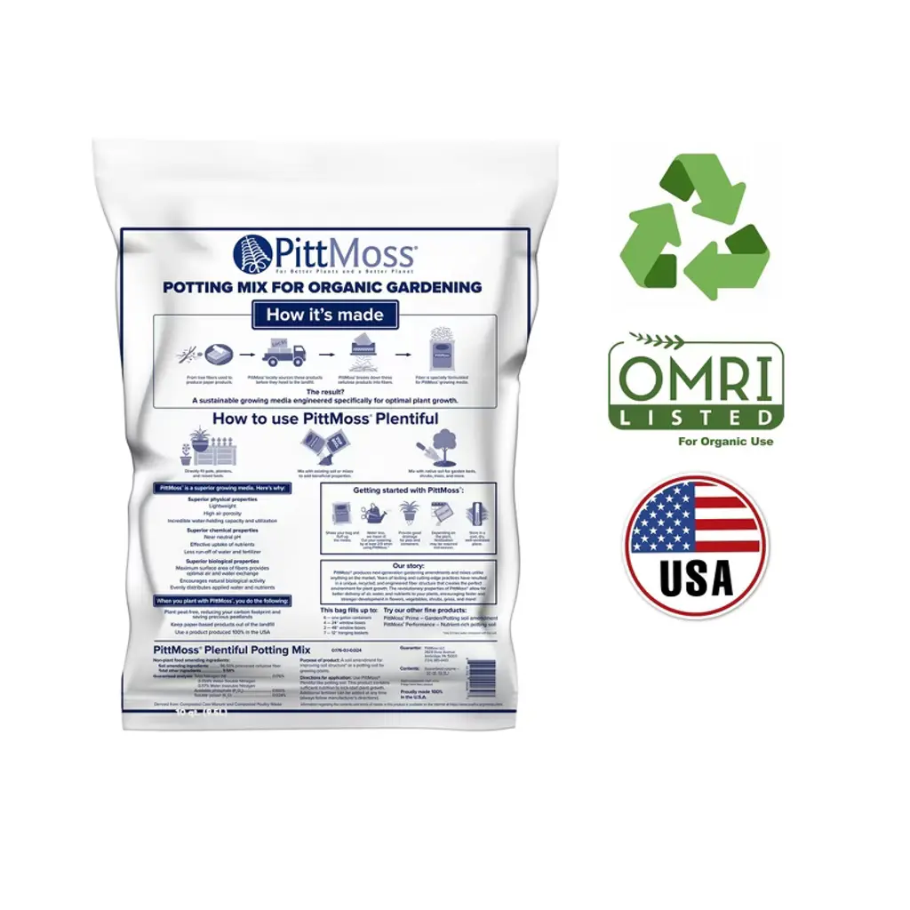 PittMoss Plentiful is a peat-free, OMRI-listed, organic potting mix with no pathogens, weed seeds or other heavy metals and harmful ingredients. It is uniquely crafted from recycled cellulosic fibers and small amounts of organic bark ingredients fortified with poultry manure, bovine compost inoculates and feather meal. This soil contains high amounts of readily available carbon, ideal for creating a living soil environment that is chock-full of soil biology. It enables a pH balance that readily adapts to meet the specific needs of plants, promoting robust root growth. By using PittMoss, gardeners can reduce greenhouse gas emissions associated with peat bog mining, and it offers a cleaner, more consistent soil option with rigorous testing to ensure optimal performance.