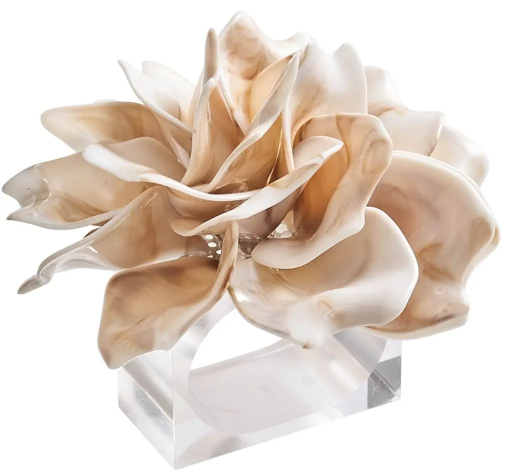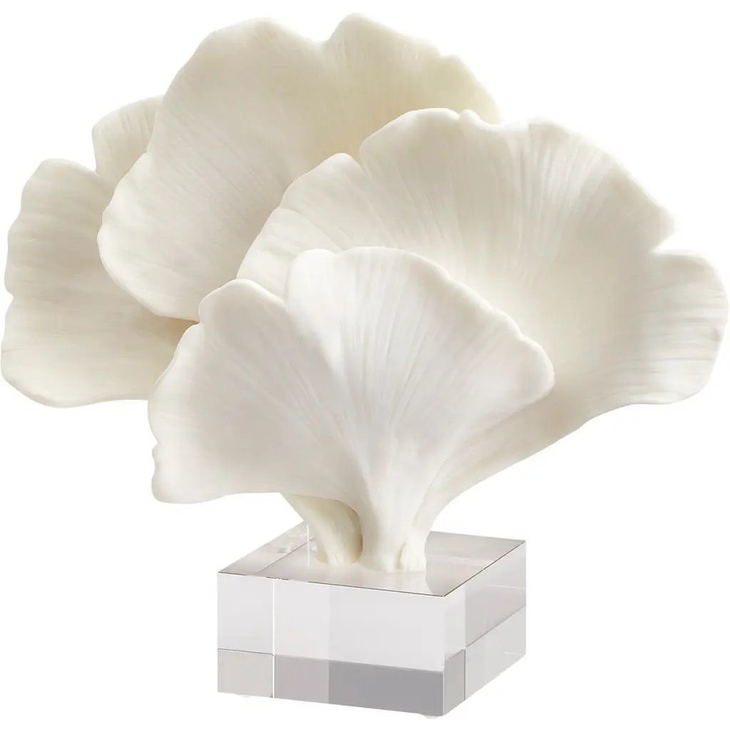 This tabletop accent piece is the perfect complement to any modern ensemble. A design centered around an abstracted, blooming shrub, the Pleasant Palm sculpture is comprised of white resin leaves sprouting from a clear, crystal cubed vase. Perfect for any coastal themed space, or contemporary arrangement.