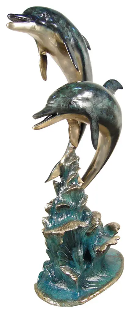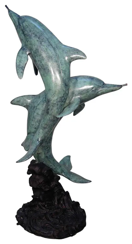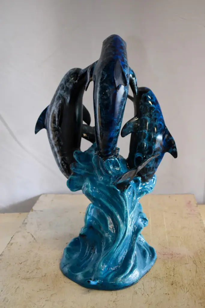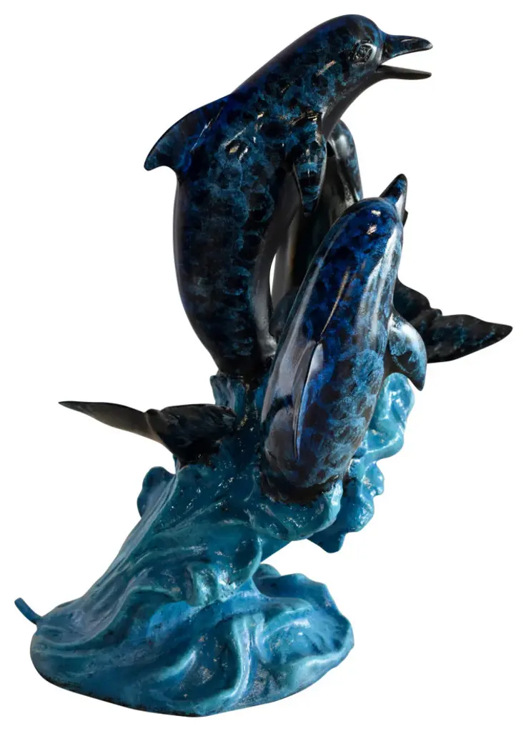 A masterful combination of coastal thought and beauty, this resin statue of a pod of dolphins is necessary for any ocean or animal lover. The dolphins gracefully riding the ocean waves make it a detailed, beautiful, and unique work of art. Size: 15"L x 14"W x 20"H. Weight is: 18Lb