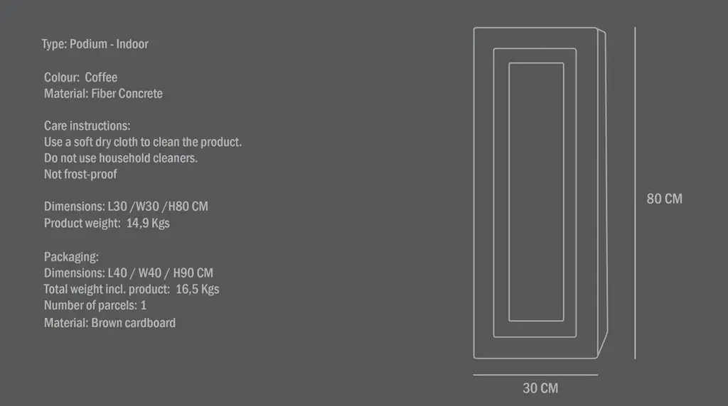 Podium, column, like a modern sculpture in Fiber Concrete, contemporary work.Concrete and fibre column or podium in the style of a contemporary sculpture. Inspired by the details of architectural facades. This column can be placed both horizontally and vertically. Available in three different heights. A contemporary creation of fine quality.Colour : CoffeeMaterial: Fiber ConcreteDimensions : L: 30 cm / W: 30 cm / H: 80 cm Product weight : 14,9 Kgs