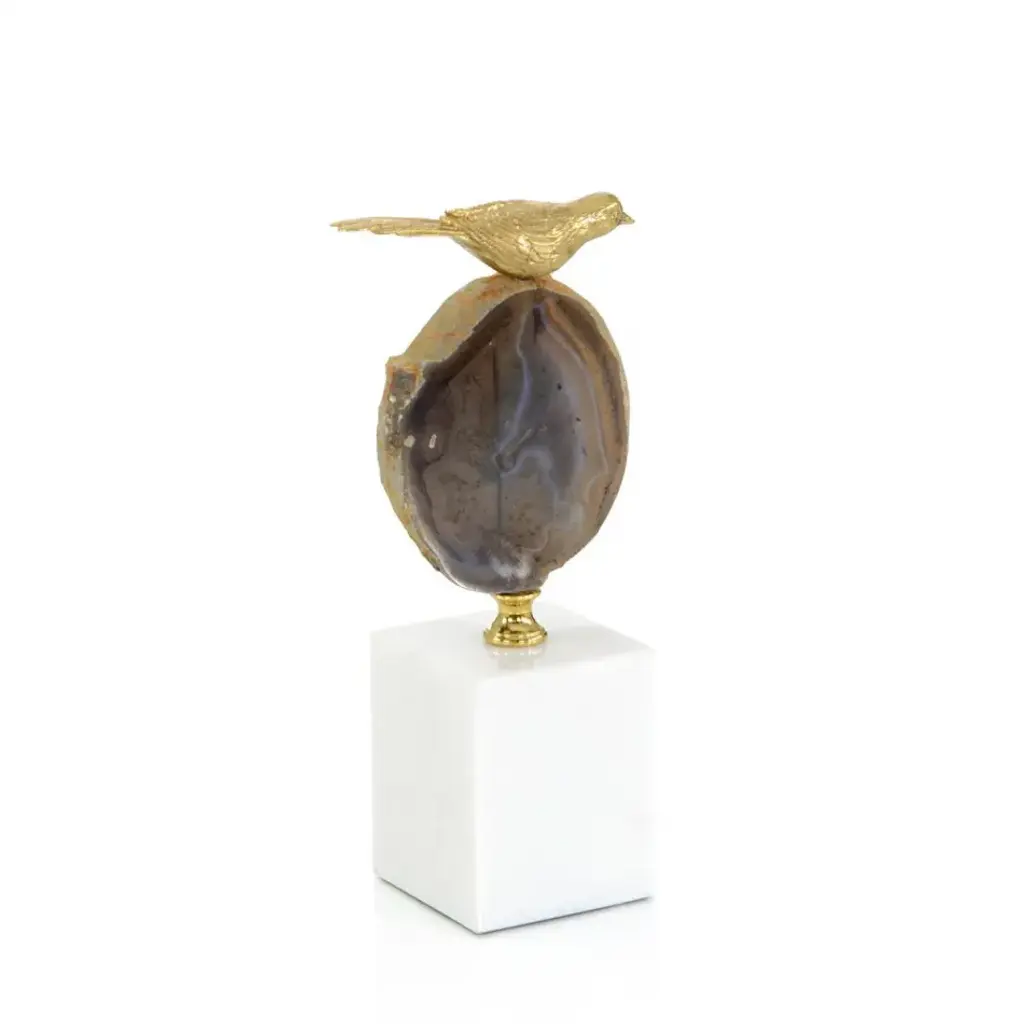 A polished agate oval disk is mounted on a white marble base and embellished with a brass bird.