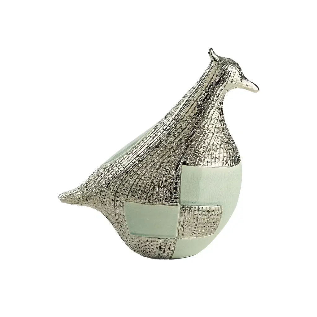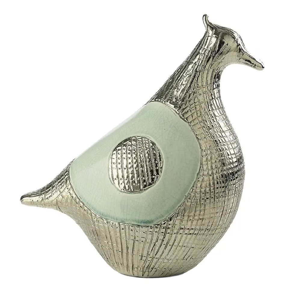 Whimsical and elegant, this stylized statue of a bird merges the allure of classical statuary with modern sophistication. The piece's refined silhouette and dainty beak, regal crest, and feathered tail are delicately hand-made, fashioned out of ceramic. Sections of smooth, taupe glaze and textured, bronze-colored enamel dance across the surface of the piece, their thoughtful juxtaposition evoking the texture of bird feathers. A wonderful accent in a study or living room, this piece is sure to impress.