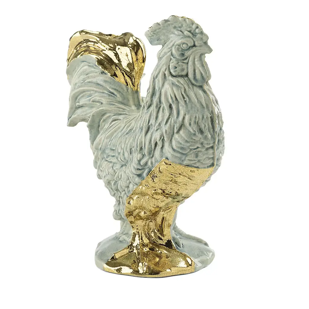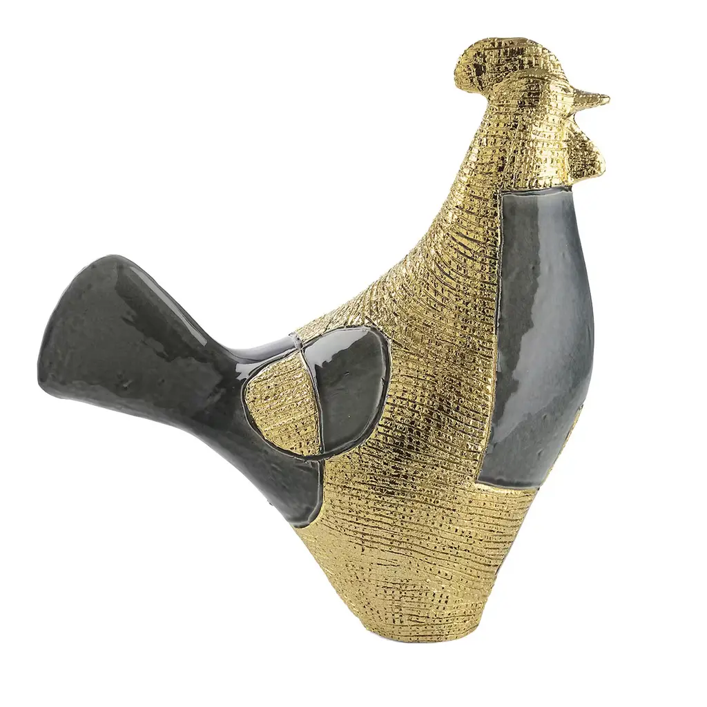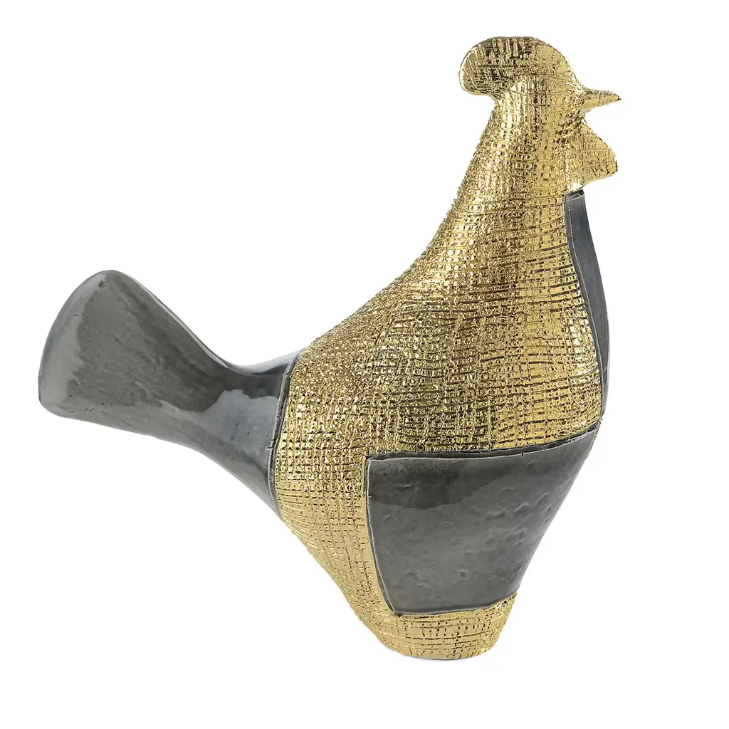 A classical silhouette with a modern twist, this stylized sculpture of a rooster exudes timeless elegance. Best showcased as a centerpiece on a table or console, the curved silhouette and delicate beak, regal crest, and closed tail feathers are entirely handmade of ceramic with natural and metallic glazes. Reminiscent of modern art, the abstracted interplay of the smooth, blue glaze and the textured, bronze-colored enamel captures the rough quality of bird feathers, enriching the composition.