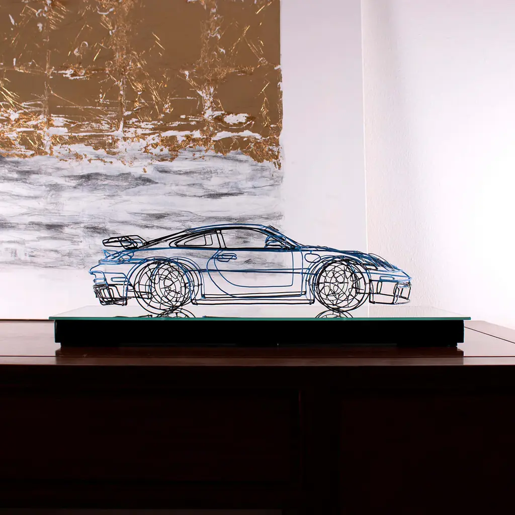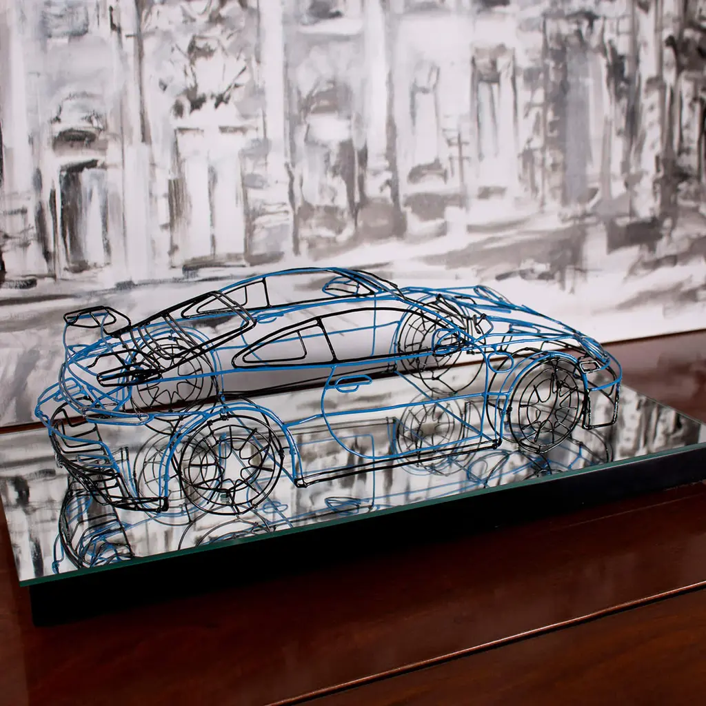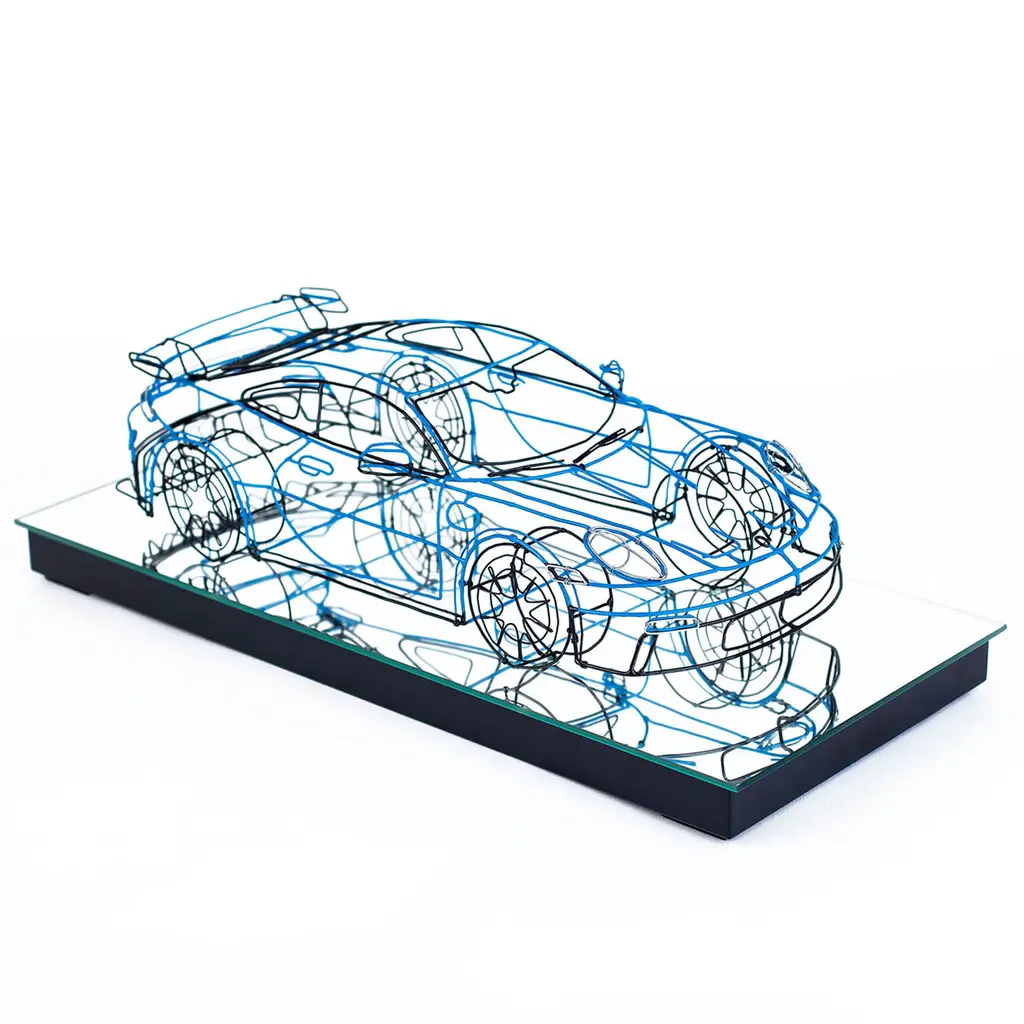 This captivating wire sculpture showcases the Porsche 911 GT3 with remarkable craftsmanship. Handcrafted using colored metal wire and black iron accents, it captures the sleek silhouette and dynamic essence of the car. The sculpture rests on a glossy black base with a mirrored top, enhancing its modern aesthetic. Fully customizable in both model and color, this unique piece combines contemporary design with artisanal mastery. Please contact the Concierge for customization options.