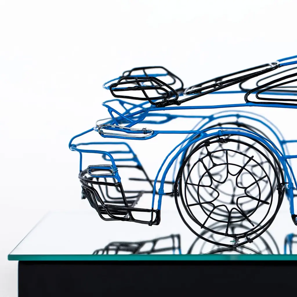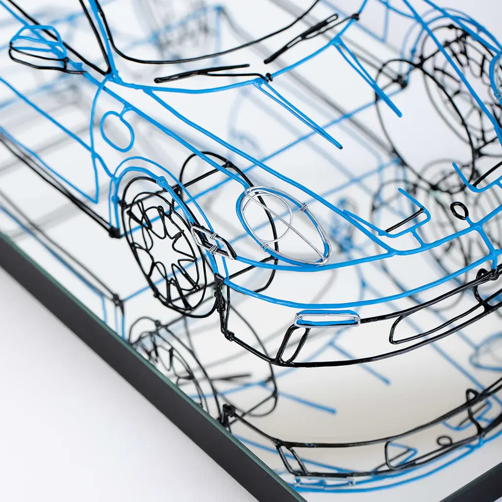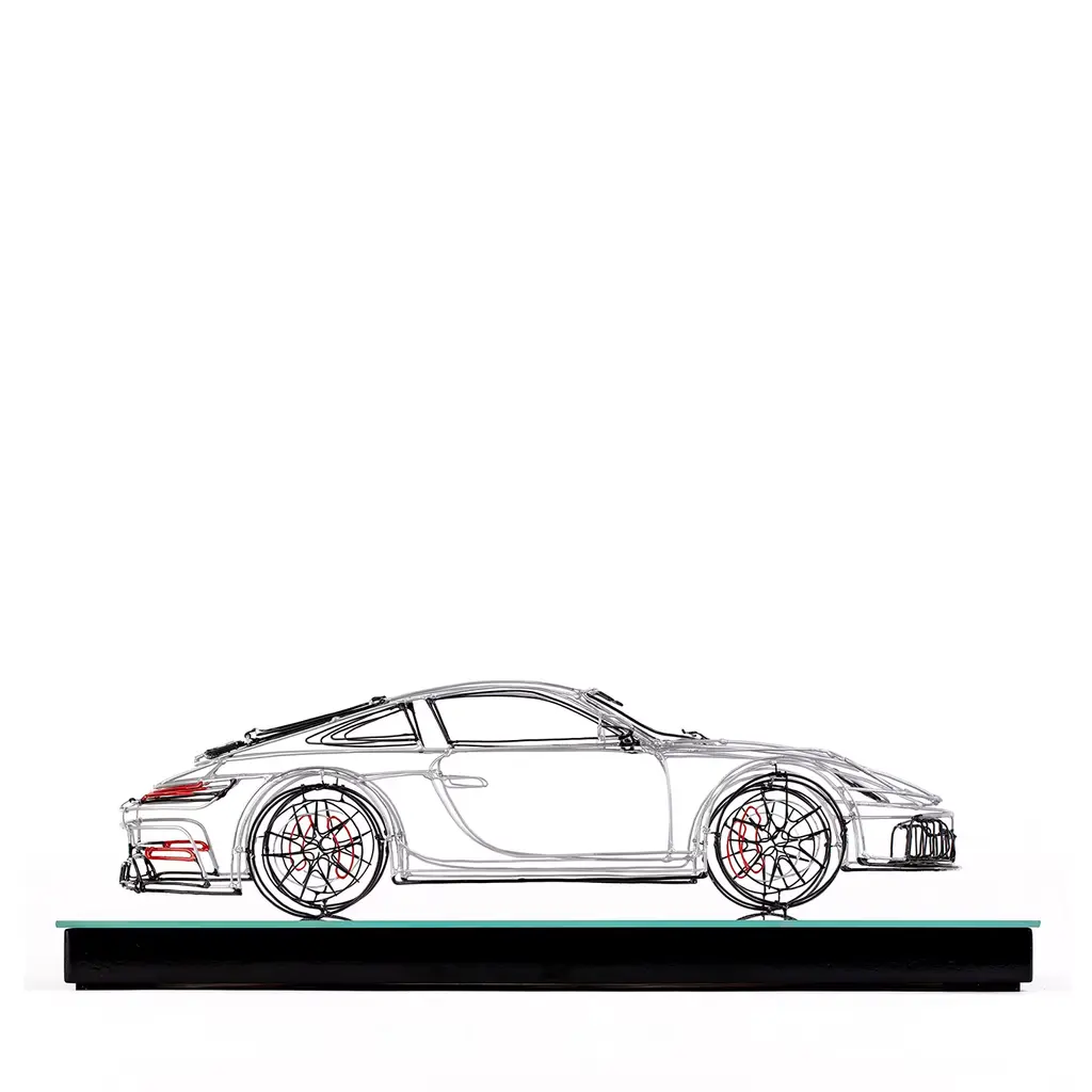 This captivating wire sculpture showcases the Porsche 911 GT3 with remarkable craftsmanship. Handcrafted using colored metal wire and black iron accents, it captures the sleek silhouette and dynamic essence of the car. The sculpture rests on a glossy black base with a mirrored top, enhancing its modern aesthetic. Fully customizable in both model and color, this unique piece combines contemporary design with artisanal mastery. Please contact the Concierge for customization options.