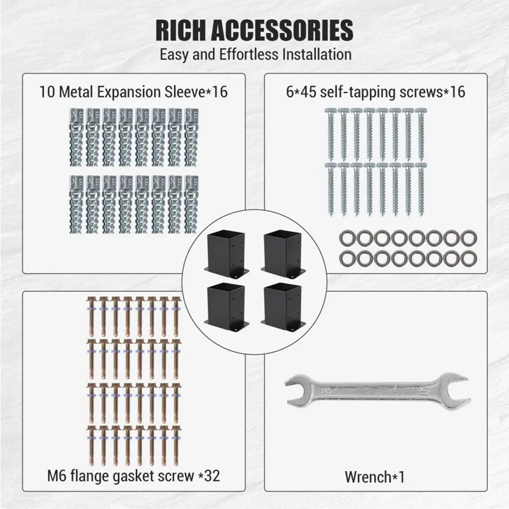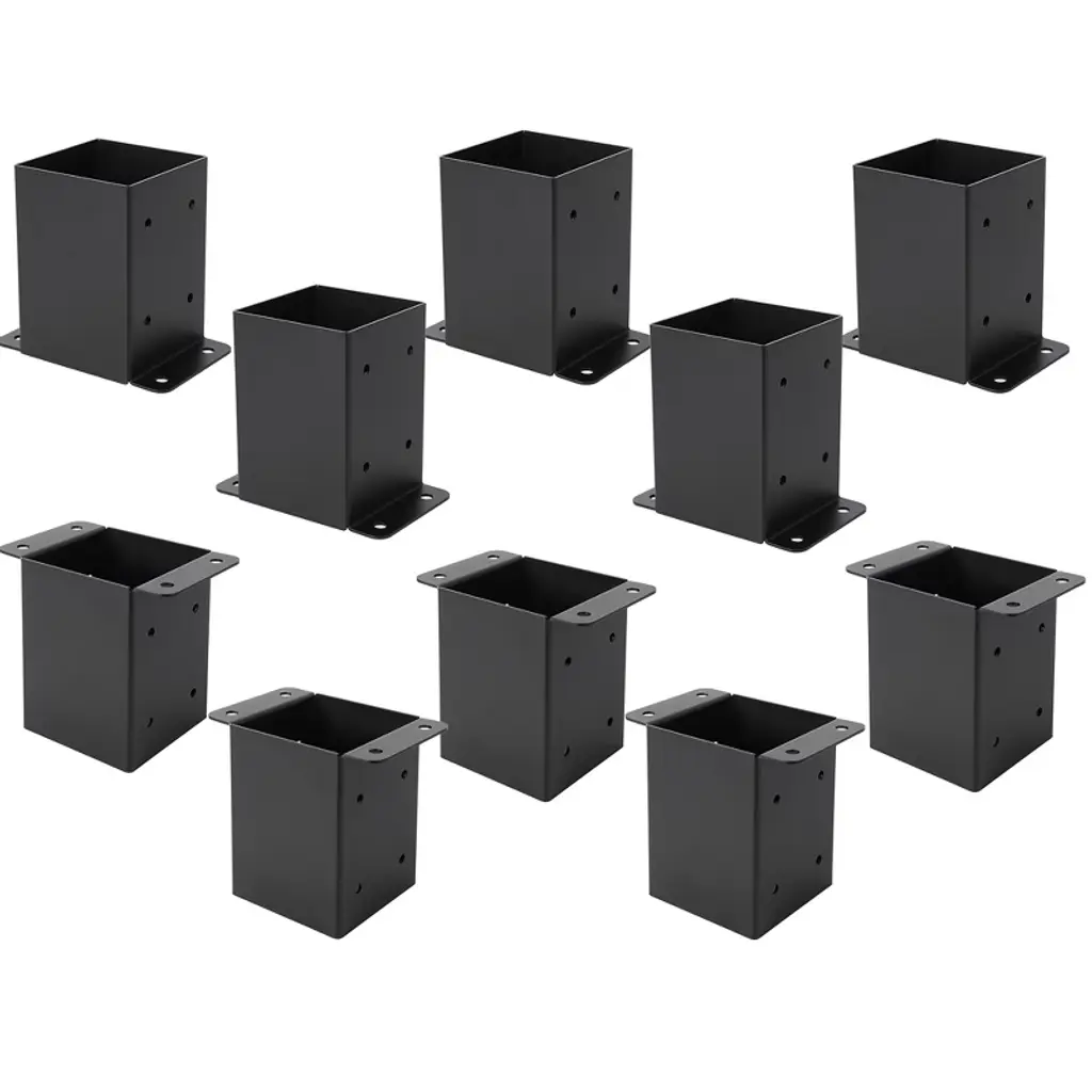 1.Flexible Bundle Sizes for Every Project Scale Choose from three practical bundle options¡ª2-pack, 4-pack, or 10-pack¡ªto match your needs. The 4-pack is ideal for medium-sized projects like building a section of fence, a small deck, or a garden pergola, while 2-packs suit quick repairs (e.g., mailbox posts) and 10-packs handle large-scale builds. All fit standard 4x4 lumber (actual size 3.5"x3.5"), ensuring universal compatibility with most outdoor wooden posts. 2.Heavy-Duty Steel with Rust-Resistant Finish Crafted from robust steel, these post bases are built to endure extreme weather¡ªrain, snow, and intense UV exposure¡ªwithout rusting or corroding. The durable powder-coated finish adds a protective layer, extending their lifespan even in harsh outdoor conditions. Each bracket comes with a complete hardware kit, so you have everything needed for setup right out of the box¡ªno extra trips to the hardware store required. 3.Secure, Wobble-Free Support for 4x4 Posts With inner dimensions of 3.6"x3.6", these bases perfectly cradle 3.5"x3.5" posts. Their full-wrap design encircles the post completely, preventing shifting, tilting, or wobbling¡ªcritical for maintaining structural integrity in decks, fences, or gazebos. This secure fit ensures your outdoor structures stay stable, even under heavy loads or high winds, giving you long-term peace of mind. 4.Pre-Drilled Holes & All-Inclusive Hardware for Easy Installation Save time with pre-drilled holes that simplify alignment, making setup quick and error-free. The kit includes bolts, concrete anchors, and wood screws, allowing seamless mounting on both wooden surfaces (like deck frames) and concrete slabs. Whether you¡¯re a DIY enthusiast or a professional builder, the straightforward installation process gets your project up and running faster. 5.Multi-Purpose Anchoring for Versatile Outdoor Structures Engineered for maximum stability, these 4x4 post bases excel across diverse outdoor projects: decks, fences (up to 4x4 posts), pergolas, gazebos, railings, furniture legs, and mailbox columns. Their versatile design makes them a reliable choice for both residential and light commercial builds, ensuring strong, lasting support wherever structural strength is essential.