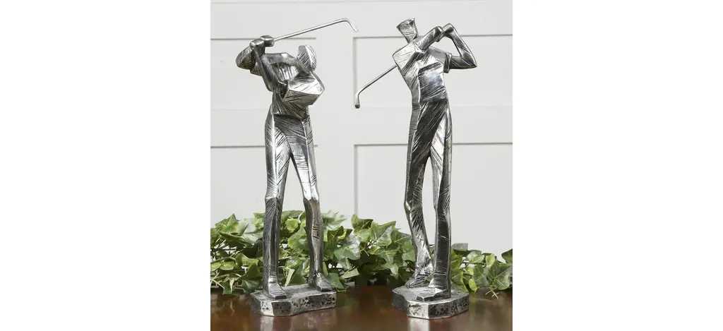 Metallic silver figurines with a matte black glaze. Sizes: Small-7x15x4, Large-7x16x3.