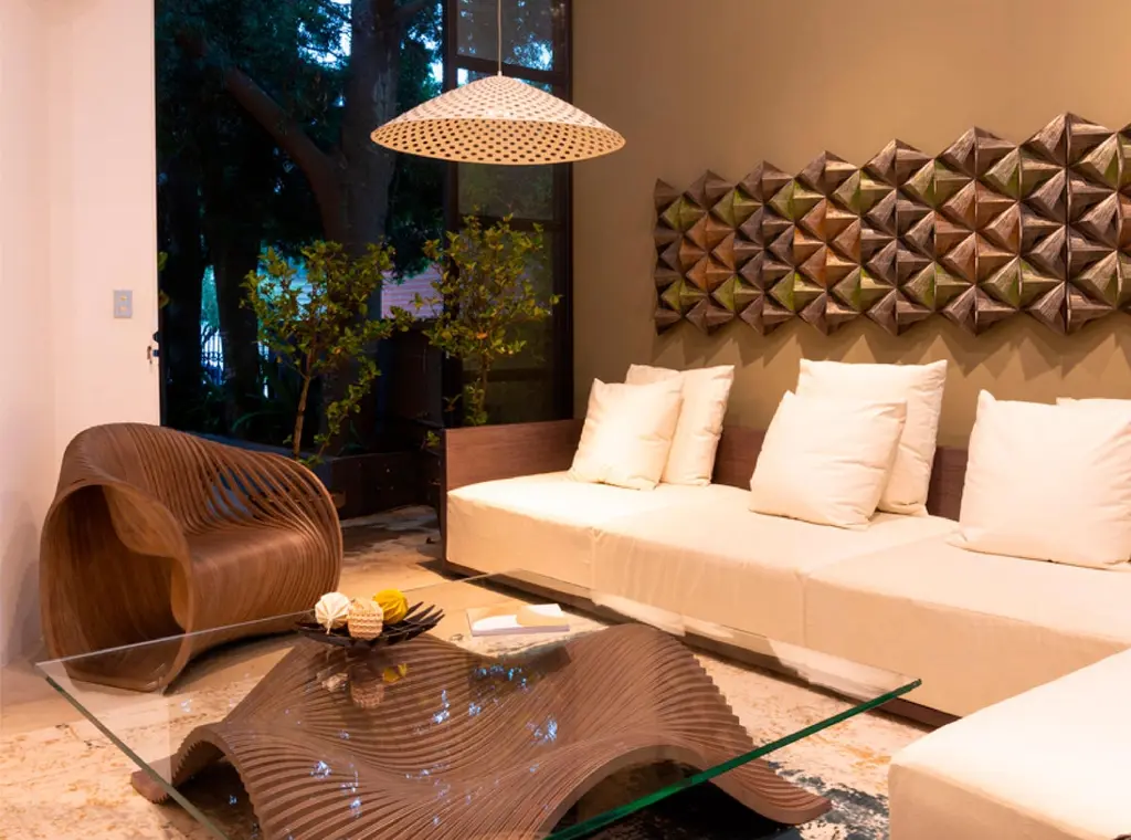 This wall decor piece is a sophisticated and modern prism-inspired design that seamlessly blends silk, cotton, and PVC materials to create a striking visual statement. The design features angular, geometric shapes that form a prism-like structure, offering a sense of depth and dimension. The silk and cotton elements bring a soft, organic texture to the piece, with the luxurious silk catching light in a way that adds a rich, subtle glow to the overall composition. The cotton threads provide a tactile contrast, adding structure and depth to the woven patterns.The PVC components contribute to the decor's modern edge, offering a sleek and glossy finish that reflects light and creates intriguing visual contrasts against the natural fibers. The combination of materials creates a unique fusion of softness and sharpness, with the geometric prisms offering a sense of movement and energy, while the textiles lend a calming and organic balance to the design.