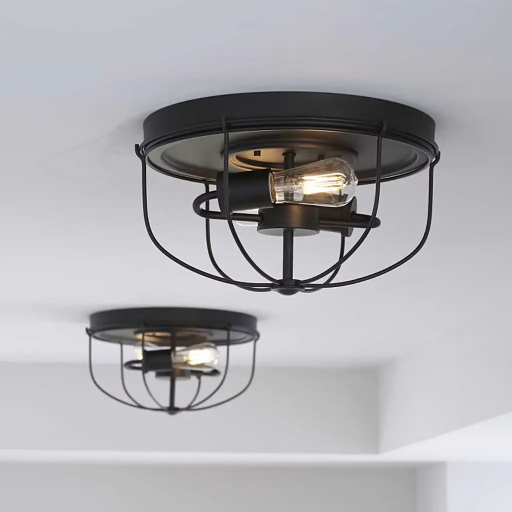 Introducing the Medal Collection 2-Light Coastal Blue Industrial Flush Mount Ceiling Light from Progress Lighting, where vintage charm meets modern durability. Crafted from robust steel and finished in a striking Coastal Blue, this fixture adds a pop of color and industrial flair to any space. Measuring 14.5 inches in width and length, with a modest height of 7.88 inches, it's designed to fit seamlessly into your room. The flush hanging method allows for a clean, close-to-ceiling installation, perfect for rooms with lower ceilings. The open-cage design, reminiscent of classic automobile engines, showcases two incandescent bulbs (not included), each with a 60-watt capacity, casting a warm, inviting glow. Rated for damp locations, this light is versatile enough for a bathroom or covered outdoor area. The included canopy, with a diameter of 13.63 inches, ensures a neat finish. Illuminate your space with this industrial-chic centerpiece that's as functional as it is stylish.