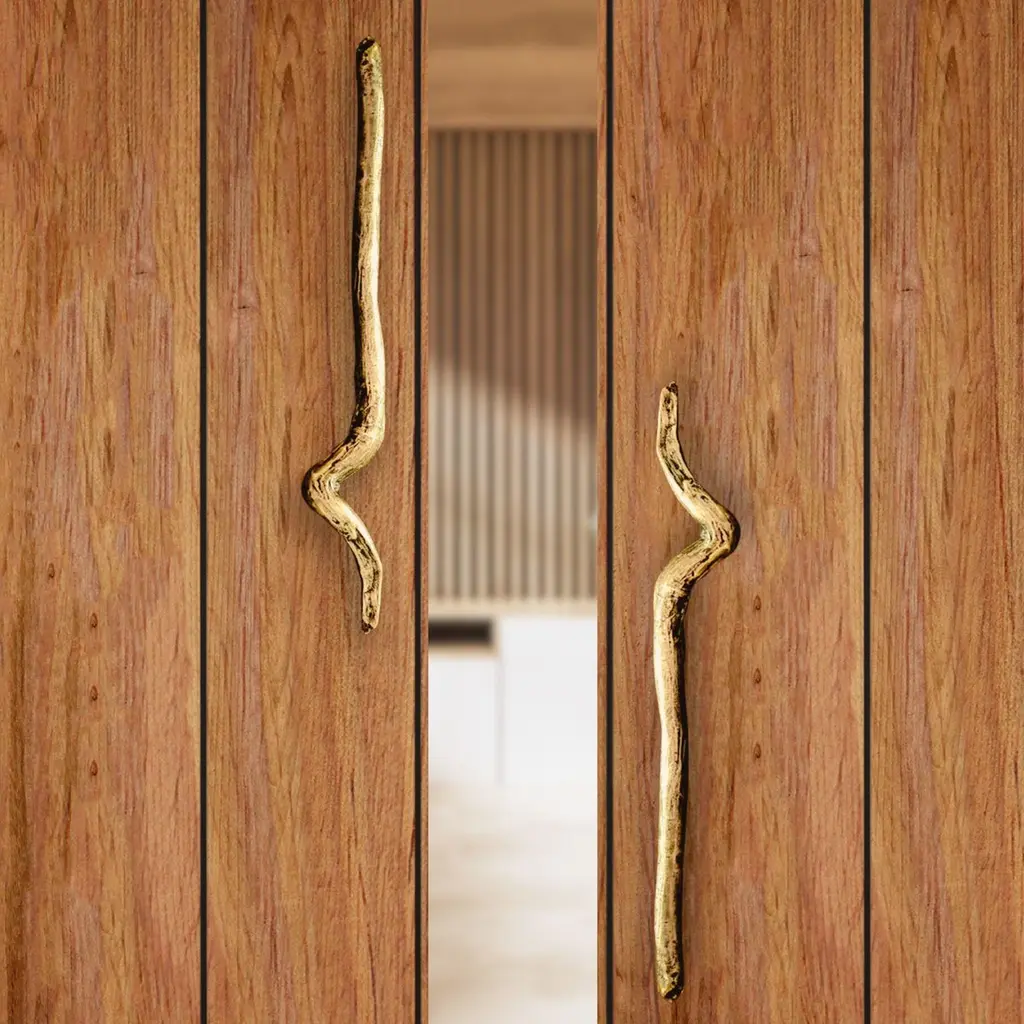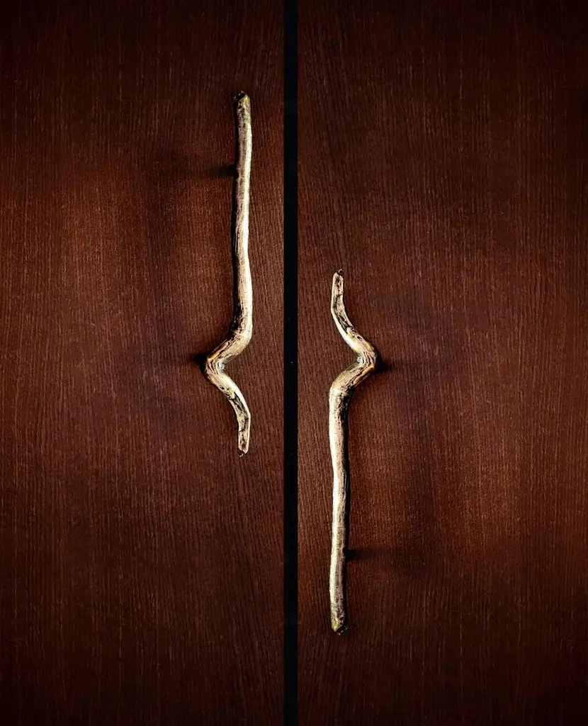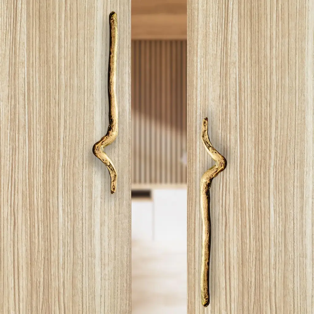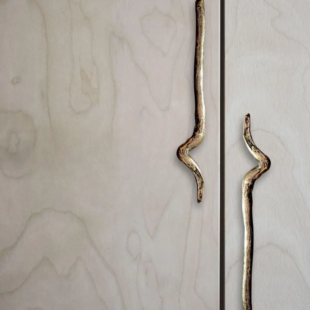 Use: Indoor or protected outdoorArtisanally crafted in a brass foundry, this door pull embodies a subtle balance between robustness and refinement. Each piece is meticulously shaped and enhanced with an aged gold patina, lending it a unique texture and depth. A bronze finish is also available upon request, offering customization to suit various design projects.Its sinuous, organic lines, combined with the noble quality of brass, elevate this door pull beyond mere functionality, transforming it into a true architectural detail. Measuring 35.5 cm in length and featuring a through-bolt fix, it ensures secure and durable installation.Sold in pairs, this door pull is designed to enhance spaces with diverse aesthetics, whether contemporary or traditional. Elegant and timeless, it reflects exceptional craftsmanship, crafted to endure through the ages with grace.note: Differences from the sample/photo provided should not be considered manufacturing defects, but rather a characteristic of the manual process, which may result in variations in color and uniformity.Brass is a living material that gradually develops a patina over the years.