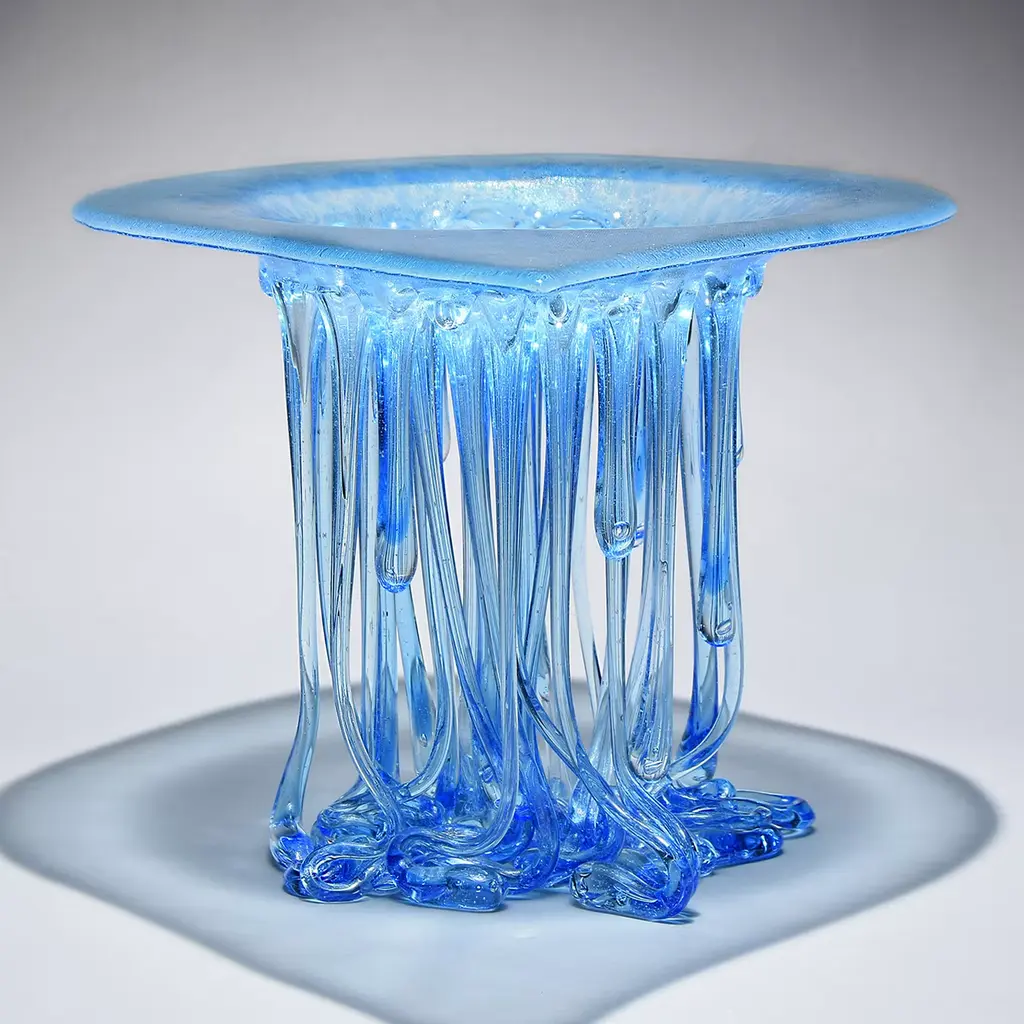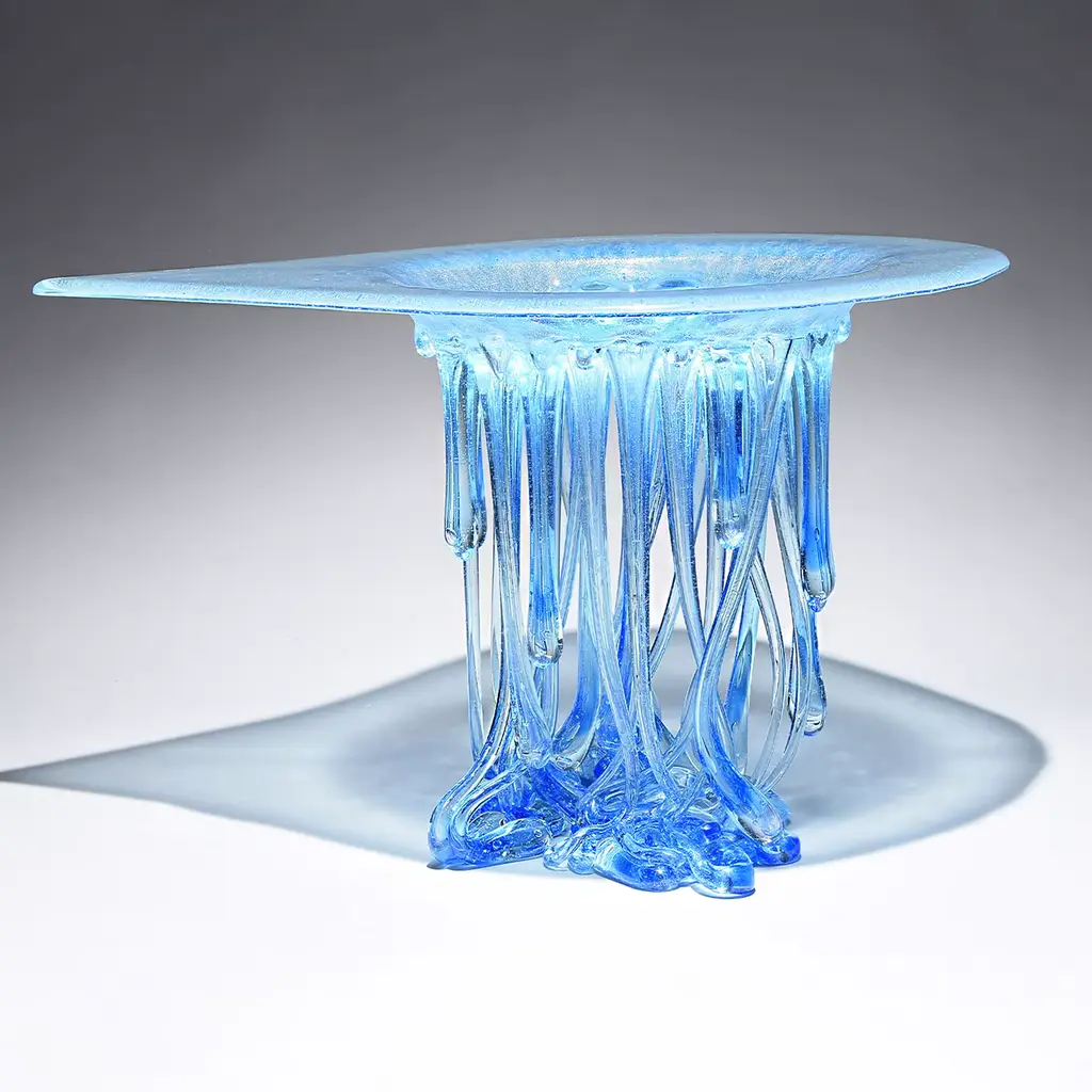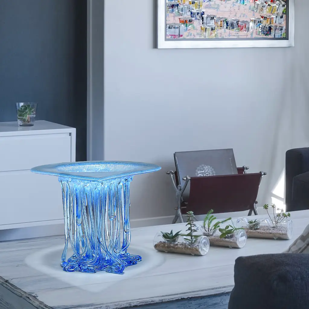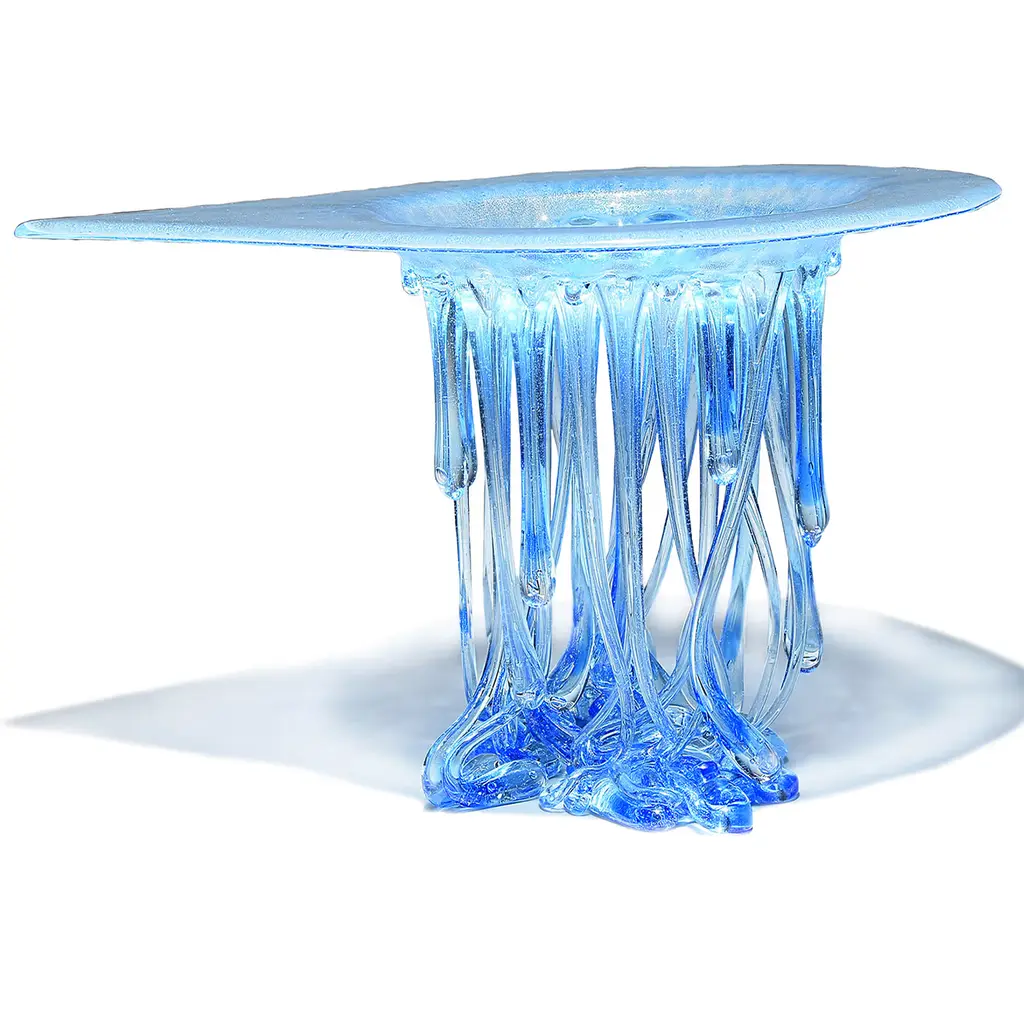 Inspired by the unmistakable, ethereal charm of jellyfish, this authentic sculpture will make a delightful statement on top of consoles or tables in modern homes. Finely handcrafted of blue Murano glass during a single fusion process at high temperature, its body is distinguished by a cascade of filaments sinuously descending and coiling at the base. The piece is delivered in an extra-safe package. Please ask the Concierge for further details.