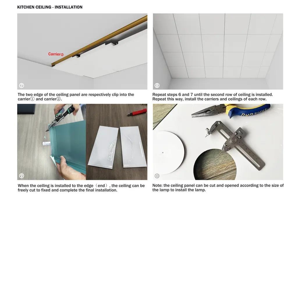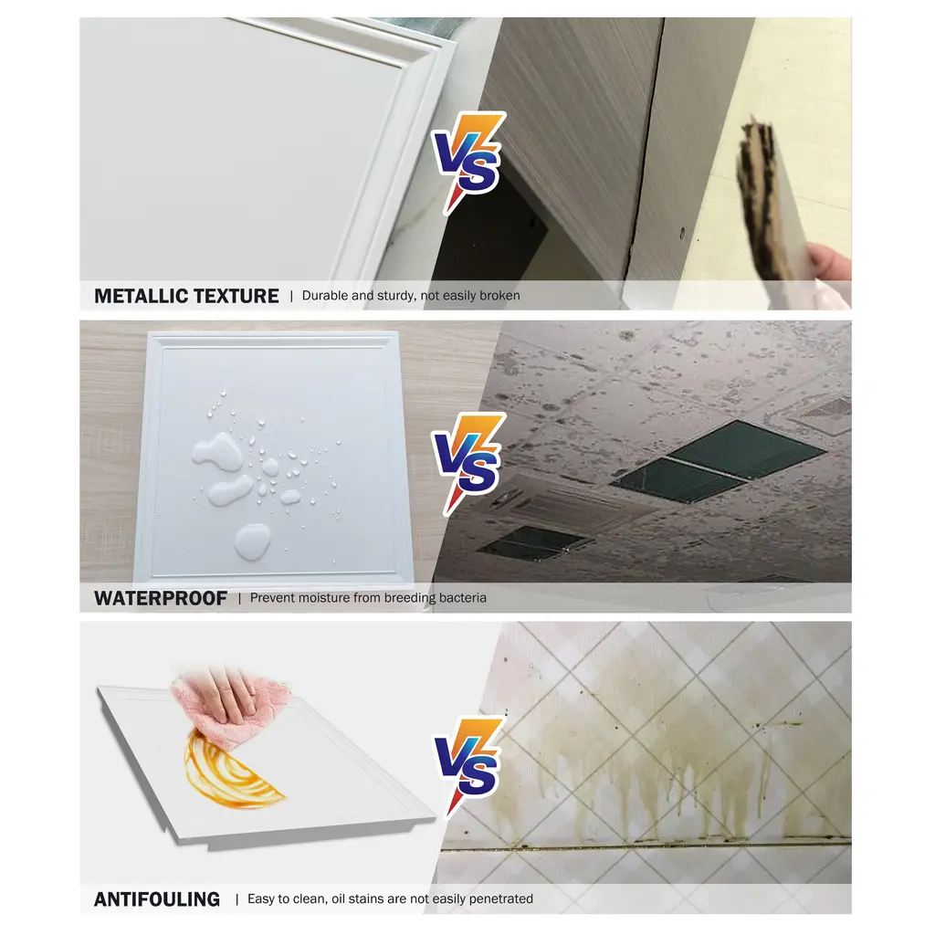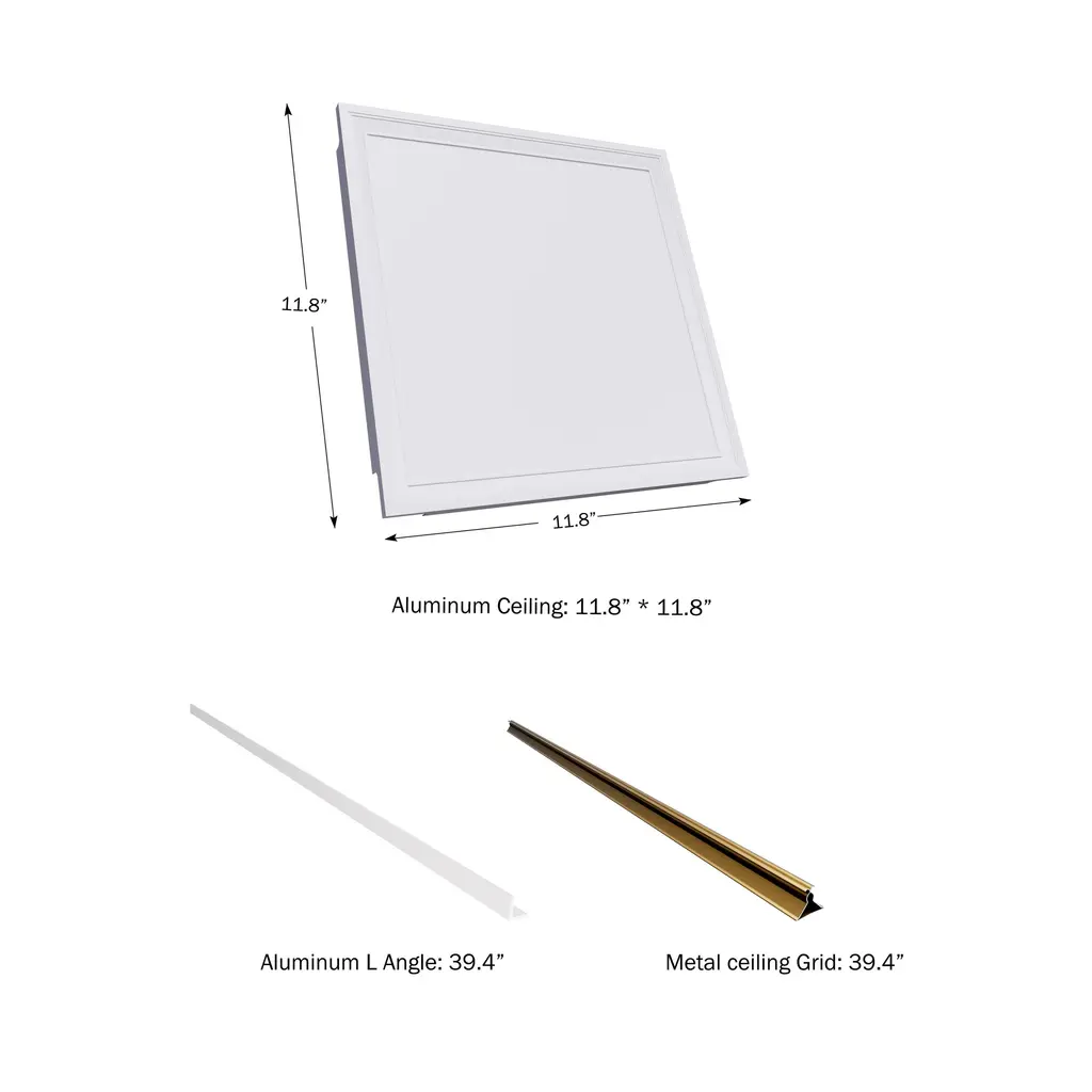 Introducing our premium ceiling, designed to transform your space with top-tier functionality and sleek aesthetics. goods make from alloy aluminum which feature for a sturdy and durable quality. expertly crafted to prevent moisture build-up, ensuring your environment remains hygienic and free from bacteria growth. Additionally, our ceiling with anti-fouling which making them easy to clean, oil and stains are no match for their protective coating, keeping your ceilings pristine with minimal effort. Elevate your interiors with a blend of modern design and superior practicality.Feature:*Sturdy and durable quality-Ceiling made from alloy aluminum, not PVC or fiber board. engineered for durability, these panels are robust and not easily broken, providing long-lasting elegance and strength.*Fireproof-Classic A Fire Rate, not easy to burn, this comparison underscores the importance of material selection based on safety and durability, particularly in environments where fire risk is a concern.*Waterproof &Moisture-resistant-Prevent moisture from humidity.*Antifouling-The Surface of the nanometer panel is smooth and delicate, not easily absorbing dust or oil stains, easy to clean. color remains durable and unchanged.*Easy install and maintain- The installation is used carrier to clip the ceiling panel and each panel can be disassembled separately, making it easier for us to maintain the electrical appliances after the ceiling.*Suitable for Multiple area-making it a perfect accent for any room such like the kitchen, hallway, bathroom, living room. Get ready to elevate your space with this chic and functional accessory.Package Includes: · 110 x Alloy Aluminum Ceiling · 9 x Aluminum L Angle· 32 x Metal ceiling GridOne carton covering 106 square feet, Ceiling size per piece is 11.8” x11.8”