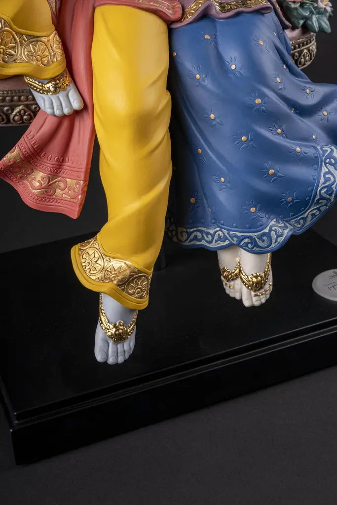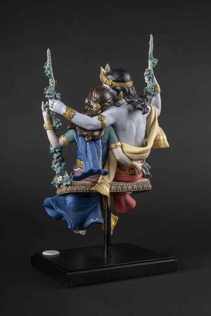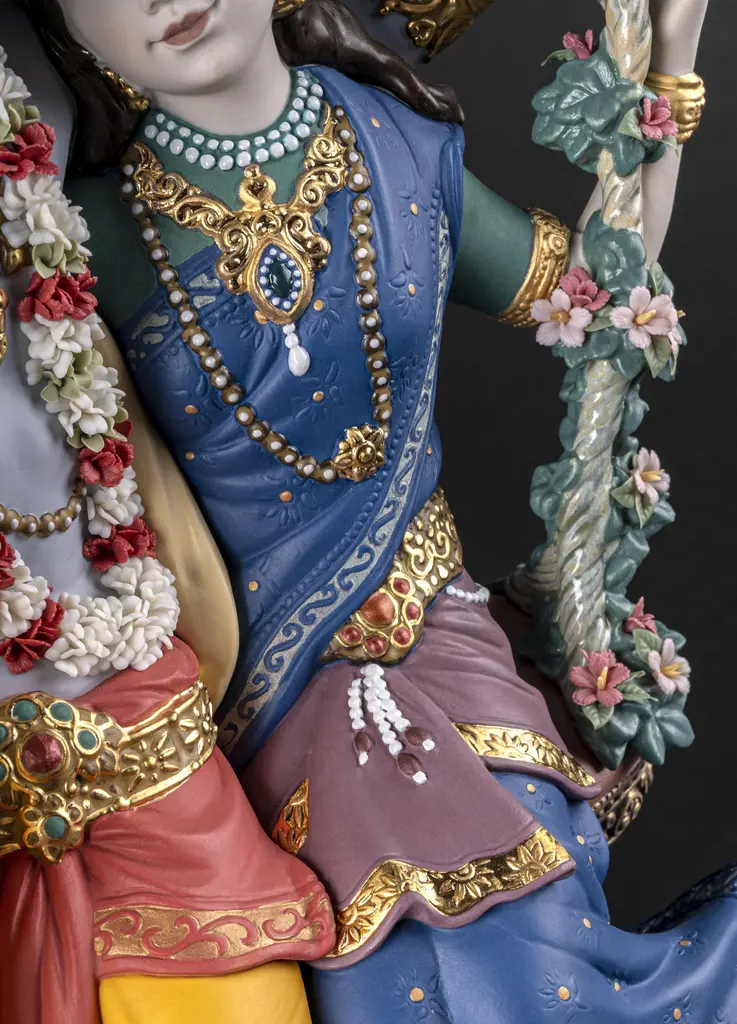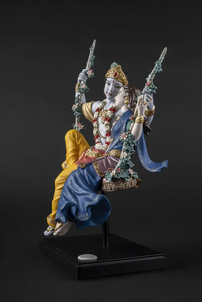 Porcelain sculpture depicting Lord Krishna, one of the most venerated gods in Hinduism, and his beloved Radha in one of the swings from the traditional Jhulan Yatra festival. The love between Radha and Krishna has given rise to some wonderful fables and their story is an important part of major Hindu celebrations like Jhulan Yatra, the festival of swings. After the summer heat, when the clouds float high in the sky, the Brajwasi celebrate the arrival of the first rains. With the onset of monsoon season, ponds and lakes fill with rainwater, lotus flowers blossom, the air is scented with a pleasant fragrance and the forests of Vrindavan are decorated with wonderful jhula, like the one on which Radha and Krishna swing in this High Porcelain creation. Following tradition, the swing is finely decorated with many flowers which, like the garland worn by Krishna, have all been handmade one by one, with over 200 petals. The costumes worn by Radha and Krishna signify their spiritual importance and Lladró artists have recreated them in minute detail. From the jewelry, etched by hand and decorated with golden and copper luster, to the embroidery of the fabrics or the decoration applied by hand combining deep rich colors like orange and blue. Radha Krishna on a Swing is a creation that seems to float in the air, suspended over a wood base. In this way, the divine couple rock back and forth forever on their legendary swing, conveying to the world their divine love.