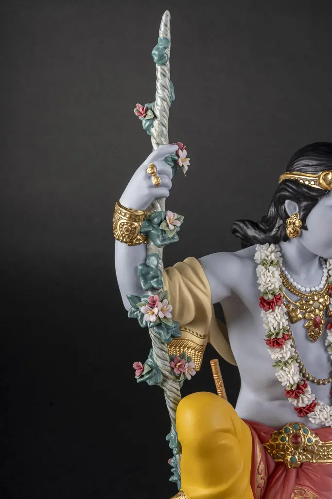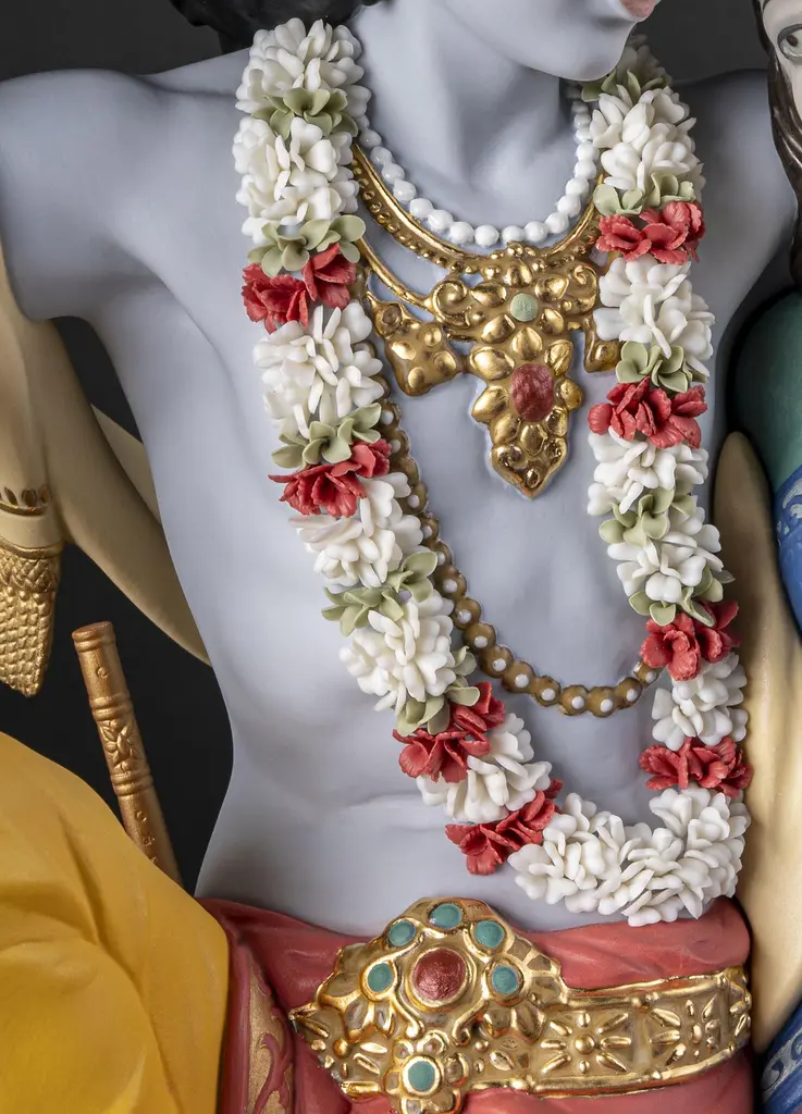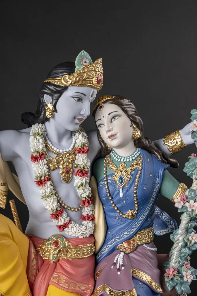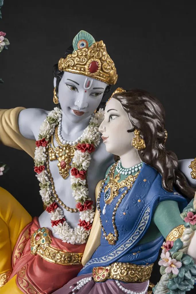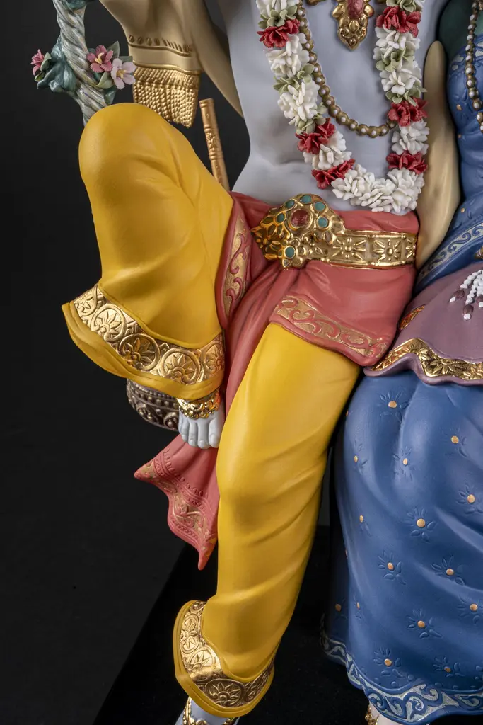 Porcelain sculpture depicting Lord Krishna, one of the most venerated gods in Hinduism, and his beloved Radha in one of the swings from the traditional Jhulan Yatra festival. The love between Radha and Krishna has given rise to some wonderful fables and their story is an important part of major Hindu celebrations like Jhulan Yatra, the festival of swings. After the summer heat, when the clouds float high in the sky, the Brajwasi celebrate the arrival of the first rains. With the onset of monsoon season, ponds and lakes fill with rainwater, lotus flowers blossom, the air is scented with a pleasant fragrance and the forests of Vrindavan are decorated with wonderful jhula, like the one on which Radha and Krishna swing in this High Porcelain creation. Following tradition, the swing is finely decorated with many flowers which, like the garland worn by Krishna, have all been handmade one by one, with over 200 petals. The costumes worn by Radha and Krishna signify their spiritual importance and Lladró artists have recreated them in minute detail. From the jewelry, etched by hand and decorated with golden and copper luster, to the embroidery of the fabrics or the decoration applied by hand combining deep rich colors like orange and blue. Radha Krishna on a Swing is a creation that seems to float in the air, suspended over a wood base. In this way, the divine couple rock back and forth forever on their legendary swing, conveying to the world their divine love.