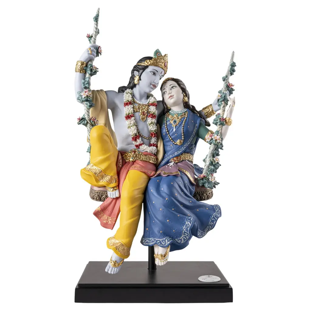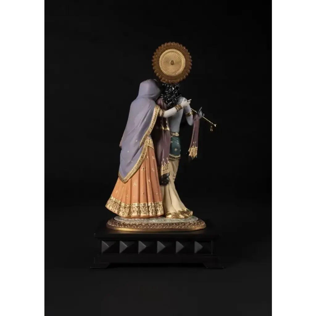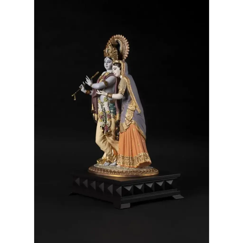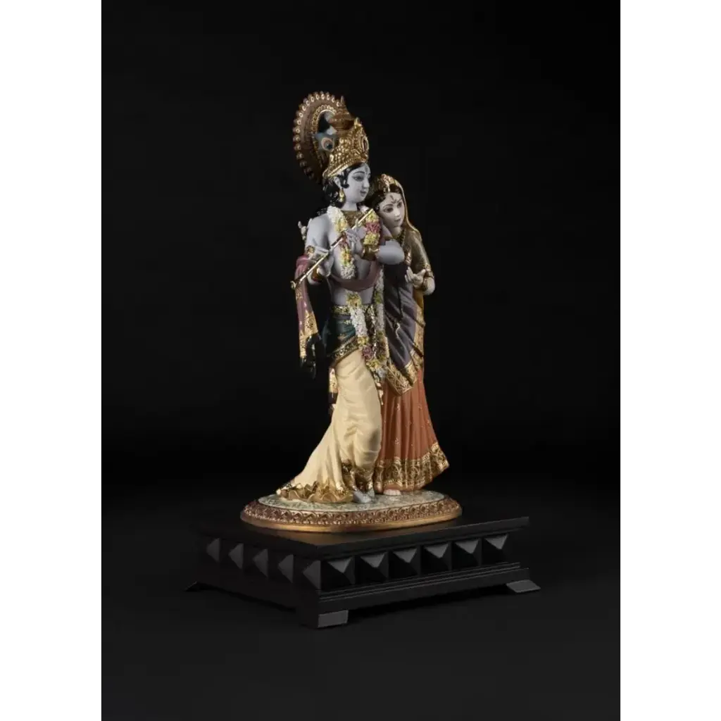 Porcelain sculpture that represents Krishna, one of the most venerated gods of Hinduism, and his wife Radha with great luxury of detail and total respect for tradition. Together they symbolize the full manifestation of the Divine. An iconic Spanish brand, Lladro is a world leader in the creation of porcelain art. Started by brothers Juan, Jose and Vicente Lladro in 1953, the ceramic figurines were initially inspired by the works of great European manufacturers like Meissen and Sevres. Over time, a unique style was forged, consisting of elongated lines, a revolutionary single-firing method, and soft pastel tones.