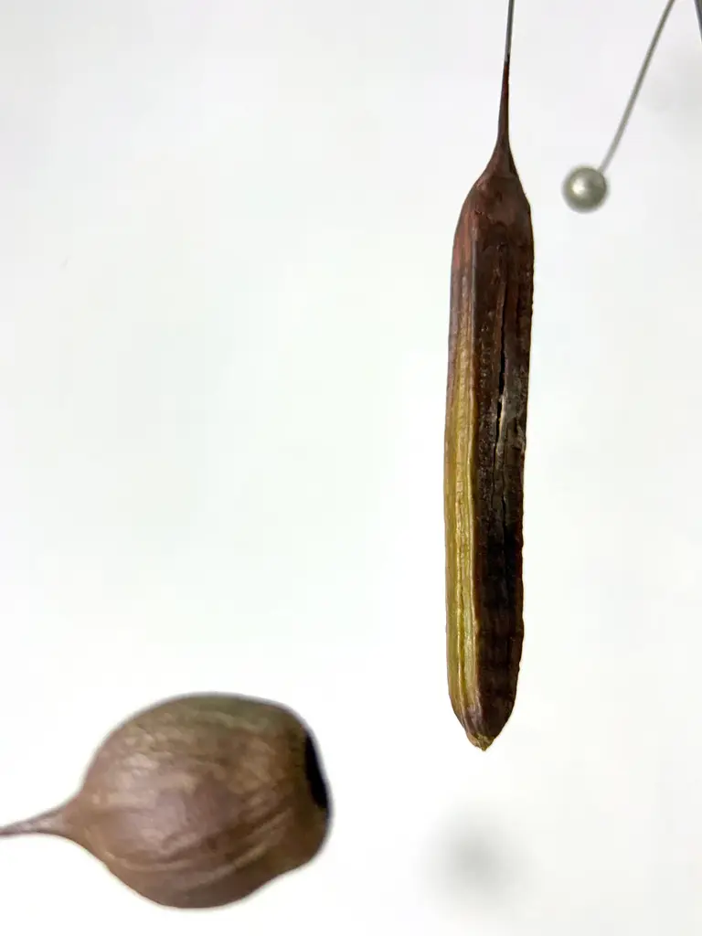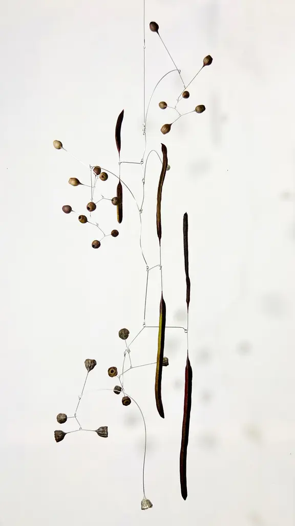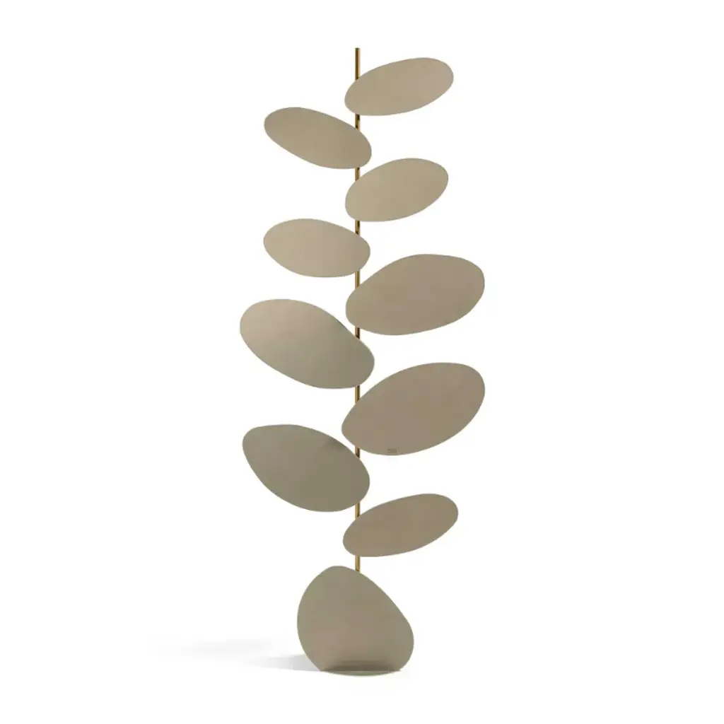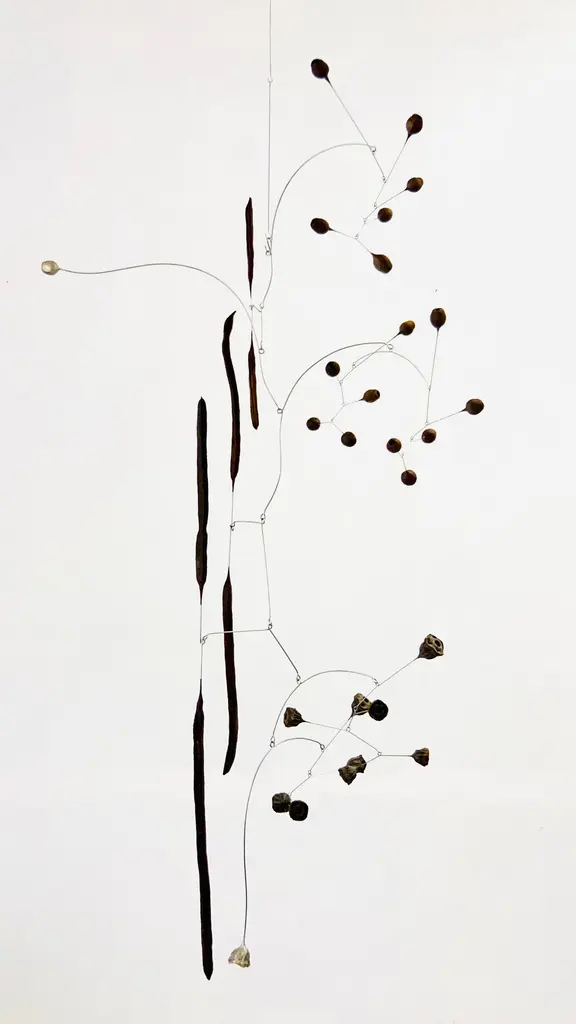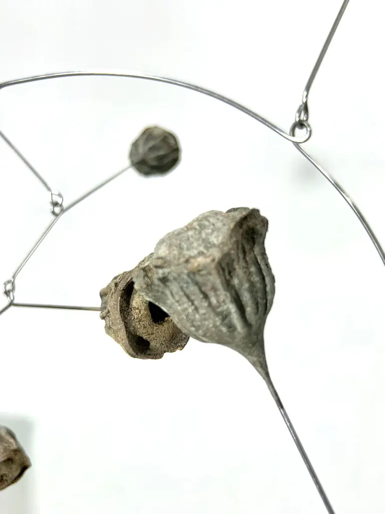 Rain Hanging Sculpture by Karolina MaszkiewiczOne Of A Kind.Dimensions: D 91.4 x W 91.4 x H 177.8 cm. Materials: White bronze, stainless steel, eucalyptus, and gold medallion seed pods.Karolina Maszkiewicz is a Polish-born American artist based in Los Angeles with a background in both fashion design and sculpture. Being a first-generation American, Karolina has found a connection with her new home by communing with nature in Southern California. Her love of the outdoors and the calm and serenity she feels when working with natural materials is rooted in her childhood in Northern Poland. Karolina's work has been featured in Artforum.