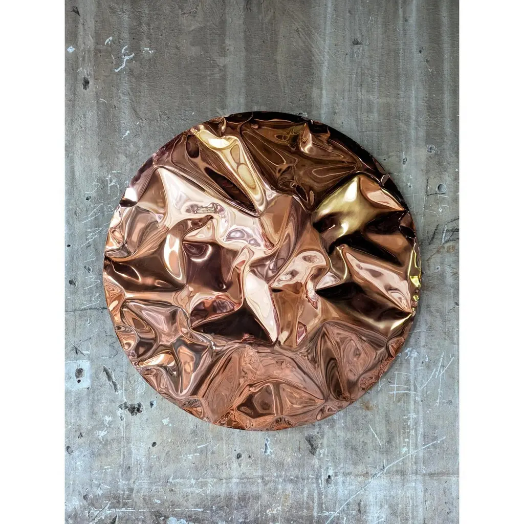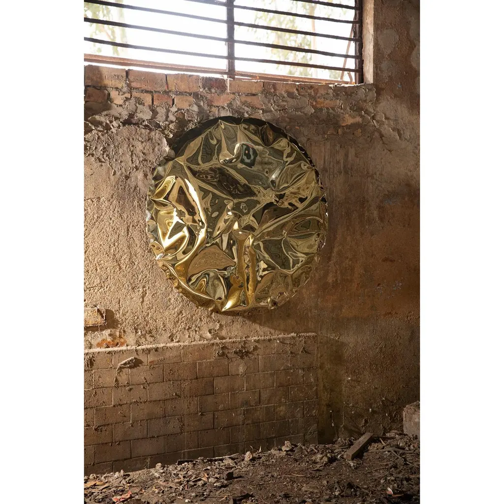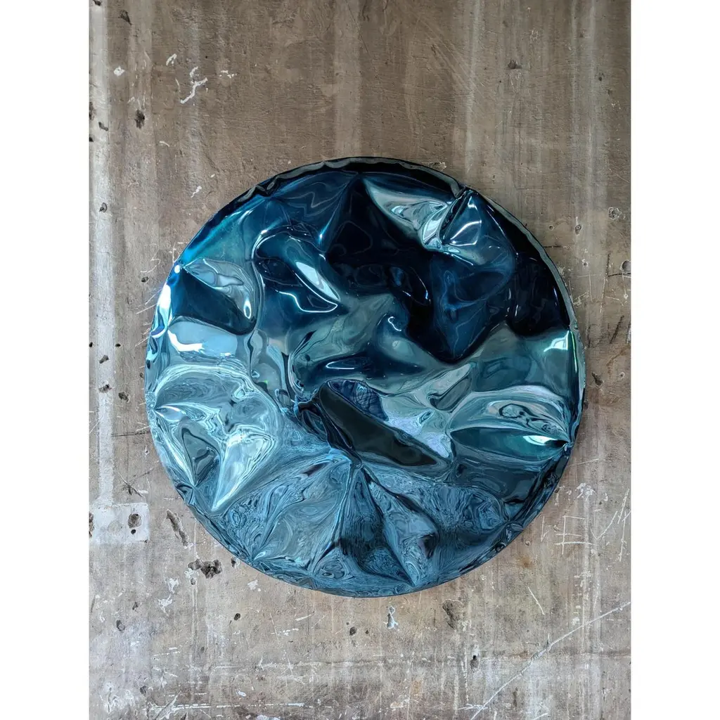 Ramé Turquoise Wall Sculpture by NITUSH AROOSHDimensions: Ø 100 cm. Materials: Stainless steel.Available in different finishes. All our lamps can be wired according to each country. If sold to the USA it will be wired for the USA for instance. Please contact us.Aroosh and Nitush Mahipal, the creative minds behind Nitush-Aroosh, were born and raised in New Delhi, India, amidst a vibrant cultural and artistic milieu. Their parents instilled in them a love of beauty and creativity from a young age, and they were fortunate to travel extensively to different parts of the world, where they were exposed to diverse forms of art, design, and architecture. From childhood, Aroosh and Nitush were captivated by the stainless steel available at their family’s factory, spending countless hours creating their toys and honing their skills. This fascination laid the foundation for their future design and art endeavors, eventually leading to the birth of Nitush-Aroosh.The Mahipal brothers use innovative techniques to create a crumbled effect on stainless steel, resulting in sculptural pieces that appear to be made of a different material altogether. Their sculptural objects, including furniture, lights, sculptures, and wall installations, are carefully crafted to invite the viewers to embark on self-discovery and introspection.The Mahipal brother’s maiden international art exhibition at the Marbella Art Fair, Spain, in November 2021 was met with great enthusiasm and acclaim. Following this, they showcased their creations in two more exhibitions in Spain in 2022, where they left an indelible mark with their extraordinary pieces.White Domus took their artistic expression to new heights in 2023 when they held their first solo exhibition at a leading art gallery in Madrid, Spain.