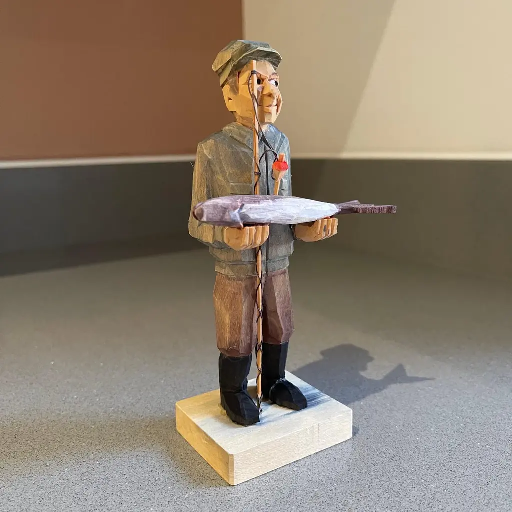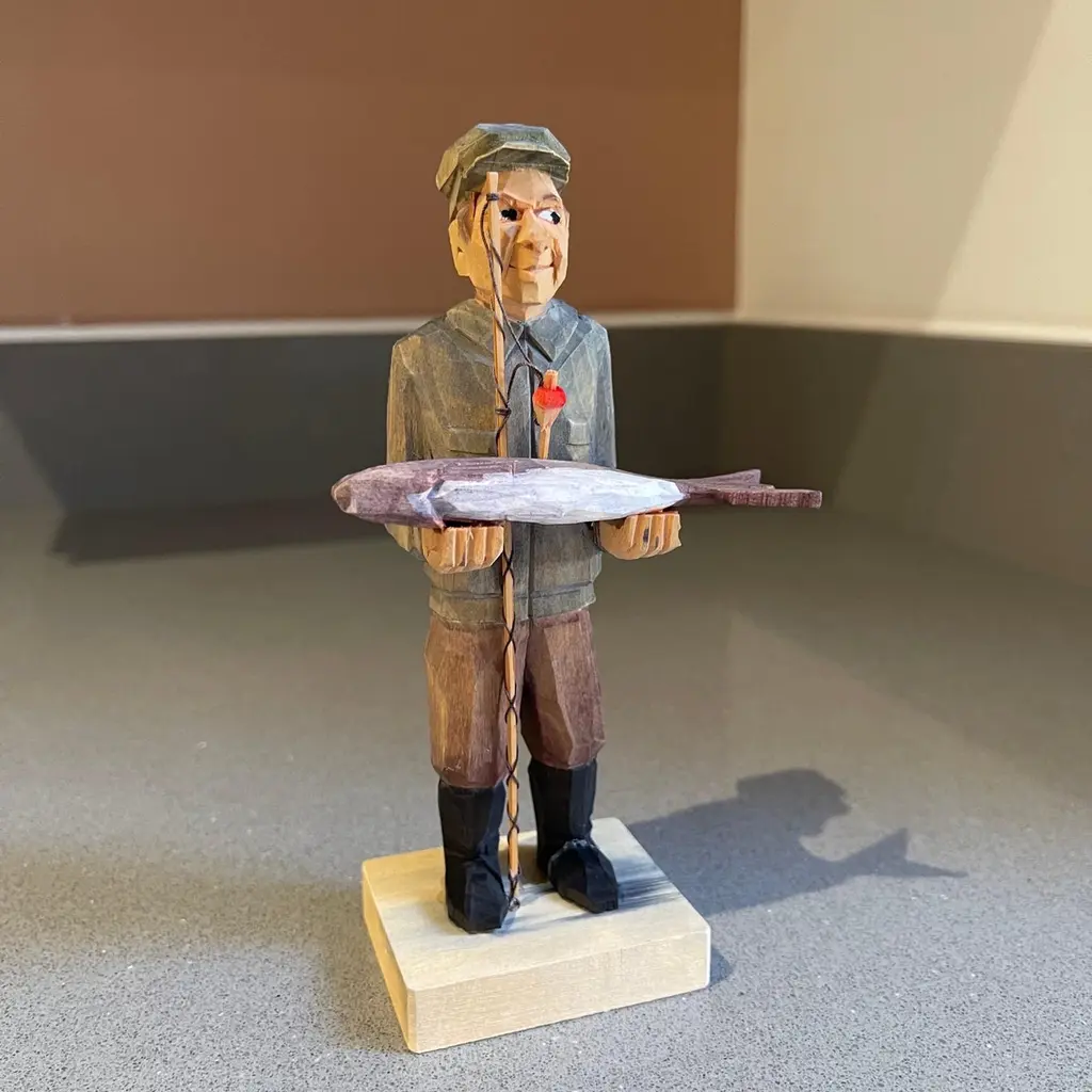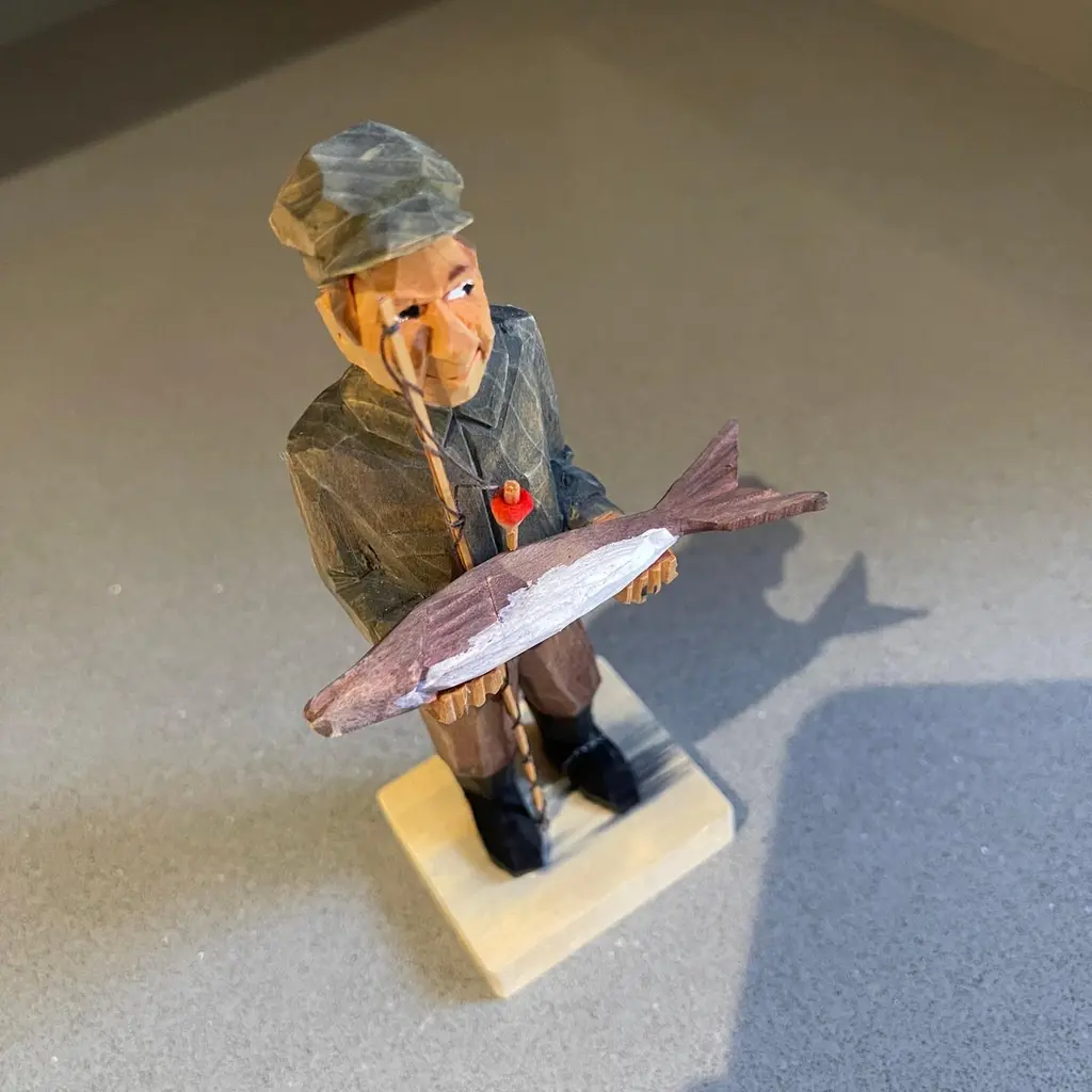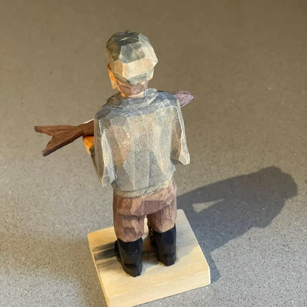 Beautifully stylized a fisherman figurine with a great balance of harmony stands, portraying the inner world's beauty through pure beauty.This Valuable rare unique art piece is a great chance to bring your office or home decor and interior an artistic characteristic.He was signed by EE 1915, one of the recognized Swedish masters of 20th-century woodcarving, most famous for the Scandinavian flat-plane style of woodcarving.EE generally carved solo figures from basswood or pine and mounted them on a base. He had a stylized execution with clean cuts, working from a single piece of wood. A highlight of Trygg's carvings is his use of vibrant paint. He often painted his character's clothing in plaid.Wooden Carving Human Sculptures A Fisher Man Antique Decorative Figurine A ManHeight 12 - 22 cm.In excellent condition.