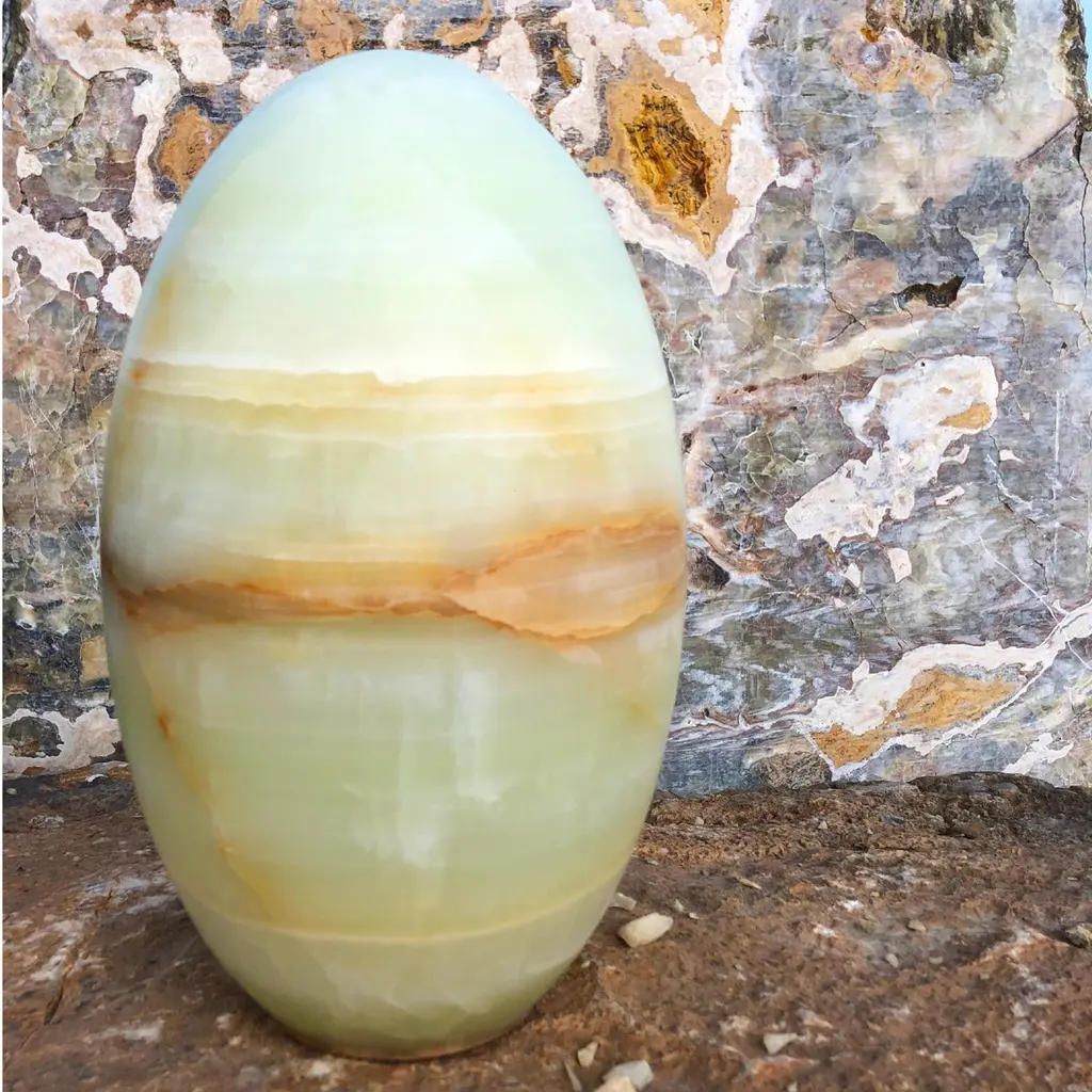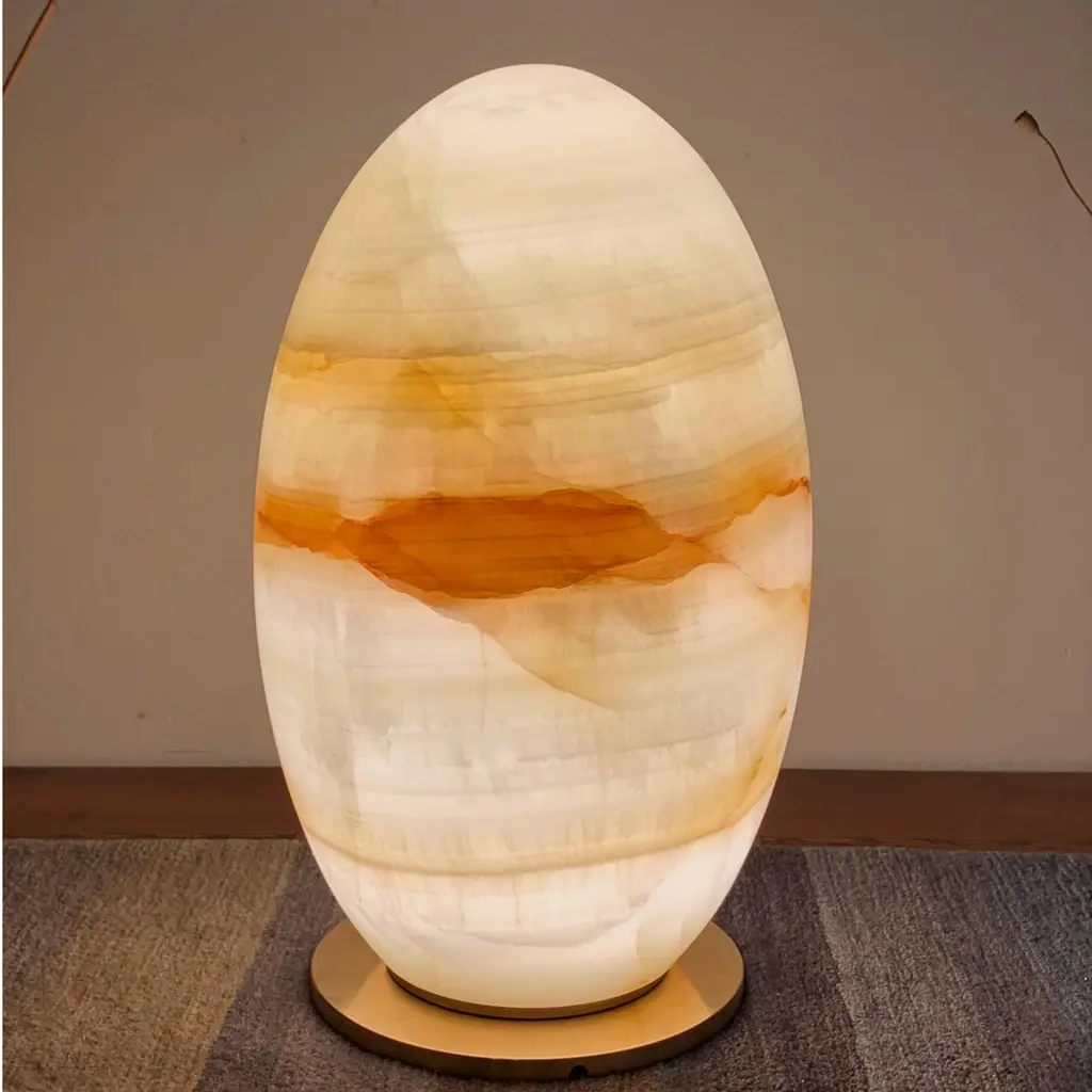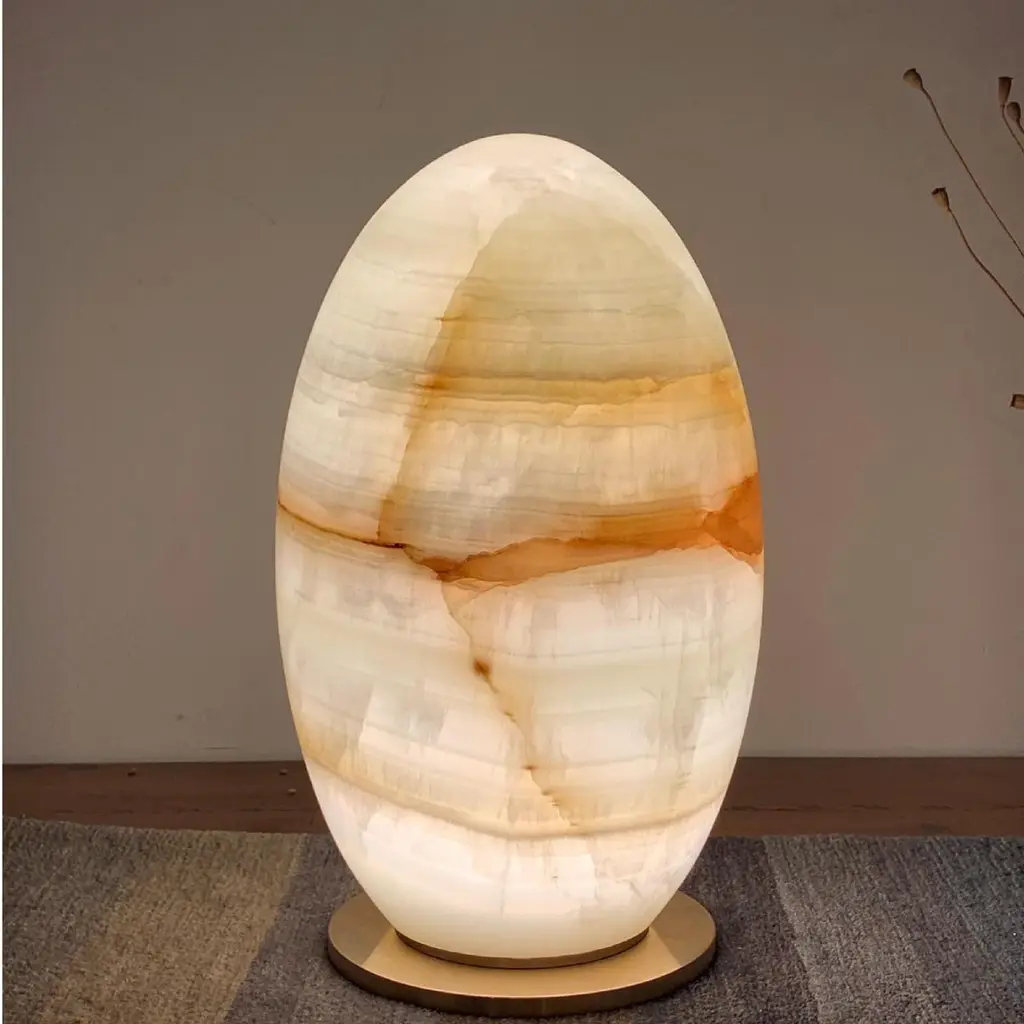 Rebirth, green onyx light sculpture by Giulia ArchimedeDimensions: D22 x H32 (Egg), D0.8 x H16 (Base) cmMaterials: Green onyx, bronzeAll our lamps can be wired according to each country. If sold to the USA it will be wired for the USA for instance.Also available: White & pink onyx, brass, steel, iron bases.It’s a light sculpture made of onyx, born to light up the walk to people who recognize not only its fictional and aesthetic value but also for who understands his energetic, soothing and vibrational.Rebirth is an egg of light, expression of a form of design that reach outto the great energetic reborn that everybody wish for and desire. After pursuing classical studies, Giulia Archimede deepens my academic career by focusing on interior and product design. Giulia Archimede concluded her bachelor’s degree with a thesis about the concept of travel, entitled “The merging of shape, matter, and light: Gmondo”. With this thesis, she set the foundations of her work to come in the following 2 years, filled with journeys and discoveries. Satisfying her curiosity by embracing numerous cultures, such as those of South Africa and Finland.