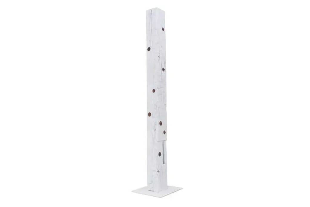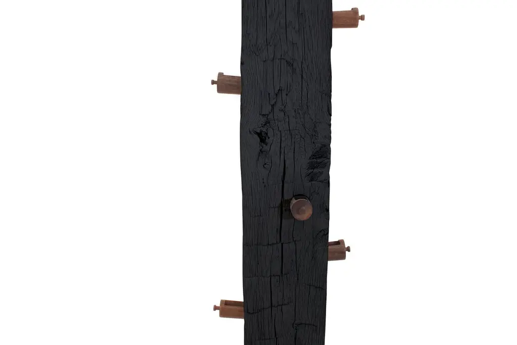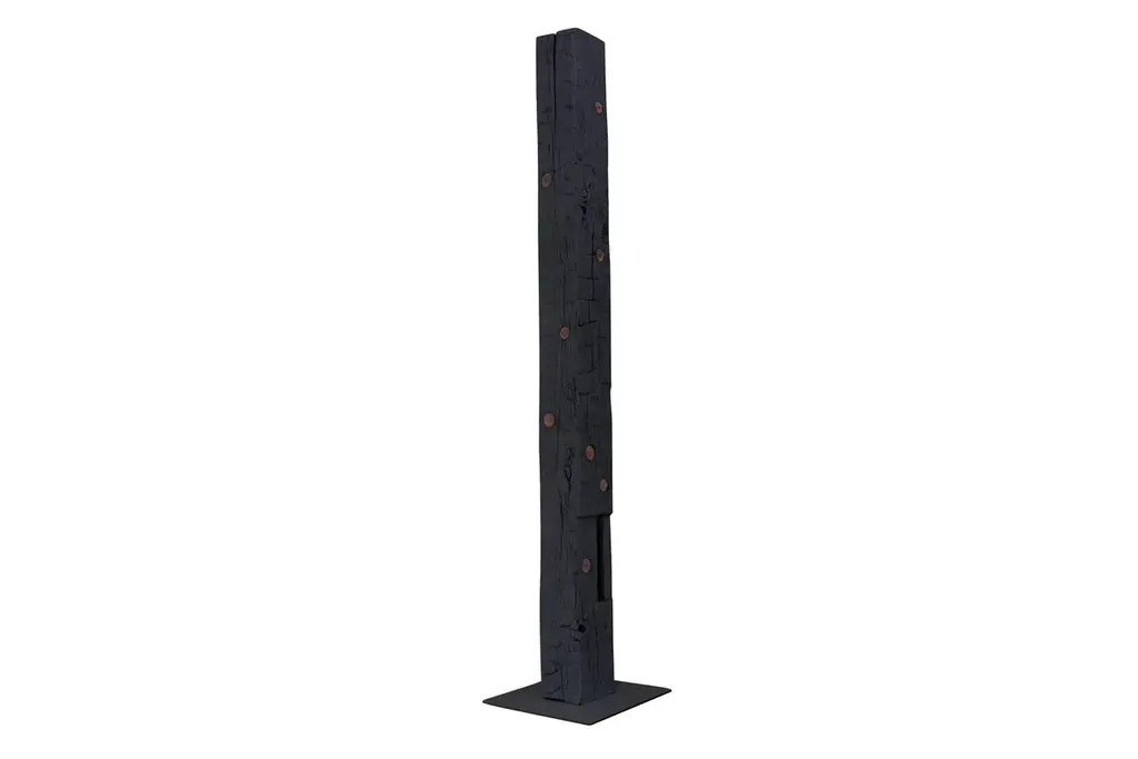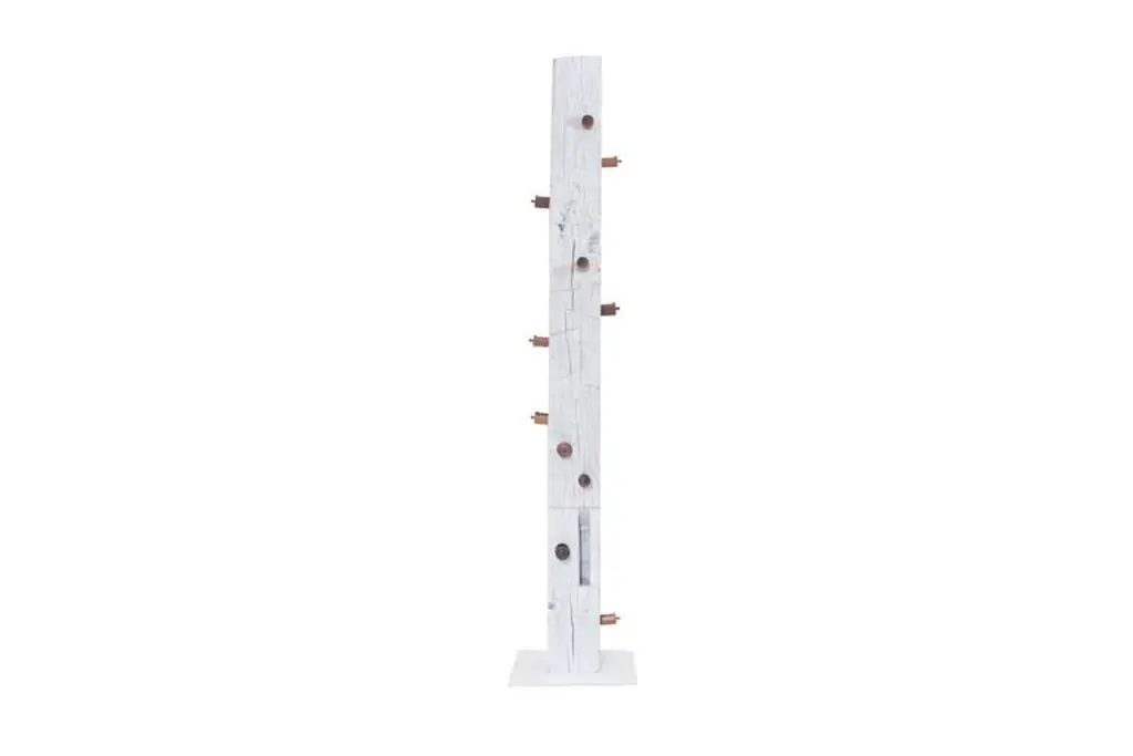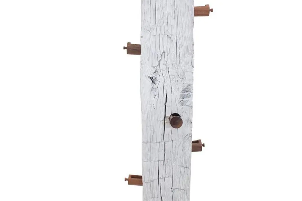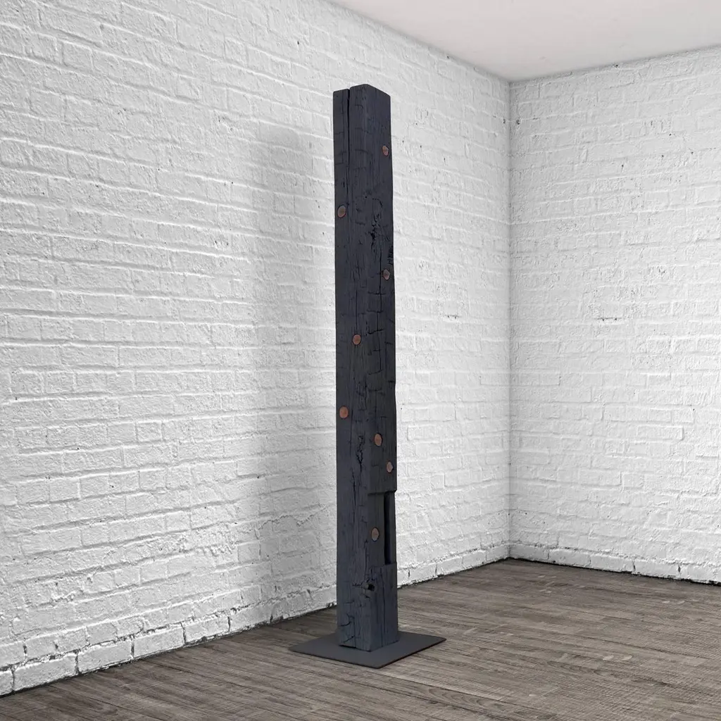 The TOTEM is an upright sculpture with storage. This structural Oak beam dating from the 1860s was salvaged from a historic Bed-Sty brownstone and features hand-hewn adze marks and hand-cut mortises. The TOTEM has 13 circular drawers that were hand-turned from shop cut-offs of walnut and sapele.As seen in images TOTEM is sprayed white, also available immediately in charred black finish measuring 8" W x 8" D x 98" H.This is a bespoke piece so custom dimensions, materials, colors and finishes (both interior and exterior) can be accommodated. Please inquire for pricing.All Stefan Rurak Studio pieces are designed and handcrafted in Brooklyn New York.