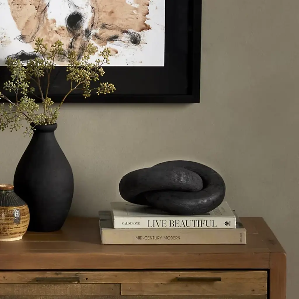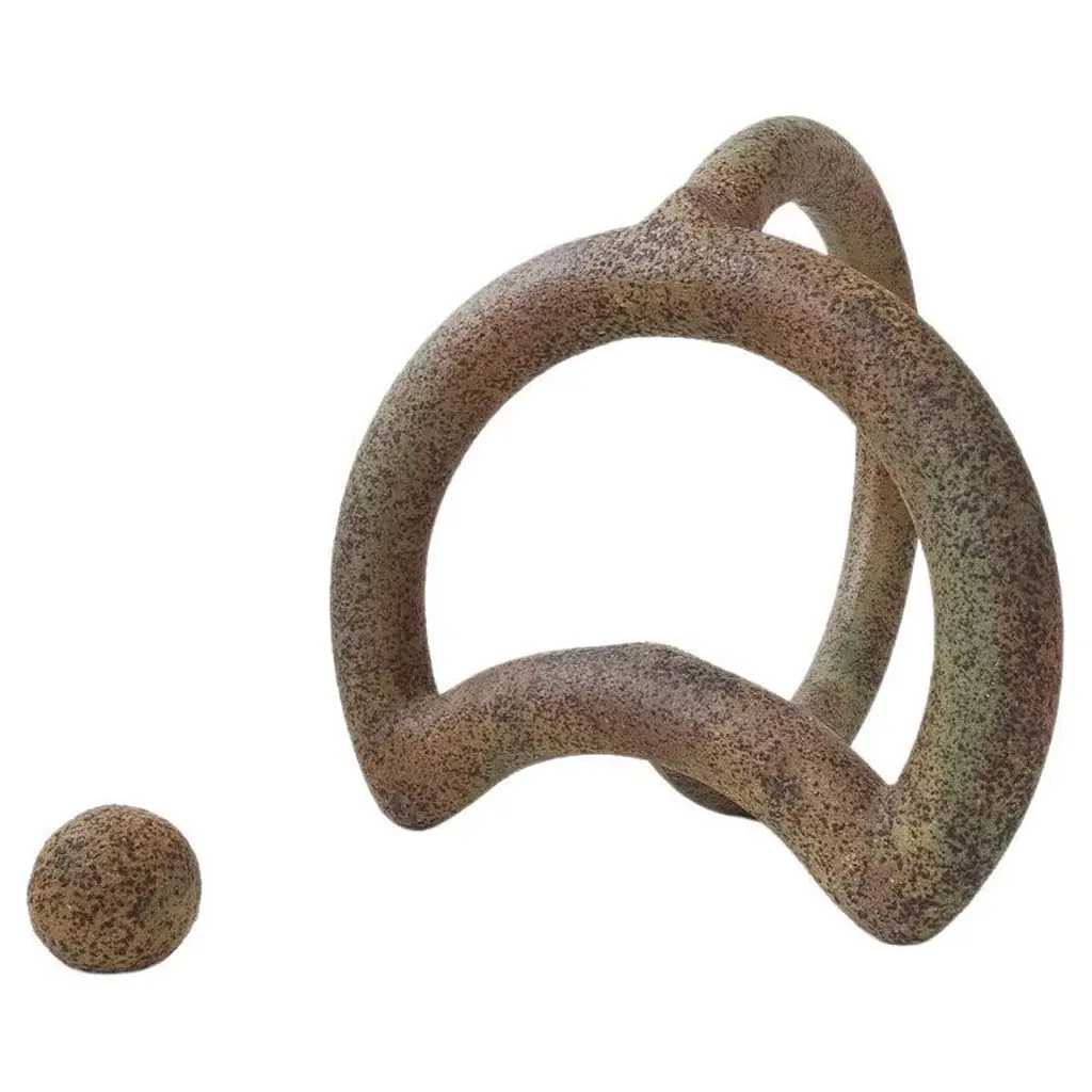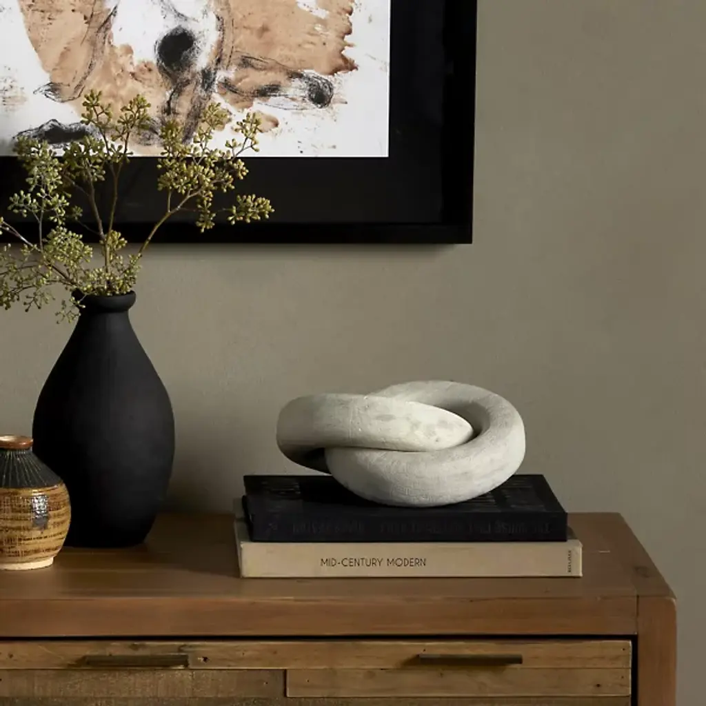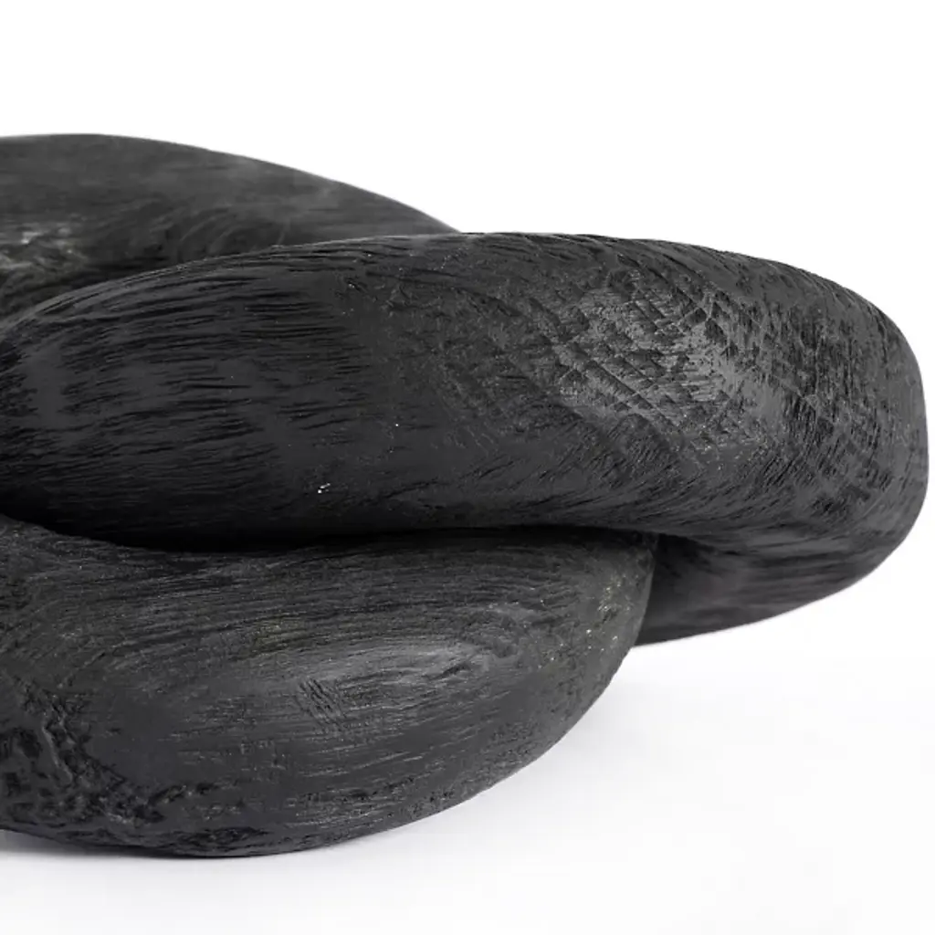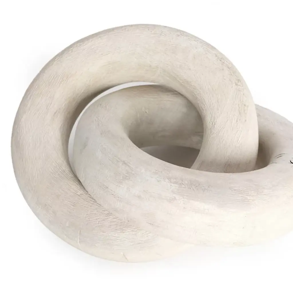 The Reclaimed Wood Knot from Four Hands reduces sculpture to its essential form through interconnected circular elements. Two hand-shaped rings link together in an eternal embrace, creating a negative space that becomes as important as the wood itself. The reclaimed timber reveals its previous life through distinctive grain patterns, splits, and character marks. This minimalist accent creates visual intrigue on mantels, shelves, or entry tables through its deceptively simple composition. Unlike mass-produced decor, each knot carries unique wood characteristics impossible to duplicate, offering both environmental consciousness and authentic materiality in a contemporary sculptural form.