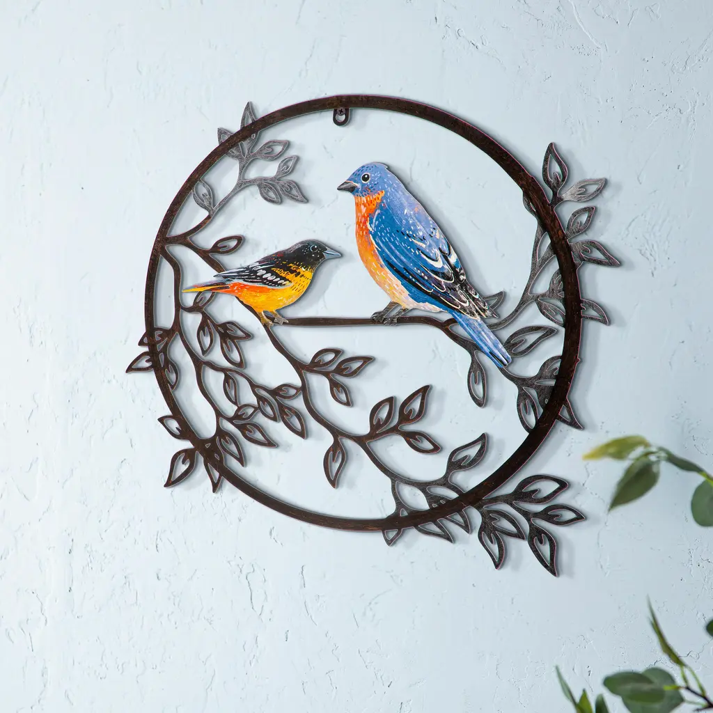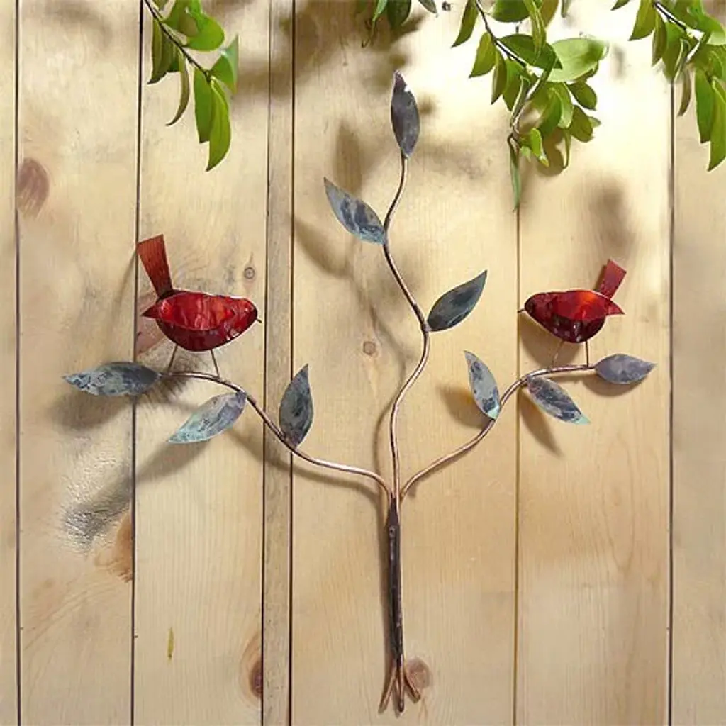 About the Red Birds Copper Wall SculptureHandmade entirely of copper in the mountains of North Carolina, two lively birds perched in a tree are provided with vivid transparent red color that blends beautifully with the torch finish and patina of the copper leaves. An application of glossy UV-resistant coating protects the copper patina, allowing the sculpture to adorn your indoor or outdoor space. Hangs securely upon two copper ring hangers. Handmade in the USAIndoor or outdoorProduct Size : approx. 18" wide x 19" tall ; weight = 1 lb. Material : copper