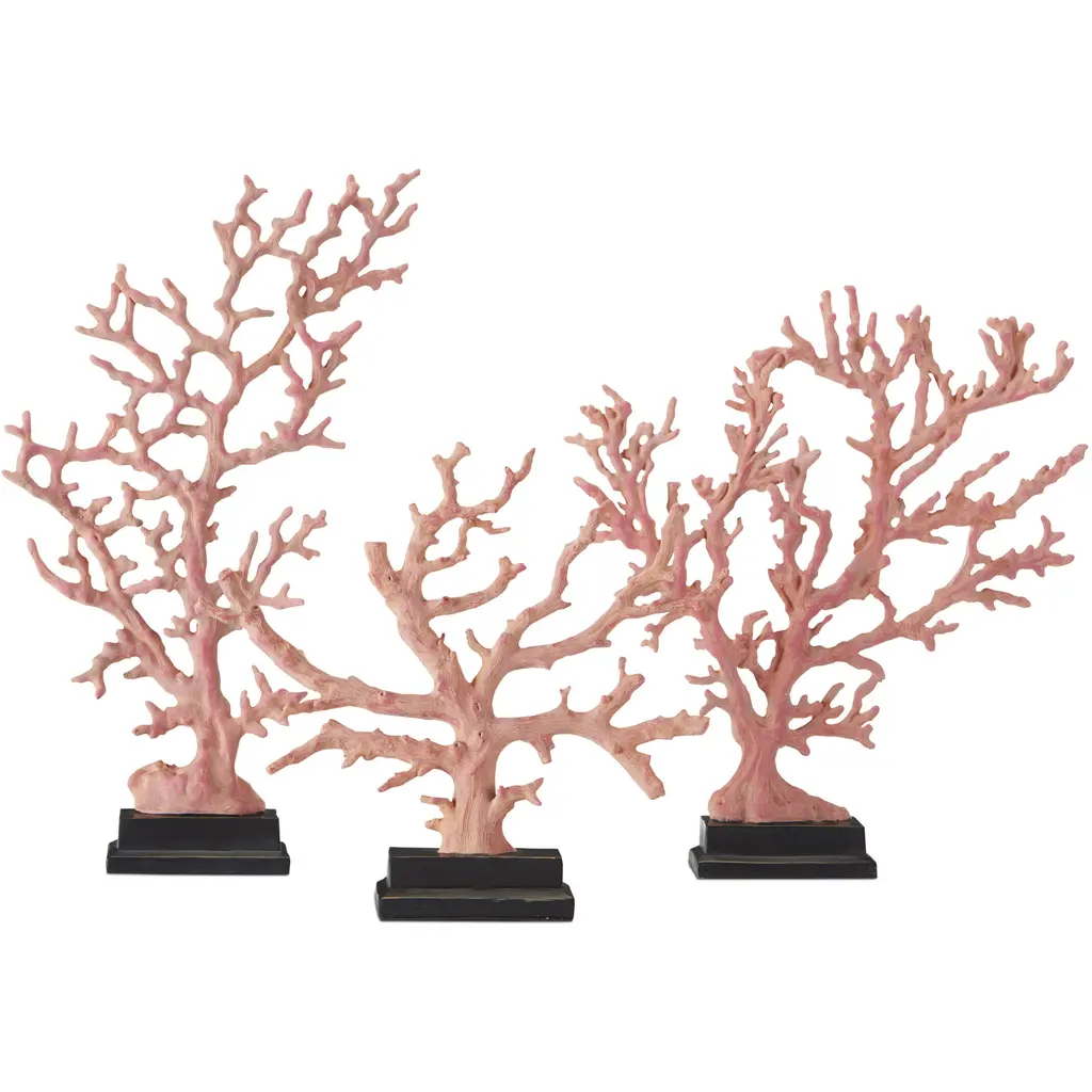 Made of composite, the Red Coral Branches Large Set fools the eye into thinking they are composed of the natural materials found at the bottom of the sea. Though they appear to be placed on stacked wood stands, these bases are made of composite as well. The red sculptures have two artisans to thank for the feeling of authenticity: the mold maker, who is central to the work; and the painter, who hand-paints the pieces to create the illusion that they are from nature. We also offer a smaller set of coral sculptures in a brighter red.