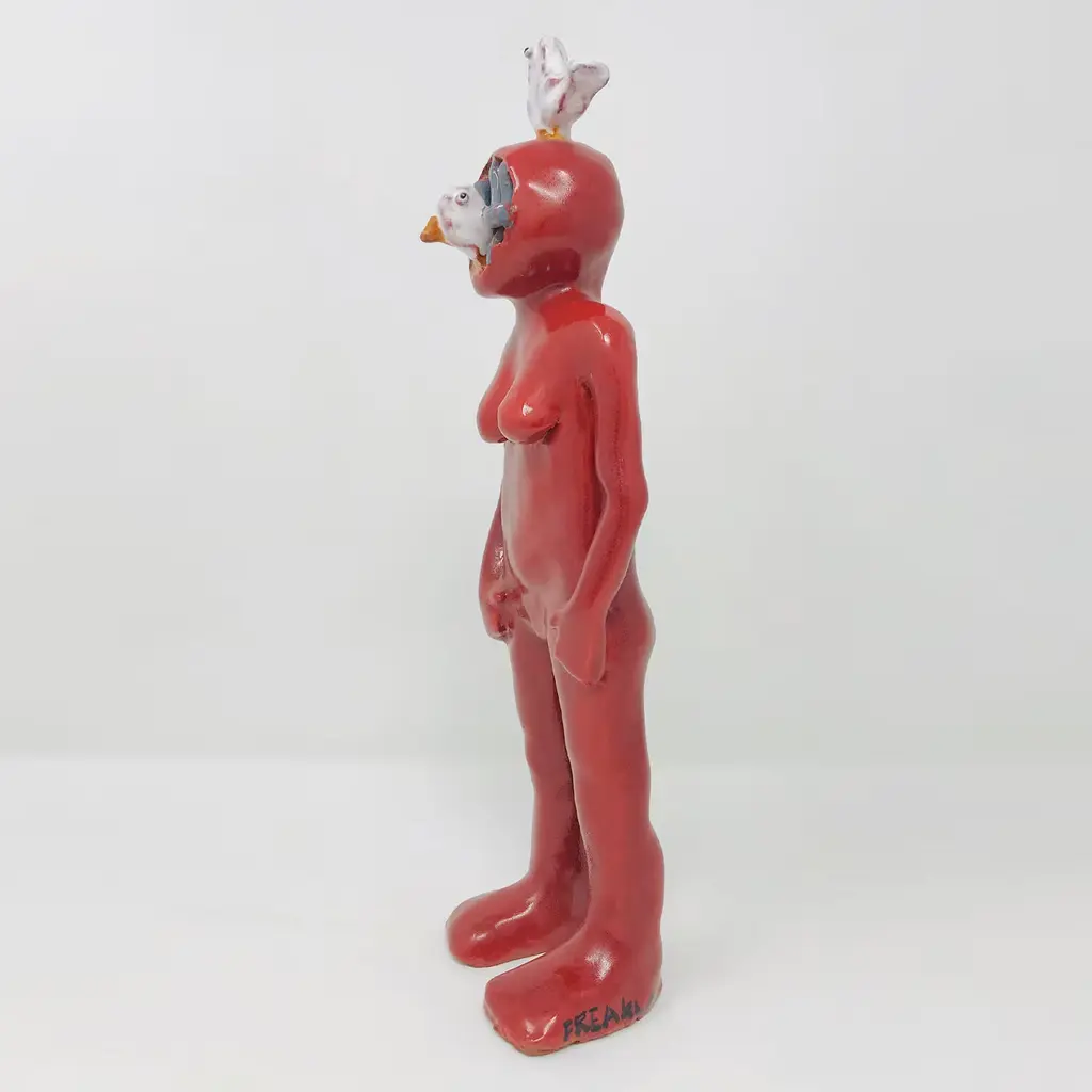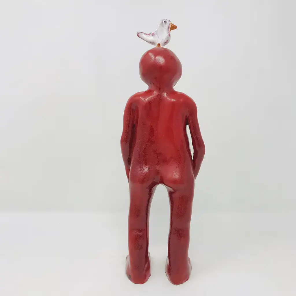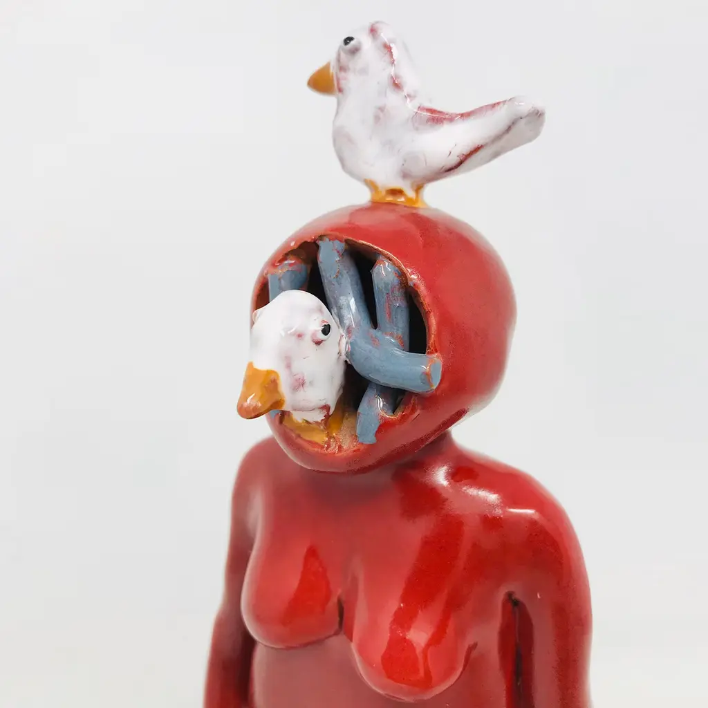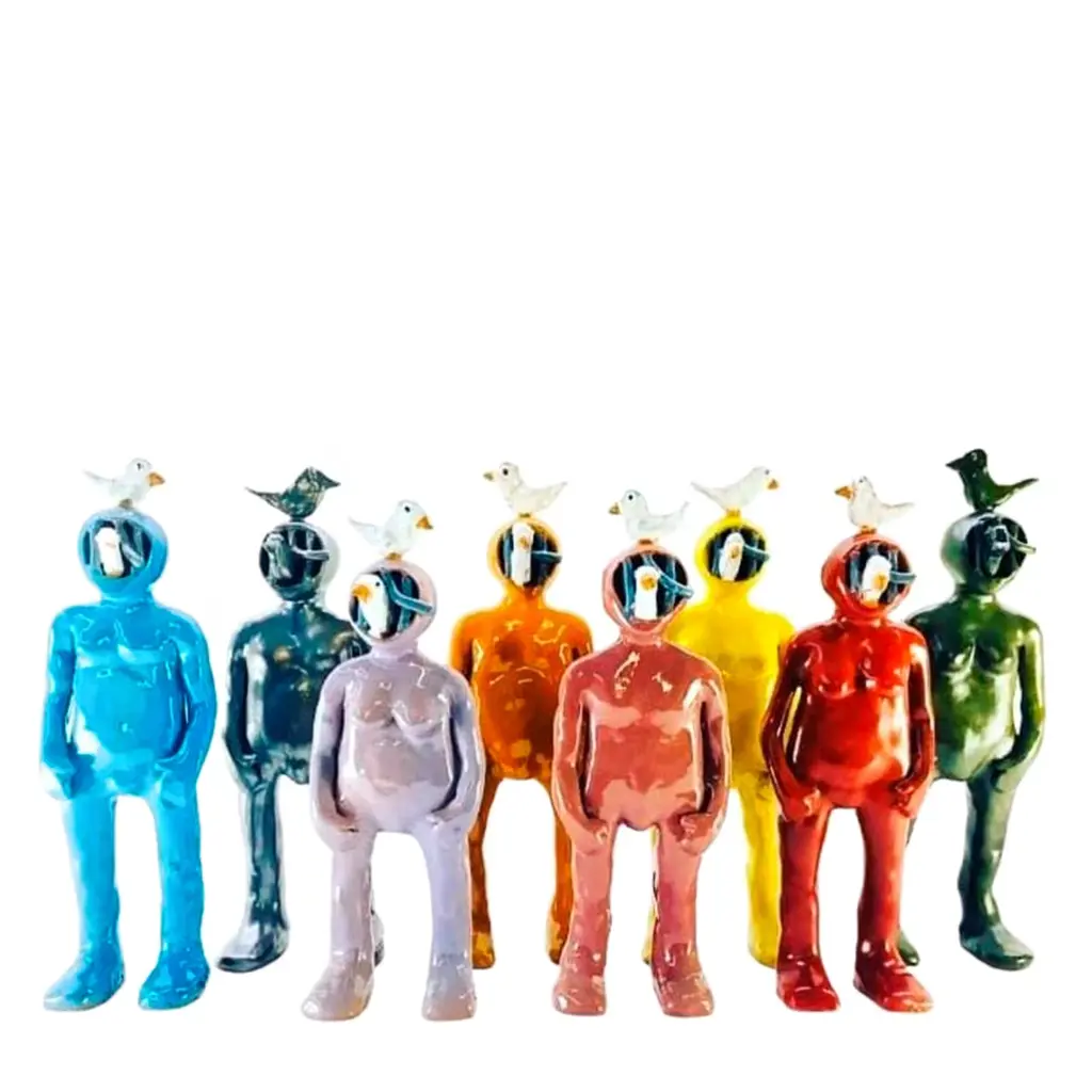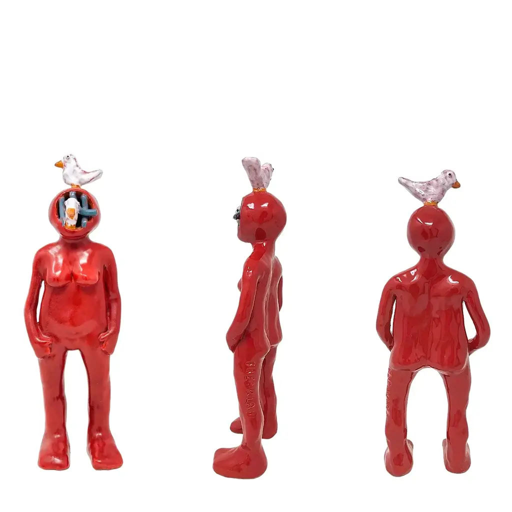 This visionary majolica sculpture from the Big Humans Collection flaunts the anthropomorphic design of a deep-sea diver with seagulls, one perched onto their head and the other peeking out from under the mask. Carefully hand-molded, finished, and hollowed out to avoid breaking in the kiln, the piece is first fired at 960°C, consequently glazed, and fired for a final time at 930°C. Slight differences from the pictured item are proof of its artisan quality. Please consult the Concierge for customization options.